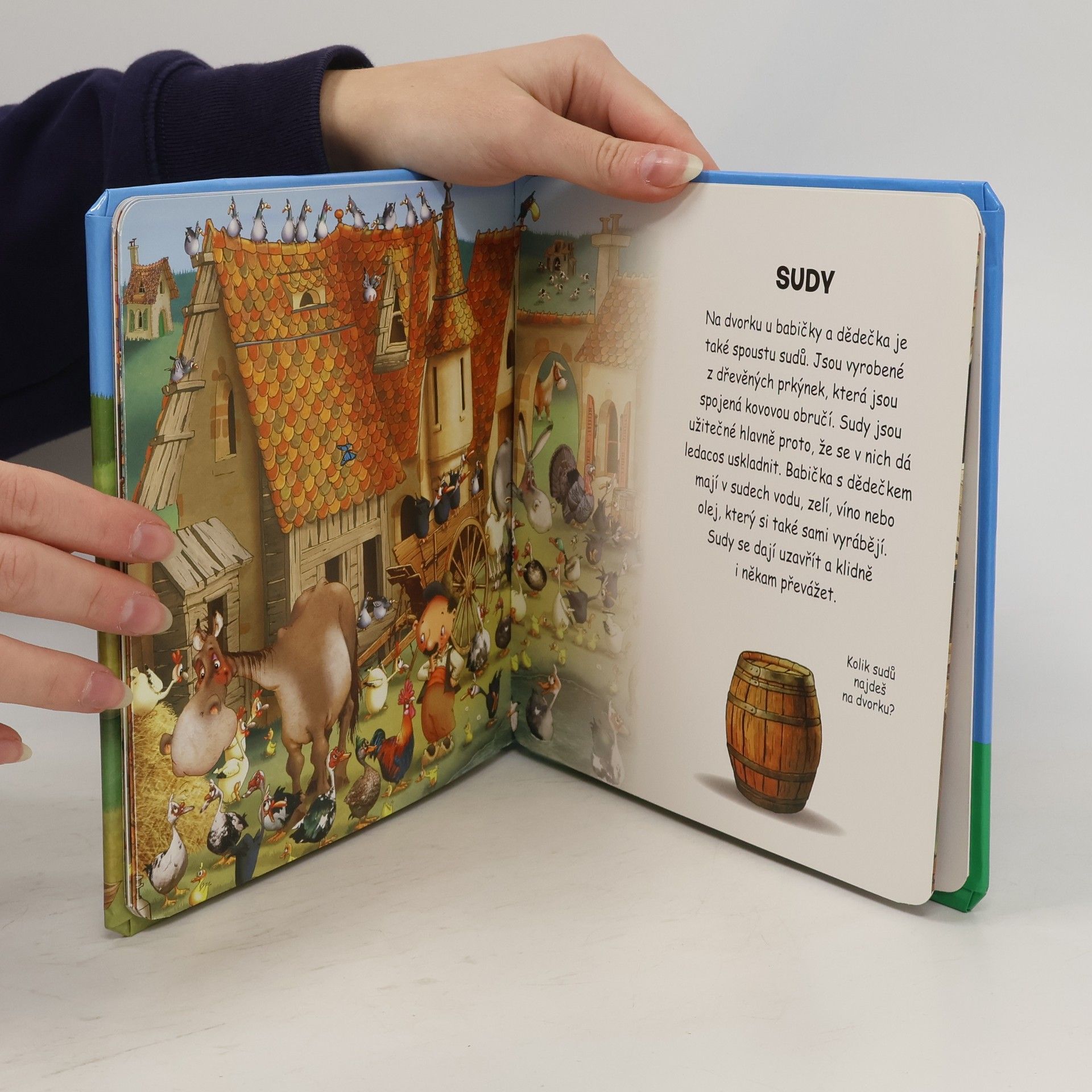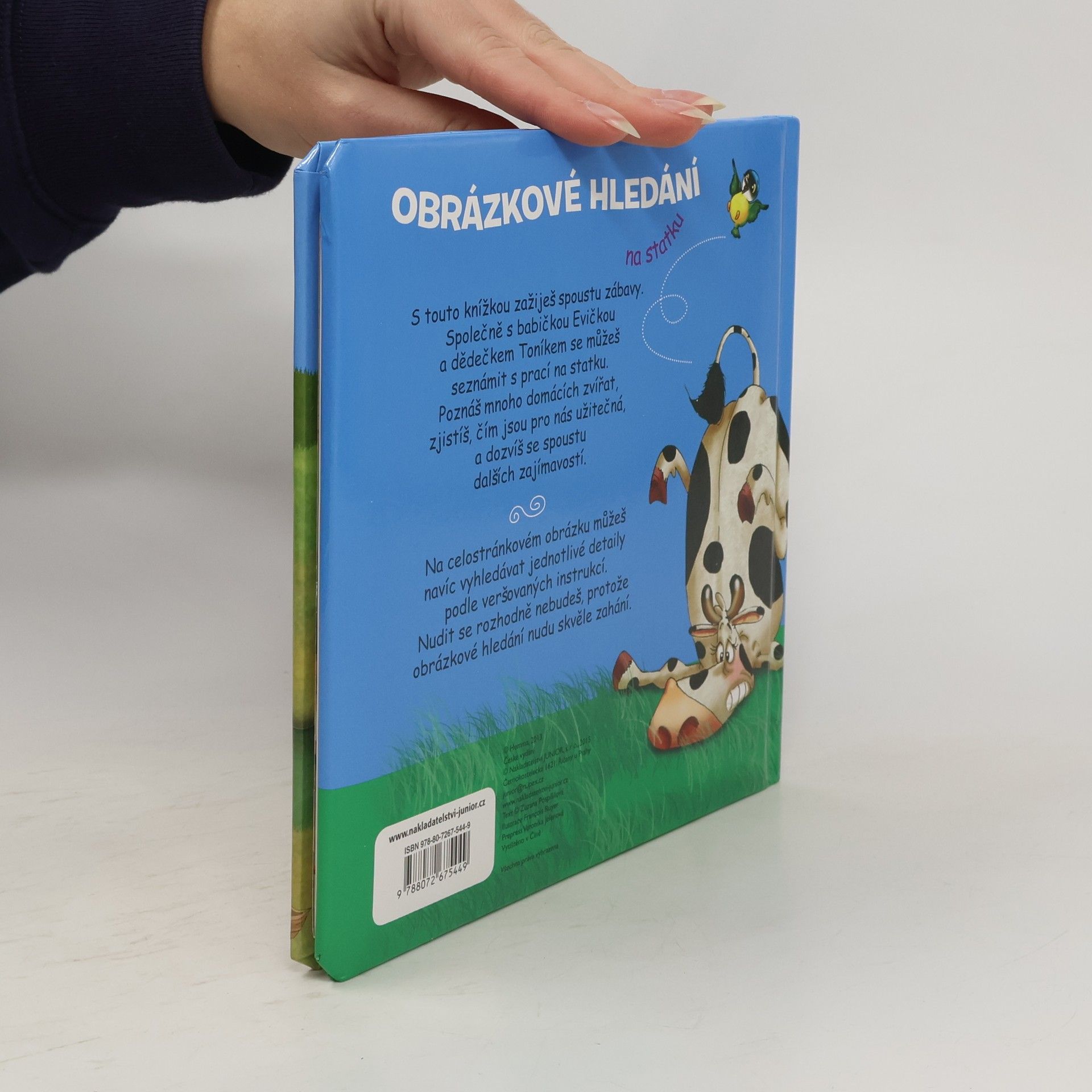S touto knížkou zažiješ spoustu zábavy. Společně s babičkou Evičkou a dědečkem Toníkem se můžeš seznámit s prací na statku. Poznáš mnoho zvířat, zjistíš čím jsou pro nás užitečná, a dozvíš se spoustu dalších zajímavostí. Na celostránkovém obrázku můžeš navíc vyhledávat jednotlivé detaily podle veršovaných instrukcí. Nudit se rozhodně nebudeš, protože obrzkové hledání nudu skvěle záhání.
