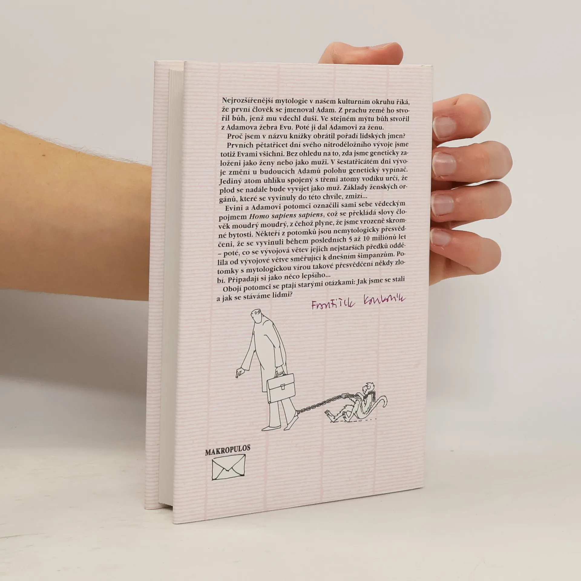 Z úvodu: Nejrozšířenější mytologie v našem kulturním okruhu říká, že první člověk se jmenoval Adam. Z prachu země ho stvořil bůh, jenž mu vdechl duši. Ve stejném mýtu bůh stvořil z Adamova žebra Evu. Poté ji dal Adamovi za ženu. Proč jsem v názvu knížky obrátil pořadí lidských jmen? Prvních pětatřicet dní svého nitroděložního vývoje jsme totiž Evami všichni. Bez ohledu na to, zda jsme geneticky založeni jako ženy nebo jako muži. V šestatřicátém dni vývoje změní u budoucích Adamů polohu genetický vypínač. Jediný atom uhlíku spojený s třemi atomy vodíku určí, že plod se nadále bude vyvíjet jako muž. Základy ženských orgánů, které se vyvinuly do této chvíle, zmizí... Evini a Adamovi potomci označili sami sebe vědeckým pojmem Homo sapiens sapiens, což se překládá slovy člověk moudrý moudrý, z čehož plyne, že jsme vrozeně skromné bytosti. Někteří z potomků jsou nemytologicky přesvědčení, že se vyvinuli během posledních 5 až 10 miliónů let - poté, co se vývojová větev jejich nejstarších předků oddělila od vývojové větve směřující k dnešním šimpanzům. Potomky s mytologickou vírou takové přesvědčení někdy zlobí. Připadají si jako něco lepšího... Obojí potomci se ptají starými otázkami: Jak jsme se stali a jak se stáváme lidmi? autor