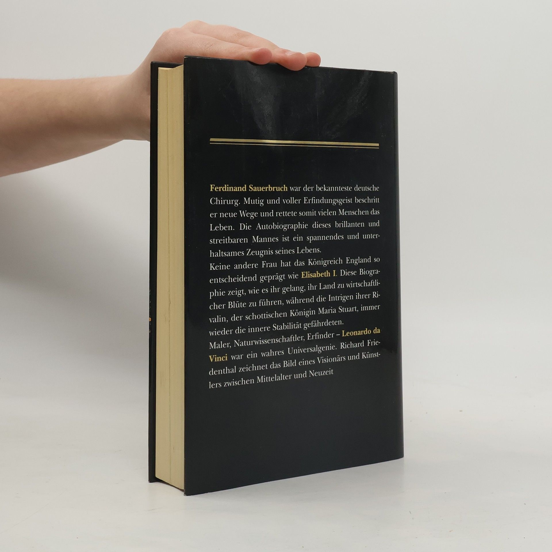 Autor/in: Ferdinand Sauerbruch / Elizabeth Jenkins / Richard Friedenthal Titel: Menschen, die die Welt verändern: Ferdinand Sauerbruch / Elisabeth I / Leonardo Da Vinci; ISBN: 9783870704384 (früher: 3870704381) Seiten: 447 Gewicht: 760 g Verlag: Reader's Digest Erschienen: 2000 Einband: Hardcover Sprache: Deutsch Zustand: sehr gut leichte Gebrauchsspuren Kurzinfo: Ferdinand Sauerbruch: Das war mein Leben Elizabeth Jenkins: Gloriana - Königin Elisabeth I von England Richard Friedenthal: Leonardo Da Vinci