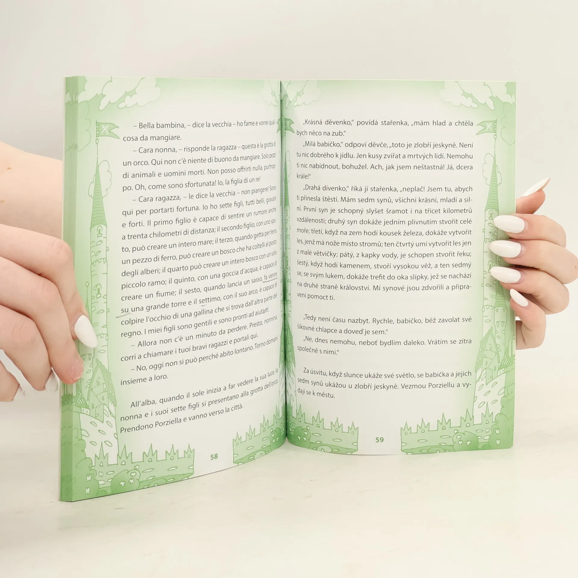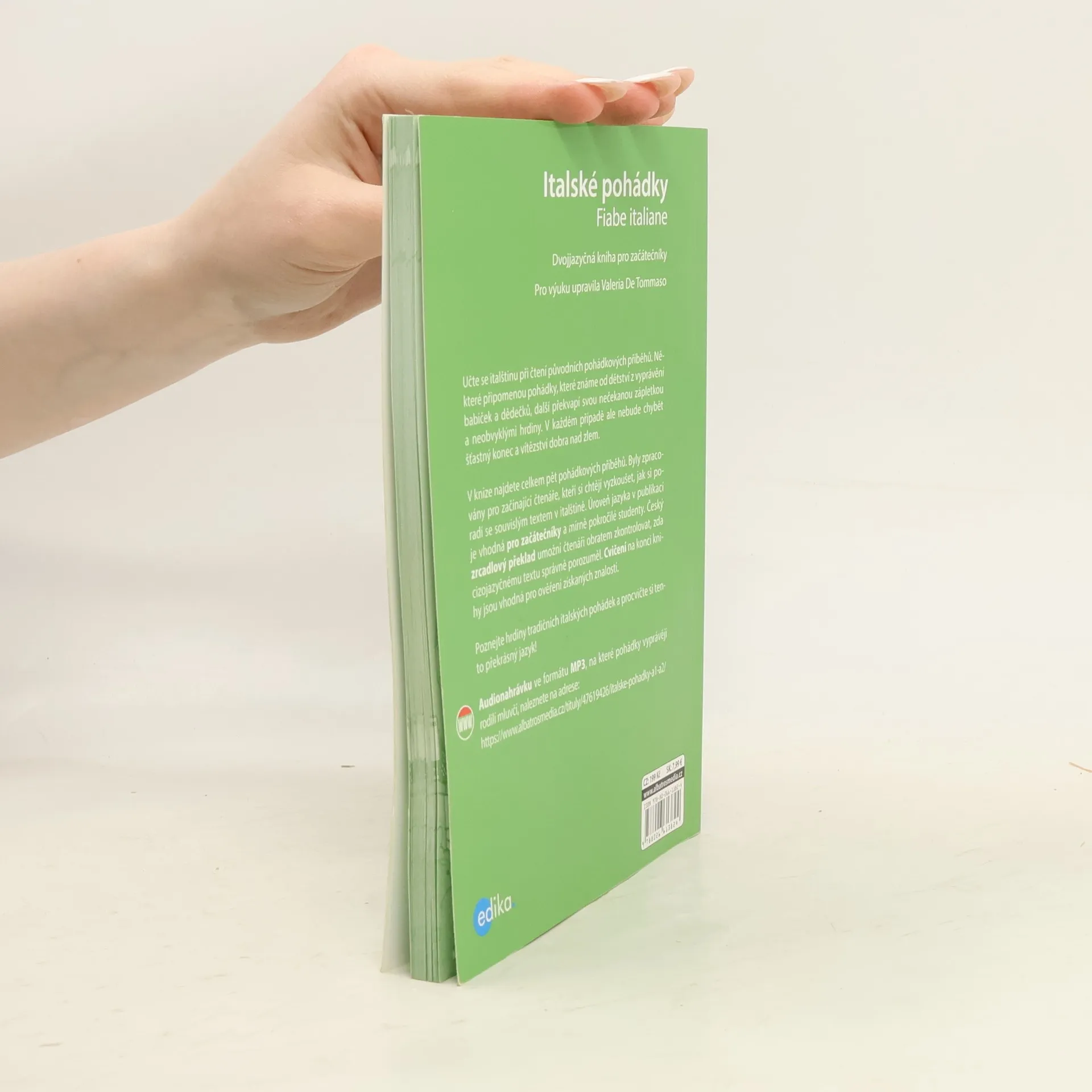 "Poznejte hrdiny tradičních italských pohádek a procvičte si italštinu!" V knize najdete pět originálních pohádkových příběhů. Byly zpracovány pro začínající čtenáře, kteří si chtějí vyzkoušet, jak si poradí se souvislým textem v italštině. Úroveň jazyka v publikaci je vhodná pro začátečníky a mírně pokročilé studenty. Český zrcadlový překlad umožní čtenáři obratem zkontrolovat, zda cizojazyčnému textu správně porozuměl. Cvičení na konci knihy jsou vhodná pro ověření získaných znalostí.