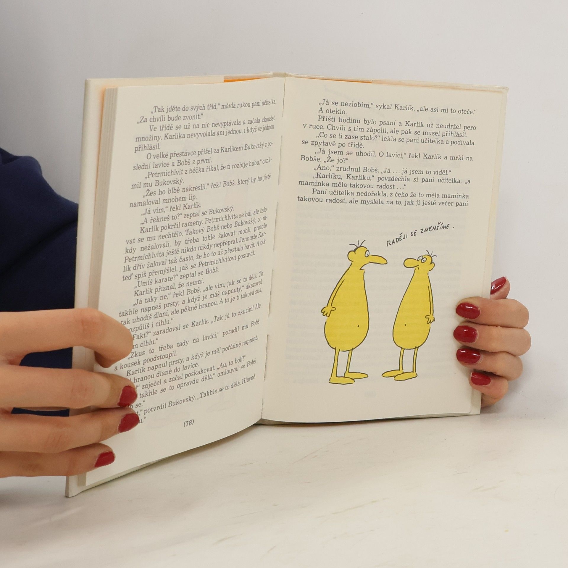 Rozmarné vyprávění o Karlíkovi z 3. A, který tak dlouho chytal lelky, až je jednou doopravdy chytil. Pozn.: Vydání má ještě druhou variantu přebalu, kde poloviny vejce s hlavami jsou vzájemně prohozené (levá polovina + dlouhý špičatý nos je dole, pravá polovina + kulatý nos je nahoře, viz třeba Centrální katalog UK).