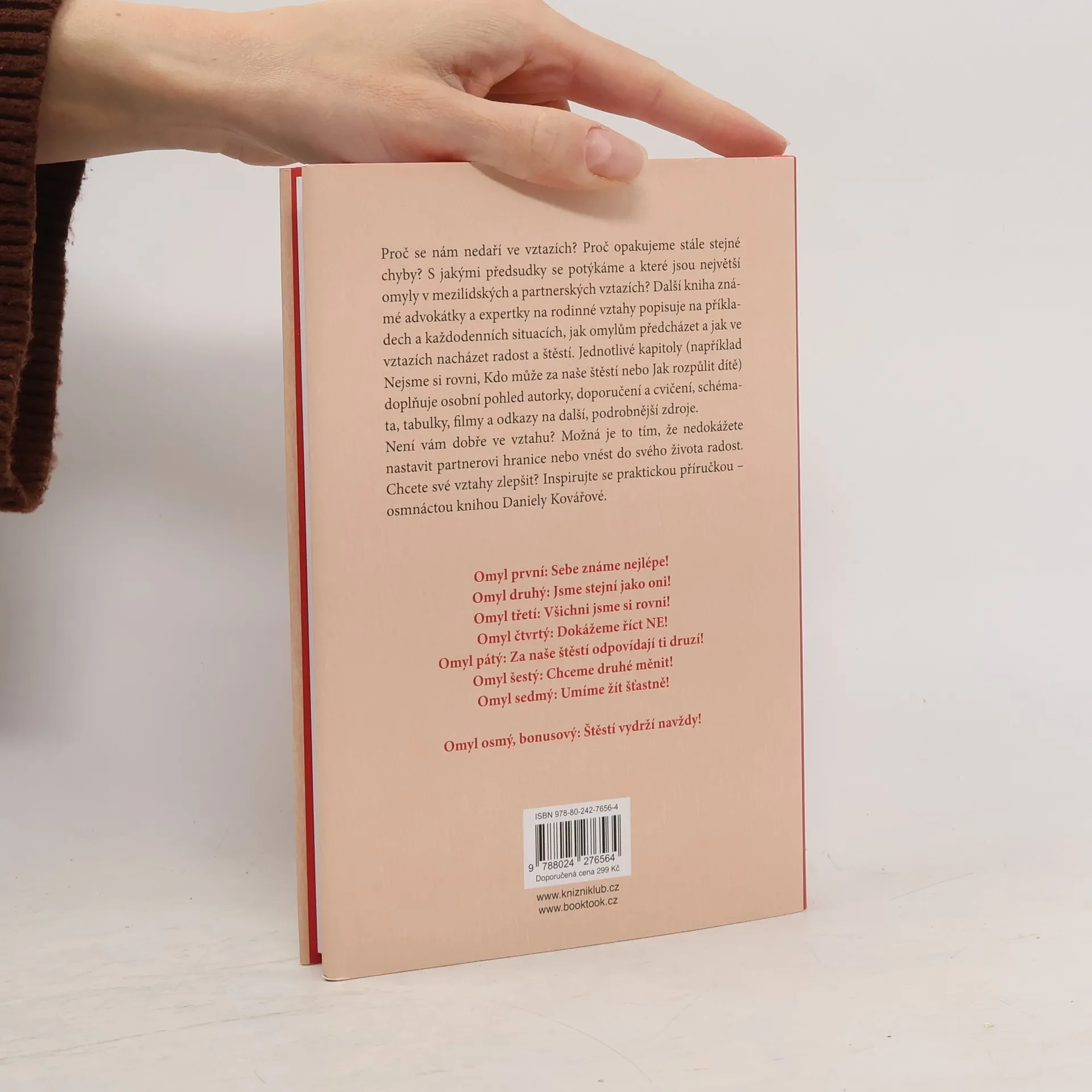 Proč se nám nedaří ve vztazích? Proč opakujeme stále stejné chyby? S jakými předsudky se potýkáme a které jsou největší omyly v mezilidských a partnerských vztazích? Další kniha známé advokátky a expertky na rodinné vztahy popisuje na příkladech a každodenních situacích, jak omylům předcházet a jak ve svých vztazích nacházet radost a štěstí. Jednotlivé kapitoly (například Nejsme si rovni, Kdo může za naše štěstí nebo Jak rozpůlit dítě) doplňuje osobní pohled autorky, doporučení a cvičení, schémata, tabulky, filmy a odkazy na další, podrobnější zdroje. Není vám dobře ve vztahu? Možná je to tím, že nedokážete nastavit partnerovi hranice nebo vnést do svého života radost. Chcete své vztahy zlepšit? Inspirujte se praktickou příručkou – osmnáctou knihou Daniely Kovářové.