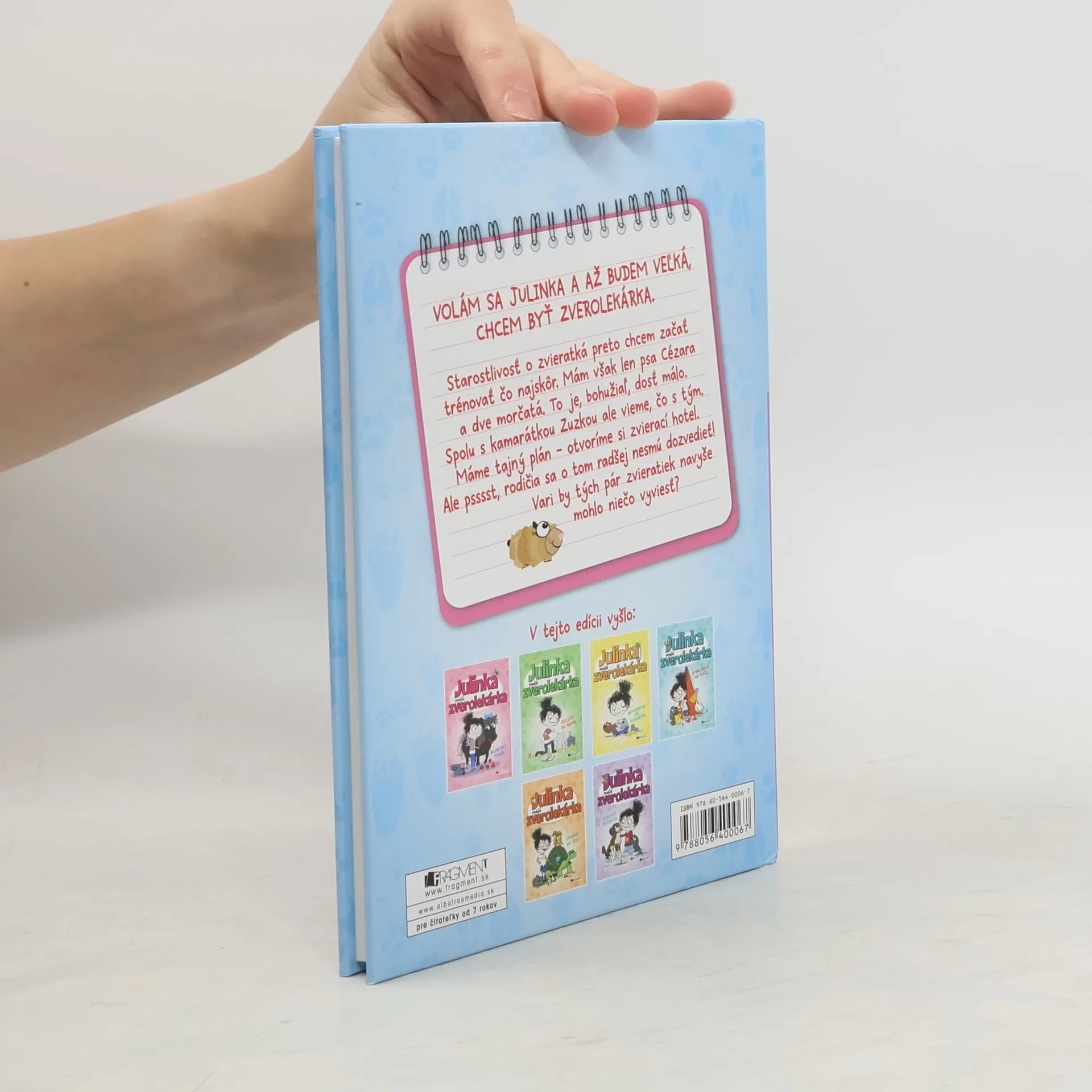 1. diel zo série: Julinka - malá zverolekárka Volám sa Julinka a až budem veľká, chcem byť zverolekárka. Starostlivosť o zvieratká preto chcem začať trénovať čo najskôr. Mám však len psa Cézara a dve morčatá. To je, bohužiaľ, dosť málo. Spolu s kamarátkou Zuzkou ale vieme, čo s tým. Máme tajný plán - otvoríme si zvierací hotel. Ale psssst, rodičia sa o tom radšej nesmú dozvedieť! Vari by tých pár zvieratiek navyše mohlo niečo vyviesť?