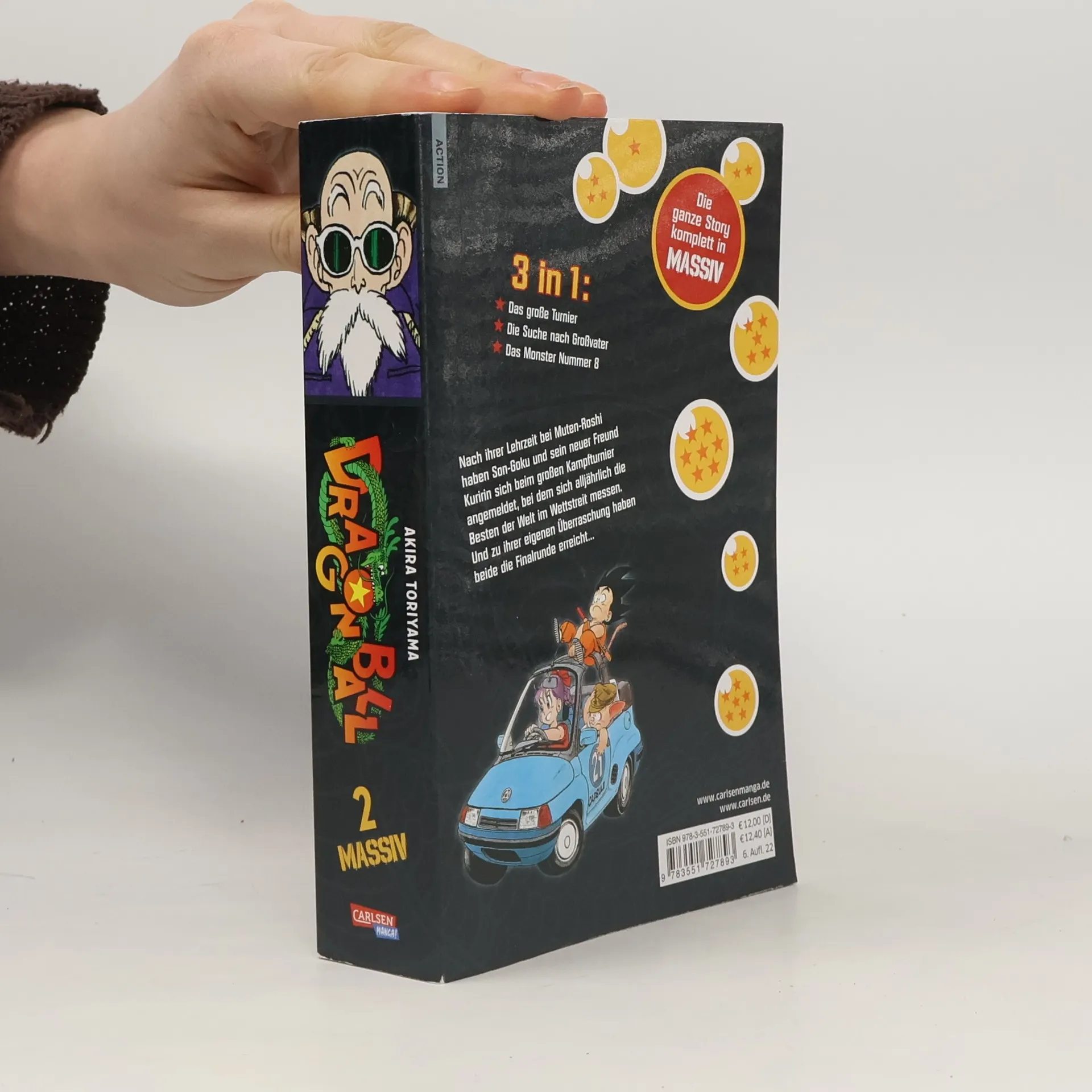 DRAGON BALL MASSIV ist die 3-in-1-Ausgabe des legendären Manga DRAGON BALL. Jeder der insgesamt 14 Sammelbände wird mit jeweils mehr als 500 Seiten drei Taschenbuchausgaben umfassen und erscheint mit neuen Covern. Mit der Neuedition zum Hammerpreis kann die Suche nach den sieben Dragon Balls wieder losgehen! Inhalt: Nach ihrer Lehrzeit bei Muten-Roshi haben Son-Goku und sein neuer Freund Kuririn sich beim großen Kampfturnier angemeldet, bei dem sich alljährlich die Besten der Welt messen. Zu ihrer eigenen Überraschung haben beide die Finalrunde erreicht und stehen nun dem geheimnisvollen Jackie Chun gegenüber… Dieser Band enthält die Manga-Kapitel aus den Taschenbüchern 4, 5 und 6. Für Fans von Naruto, One Piece, My Hero Academia und Fairy Tail! Mehr Informationen: - Abgeschlossen in 14 Bänden