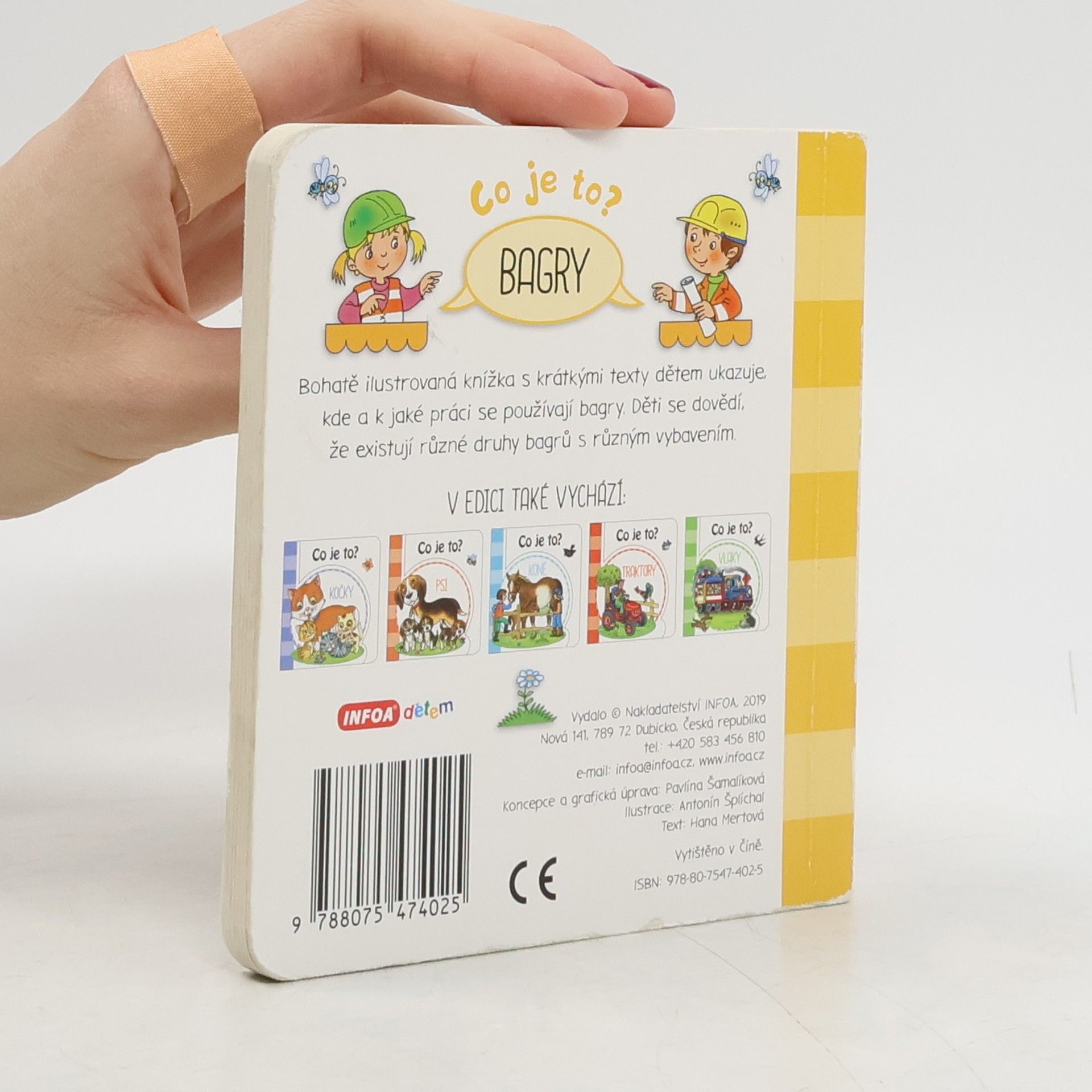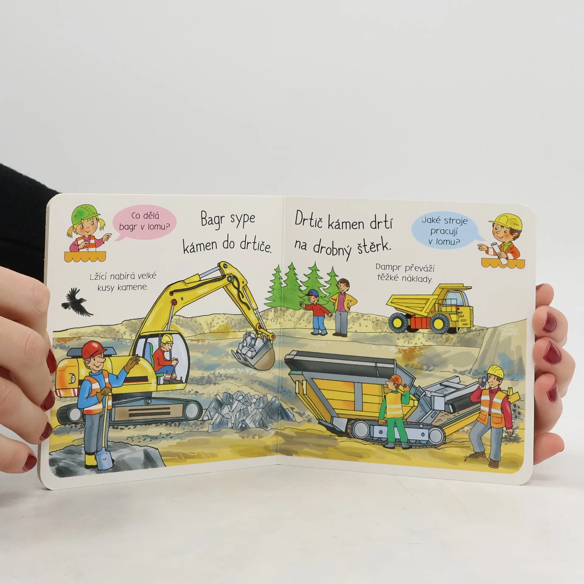 Bohatě ilustrovaná knížka s krátkými texty dětem ukazuje, kde a k jaké práci se používají bagry. Děti se dovědí, že existují různé druhy bagrů s různým vybavením.