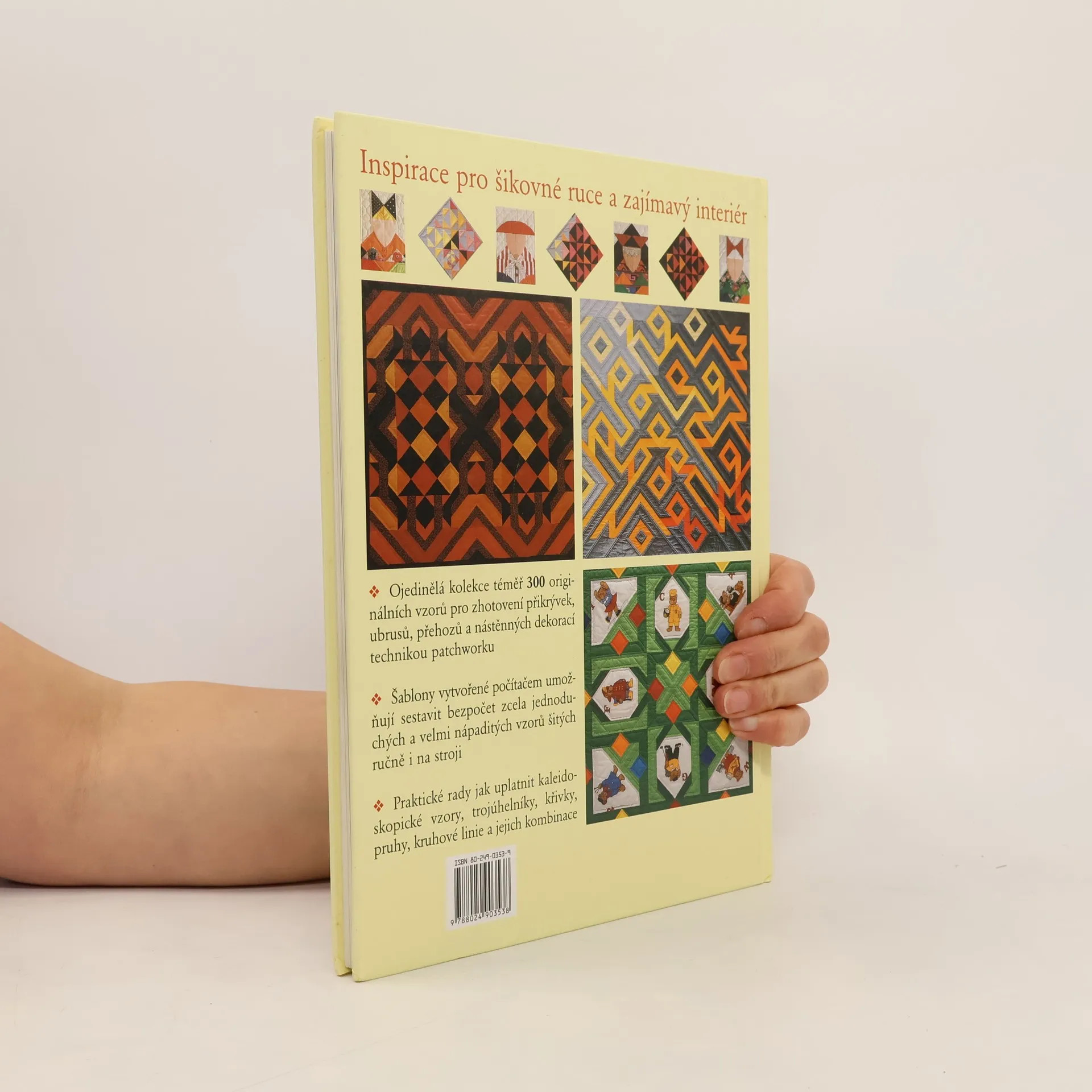 Vzorník originálních motivů na patchwork. - Ojedinělá kolekce téměř 300 originálních vzorů pro zhotovení přikrývek, ubrusů, přehozů a nástěnných dekorací technikou patchworku - Šablony vytvořené počítačem umožňují sestavit bezpočet jednoduchých i velmi nápaditých vzorů šitých ručně i na stroji - Praktické rady jak uplatnit kaleidoskopické vzory, trojúhelníky, křivky, pruhy, kruhové linie a jejich kombinace