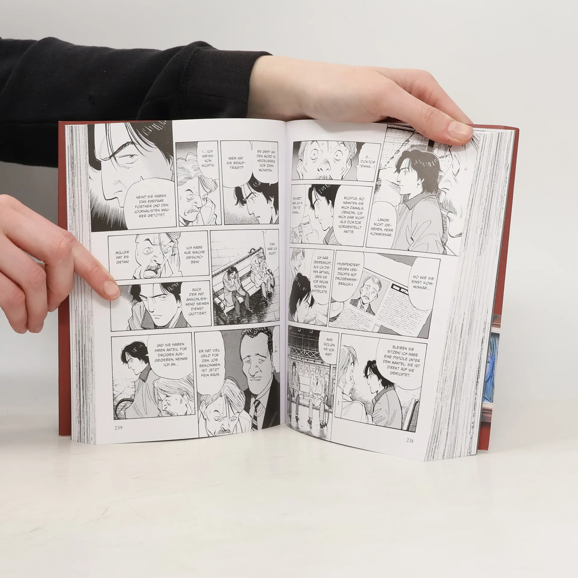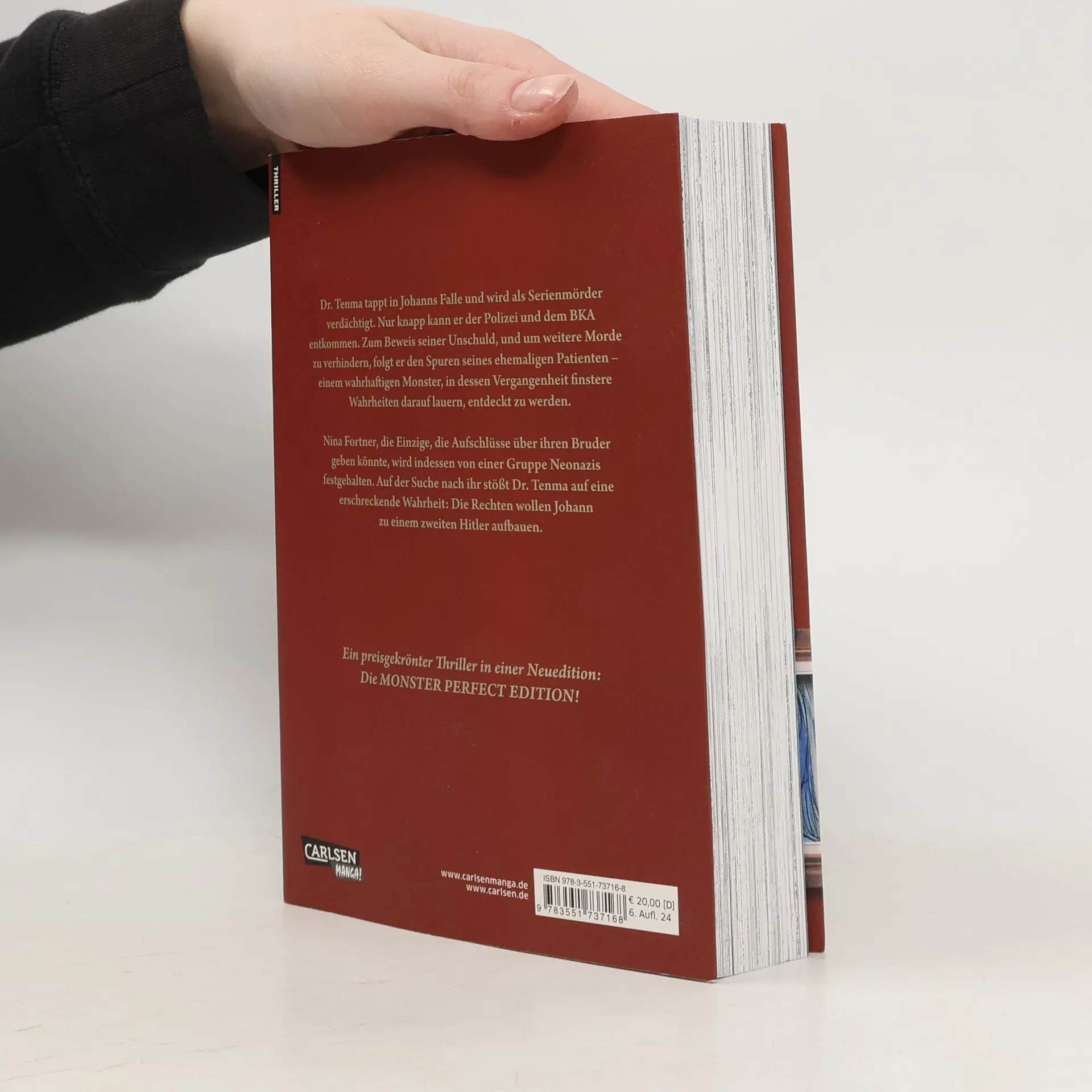 Die Spuren des Killers führen in die Neonazi-Szene Dr. Tenma tappt in Johanns Falle und wird als Serienmörder verdächtigt. Nur knapp kann er der Polizei und dem BKA entkommen. Zum Beweis seiner Unschuld, und um weitere Morde zu verhindern, folgt er den Spuren seines ehemaligen Patienten – einem wahrhaftigen Monster, in dessen Vergangenheit finstere Wahrheiten darauf lauern, entdeckt zu werden. Nina Fortner, die Einzige, die Aufschlüsse über ihren Bruder geben könnte, wird indessen von einer Gruppe Neonazis festgehalten. Auf der Suche nach ihr stößt Dr. Tenma auf eine erschreckende Wahrheit: Die Rechten wollen Johann zu einem zweiten Hitler aufbauen. Neuausgabe: Jeder Band enthält zwei Nummern der früheren Ausgabe Neue Ausstattung: Doppelbände im Großformat (14,8 x 21,1 cm) und mit kolorierten Seiten Abgeschlossene Manga-Serie: »Monster« ist in 9 Bänden abgeschlossen - ohne Cliffhanger weiterlesen! Ideales Geschenk für Manga-Fans und Sammler: Die Cover aller Doppelbände ergeben ein zusammenhängendes Bild Empfohlen für Leser*innen ab 14 Jahren Eine Mörderjagd im Deutschland der 1980er-Jahre – der zweite Doppelband des intelligenten Manga-Thrillers ab 14 Jahren