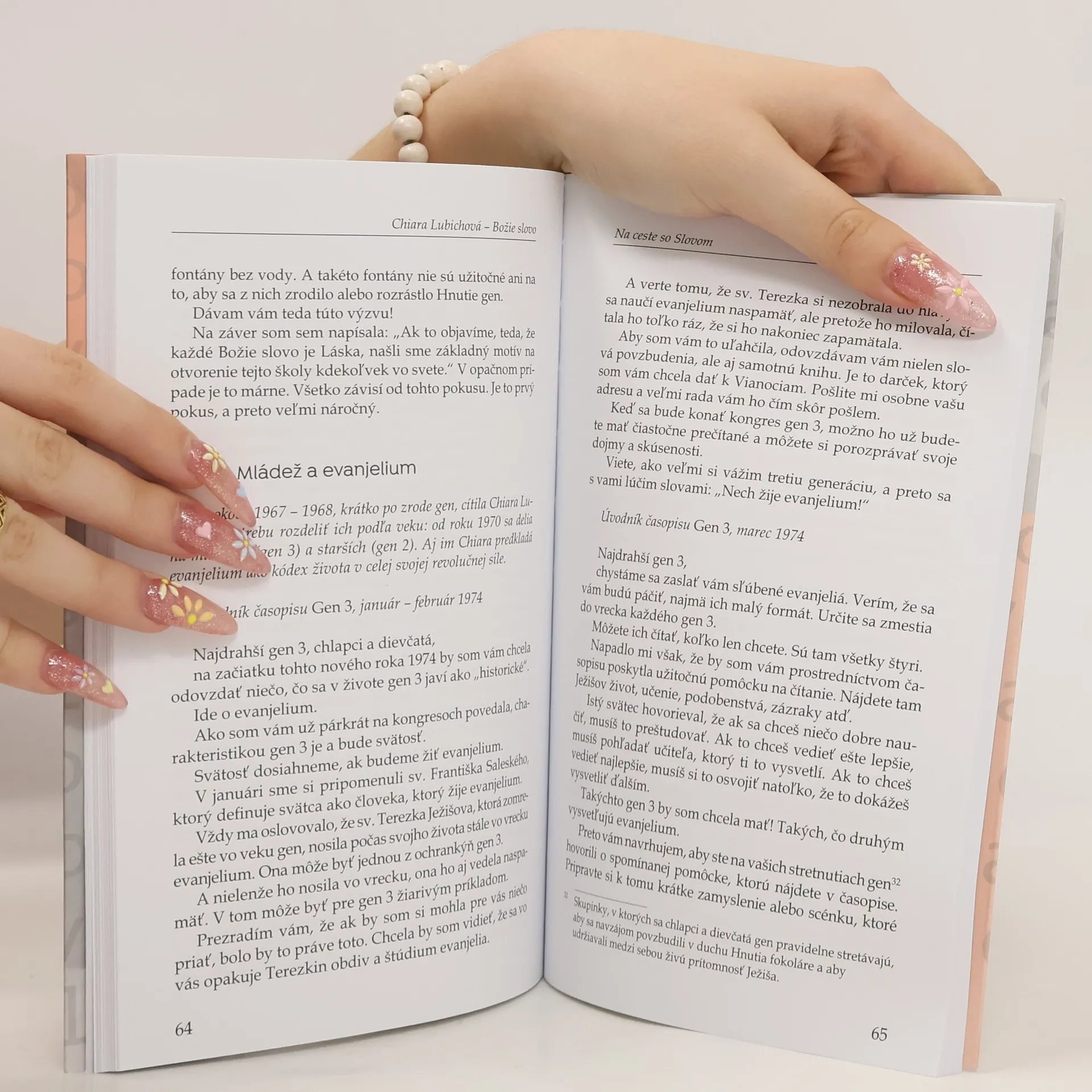Zo zápiskov z 30. júna 1961 Intenzívne sme sa snažili žiť podľa základných bodov našej spirituality: prítomný okamih, vzájomná láska, Božie slovo. Snažili sme sa pripodobniť Božiemu slovu, ktoré sme si v prítomnej chvíli ustavične pripomínali. Zaviazali sme sa budovať tri spoločenstvá: s Ježišom v Eucharistii, s bratom, s Božím slovom. Už asi päť rokov sme rozjímali o Slove zo Svätého písma, keď som si na jar roku 1949 uvedomila, že účinky rôznych slov boli takmer rovnaké, alebo ak aj nie rovnaké, akoby podstatou každého slova bola láska. Už niekoľko rokov sme si uvedomovali, že tak ako je Ježiš prítomný v celej hostii, rovnako je prítomný aj v každom jej kúsku, a takisto je prítomný aj v každom slove, v každej myšlienke... Nepamätám si presne na ten zlom, ale v tom čase som v sebe cítila silné presvedčenie, že opustený Ježiš tak trochu sumarizuje celé evanjelium. A že ak milujeme jeho, rozkvitajú všetky čnosti. Chiara Lubichová (1920 - 2008), veľká charizmatická postava našich čias, známa svojím neúnavným pôsobením v prospech jednoty a pokoja. Duch Hnutia fokoláre, ktoré založila, sa rozšíril do celého sveta, aj medzi členov kresťanských cirkví, veriacich z iných náboženstiev a ľudí iného presvedčenia. Jej dielo obsahuje 58 publikovaných titulov s viac ako 220 vydaniami a prekladmi vo viac ako dvadsiatich jazykoch.