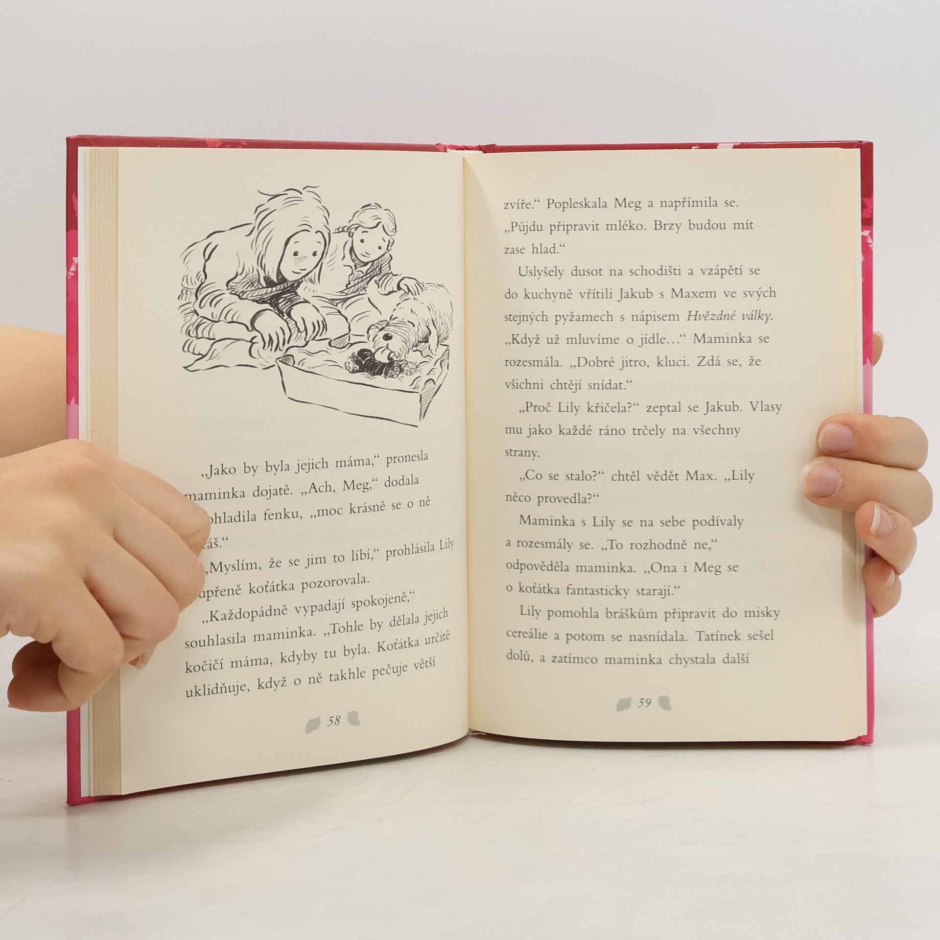 Maminka malé Lily přinese domů tři slabá koťátka, která se našla opuštěná venku pod keřem. Kočičí miminka potřebují hlídat a pravidelně krmit. Celá rodina, včetně fenky Meg, si malé chlupáče ihned zamiluje. Lily se snaží co nejvíce pomáhat a o mláďátka pečovat. Podaří se koťátka zachránit, nahradit jim maminku a najít nový domov?Krásný příběh o…