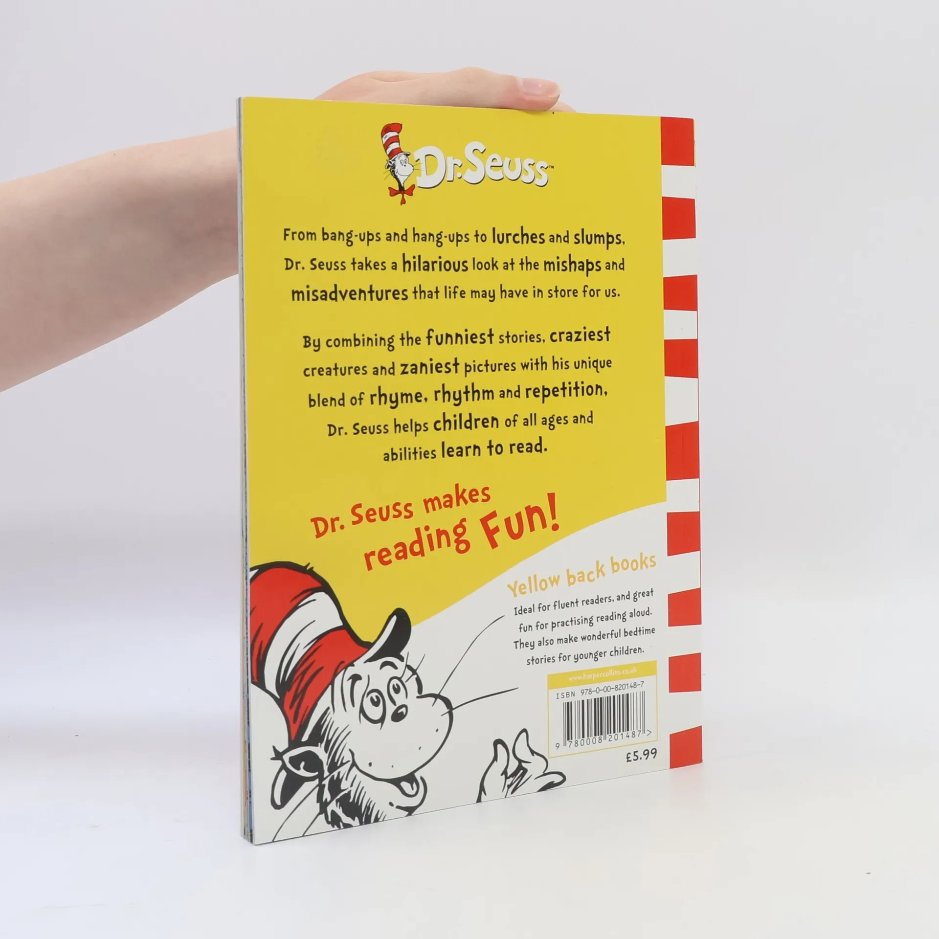In this classic Seussian tale, the good doctor primes his readers against all the little mishaps and misadventures that can befall even the best of us - from bang-ups and hang-ups to lurches and slumps - encouraging us to take life in our stride! From fun times and triumphs to lurches and slumps, Dr Seuss takes an entertaining look at the adventures that life may have in store for us. As part of a major rebrand programme, HarperCollins is relaunching 17 of Dr. Seuss's best-selling books, including such perennial favourites as The Cat in the Hat, Green Eggs and Ham and Fox in Socks. In response to consumer demand, the bright new cover designs incorporate much needed guidance on reading levels, with the standard paperbacks divided into three reading strands - Blue Back Books for parents to share with young children, Green Back Books for budding readers to tackle on their own, and Yellow Back Books for older, more fluent readers to enjoy. Oh, The Places You'll Go! belongs to the Yellow Back Book range.