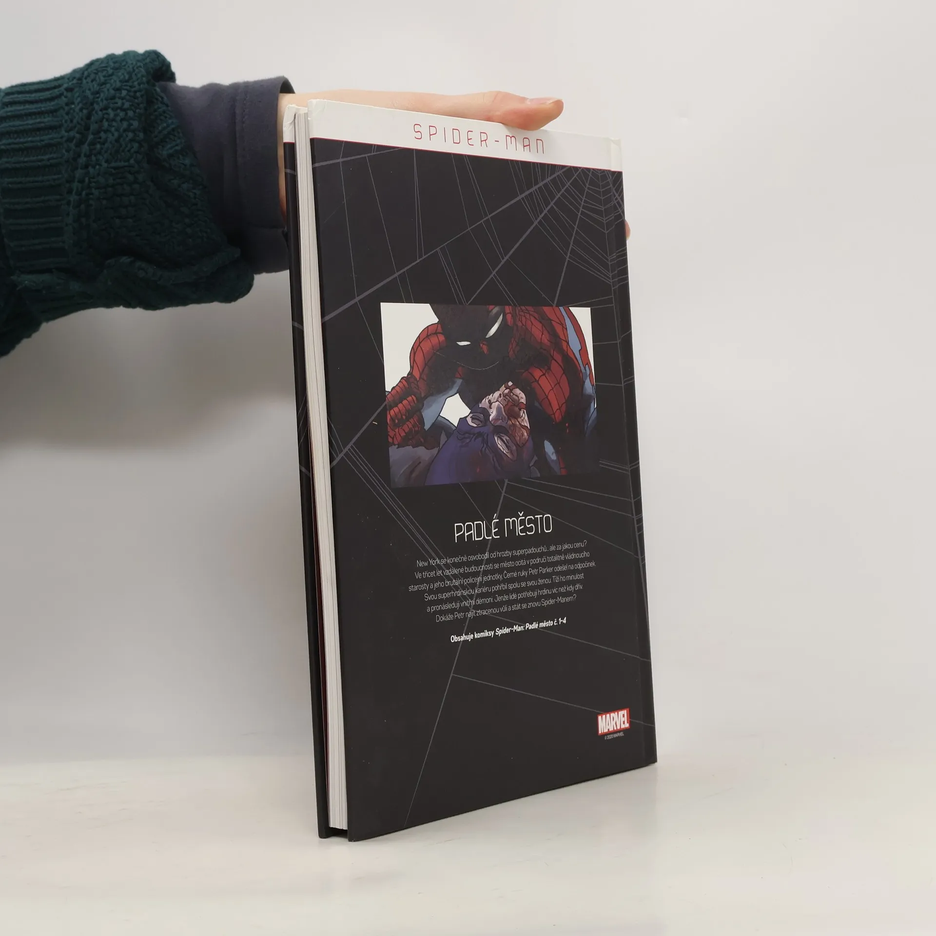 New York se konečně osvobodil od hrozby superpadouchů... ale za jakou cenu? Ve třicet let vzdálené budoucnosti se město ocitá v područí totalitně vládnoucího starosty a jeho brutální policejní jednotky, Černé ruky. Petr Parker odešel na odpočinek. SVou superhrdinskou kariéru pohřbil spolu sesvou ženou. Tíží ho minulost a pronásledují vnitřní démoni. Jenže lidé potřebují hrdinu víc než kdy dřív. Dokáže Petr najít ztracenou vůli a stát se znovu Spider-Manem? Obsahuje komiksy Spider-Man: Padlé město č. 1-4.