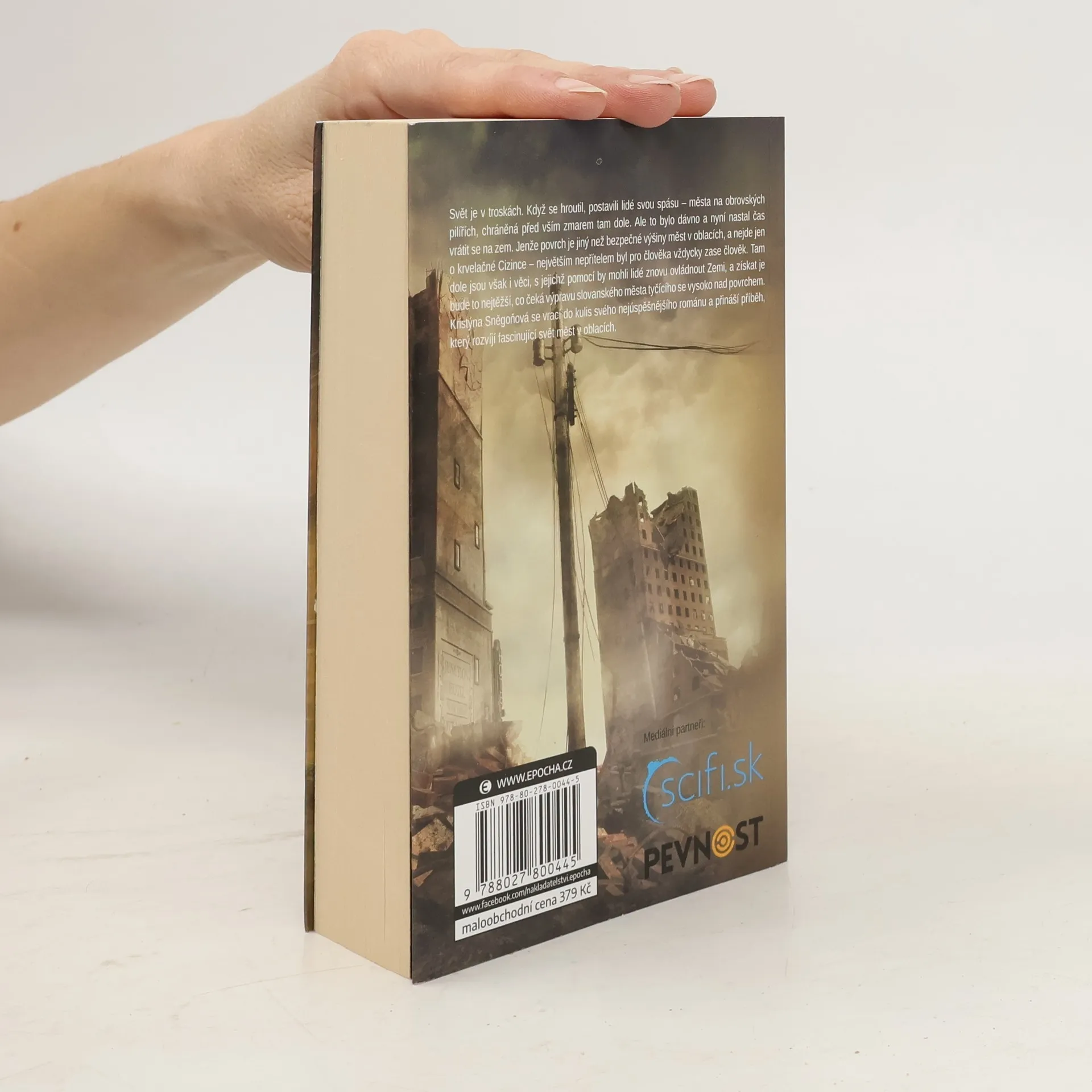 Svět je v troskách. Když se hroutil, postavili lidé svou spásu – města na obrovských pilířích, chráněná před vším zmarem tam dole. Ale to bylo dávno a nyní nastal čas vrátit se na zem. Jenže povrch je jiný než bezpečné výšiny měst v oblacích, a nejde jen o krvelačné Cizince – největším nepřítelem byl pro člověka vždycky zase člověk. Tam dole jsou však i věci, s jejichž pomocí by mohli lidé znovu ovládnout Zemi, a získat je bude to nejtěžší, co čeká výpravu slovanského města tyčícího se vysoko nad povrchem. Kristýna Sněgoňová se vrací do kulis svého nejúspěšnějšího románu a přináší příběh, který rozvíjí fascinující svět měst v oblacích.