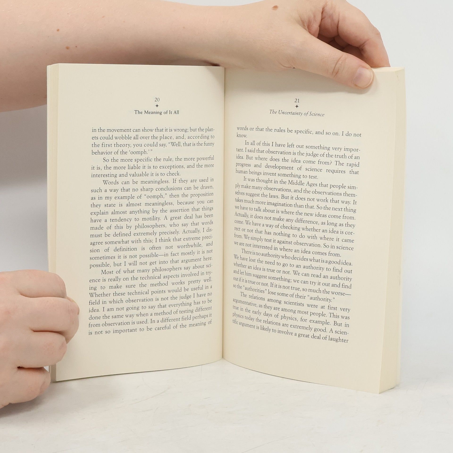 Many appreciate Richard P. Feynman's contributions to twentieth-century physics, but few realize how engaged he was with the world around him -- how deeply and thoughtfully he considered the religious, political, and social issues of his day. Now, a wonderful book -- based on a previously unpublished, three-part public lecture he gave at the University of Washington in 1963 -- shows us this other side of Feynman, as he expounds on the inherent conflict between science and religion, people's distrust of politicians, and our universal fascination with flying saucers, faith healing, and mental telepathy. Here we see Feynman in top form: nearly bursting into a Navajo war chant, then pressing for an overhaul of the English language (if you want to know why Johnny can't read, just look at the spelling of "friend"); and, finally, ruminating on the death of his first wife from tuberculosis. This is quintessential Feynman -- reflective, amusing, and ever enlightening.