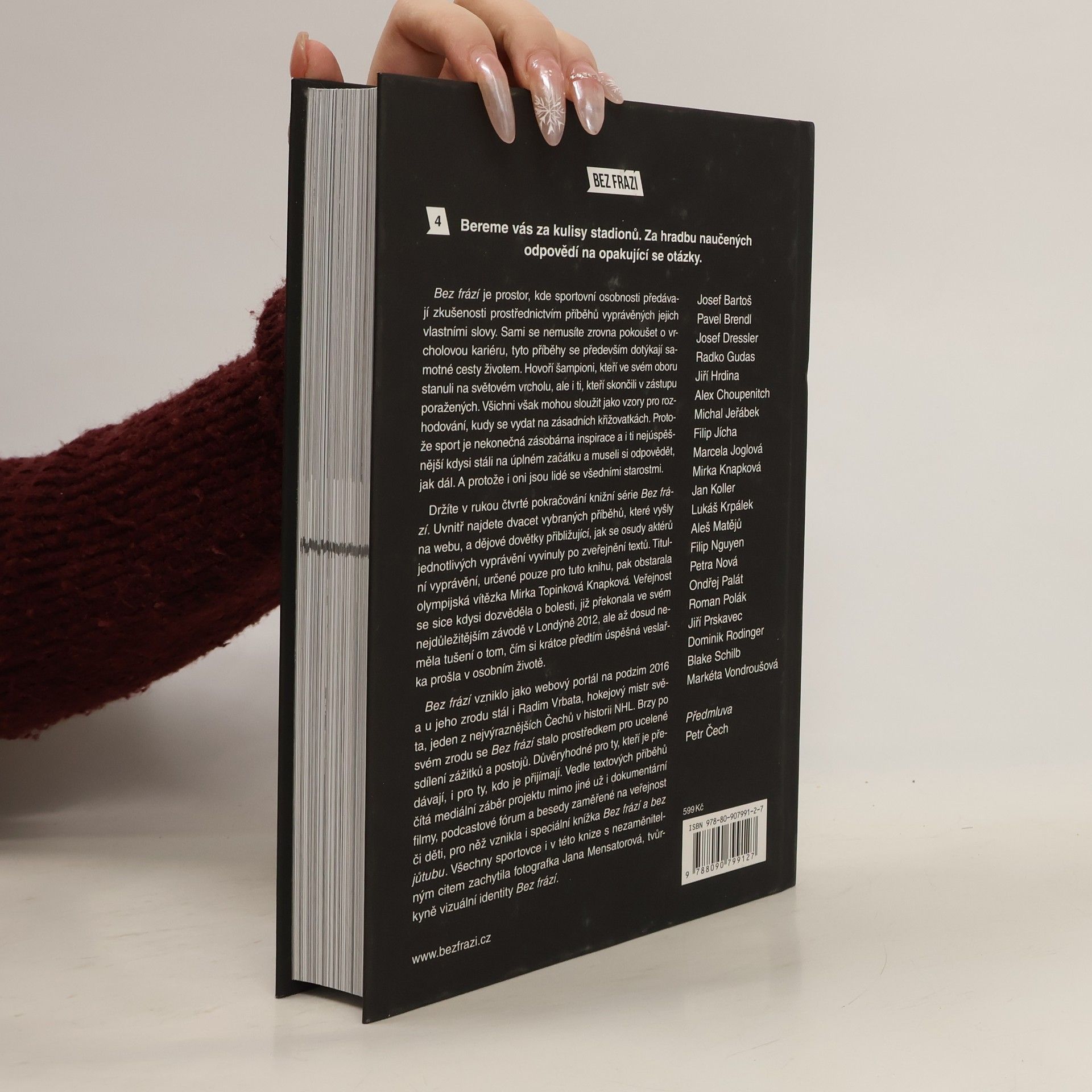 Čtvrtá nálož inspirace od sportovních osobností přináší exkluzivní příběh olympijské vítězky Mirky Topinkové Knapkové, která ve svém nejdůležitějším závodě překonala nesnesitelné bolesti. Nyní odkrývá, že krátce předtím čelila daleko náročnější zkoušce v osobním životě. Kromě jejího vyprávění obsahuje kniha dvacet příběhů, které byly publikovány na webu Bez frází, a dějové dovětky, které přibližují osudy aktérů po zveřejnění textů. Mezi nimi jsou olympijští medailisté z Tokia, jako Lukáš Krpálek, Jiří Prskavec, Alexander Choupenitch a Markéta Vondroušová, dále Jan Koller, Filip Jícha a Jiří Hrdina. Bez frází je platforma, kde sportovní osobnosti sdílejí své zkušenosti prostřednictvím vlastních příběhů. Tyto příběhy se dotýkají cesty životem a rozhodování na zásadních křižovatkách. Sport je nekonečná zásobárna inspirace, a i ti nejúspěšnější museli čelit začátkům a každodenním starostem. V knize vyprávějí své příběhy sportovci jako Josef Bartoš, Pavel Brendl, Radko Gudas, Michal Jeřábek, Marcela Joglová, Aleš Matějů, Ondřej Palát, Dominik Rodinger a Blake Schilb.