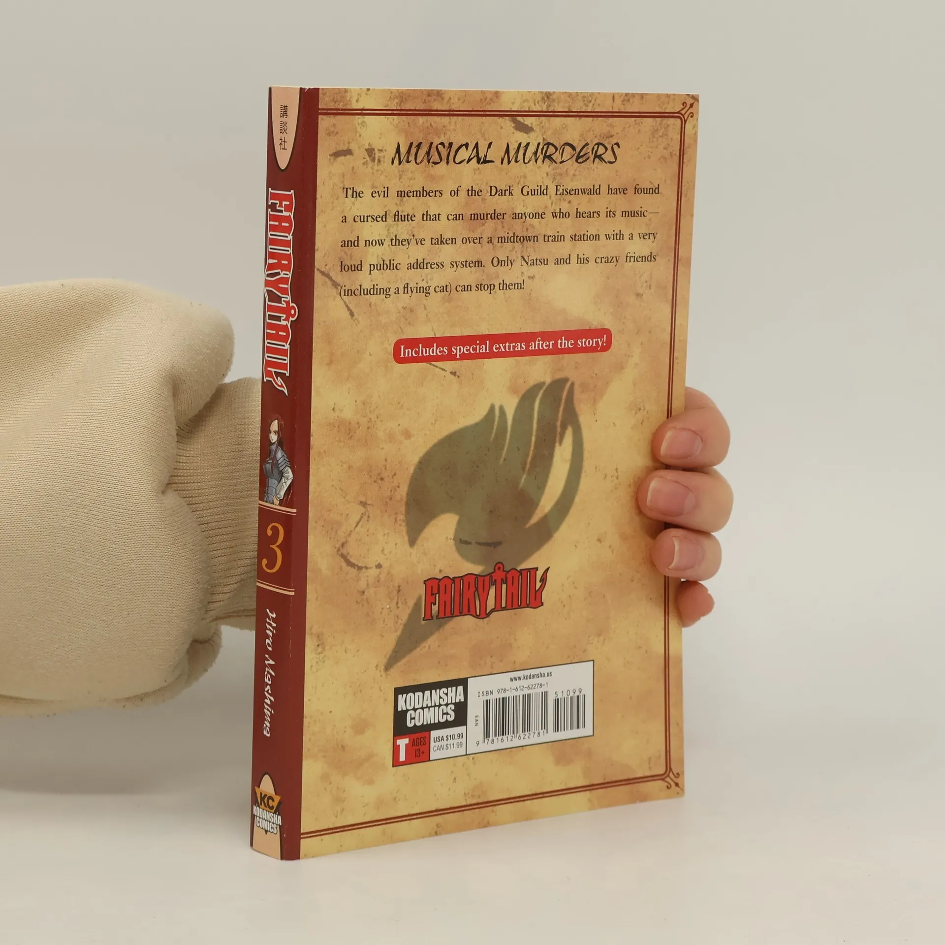 MUSICAL MURDERS In the third volume of Fairy Tail, the evil members of the Dark Guild Eisenwald have found a cursed flute that can murder anyone who hears its music – and now they’ve taken over a midtown train station with a very loud public address system. Only Natsu and his crazy friends (including a flying cat) can stop them! Includes special extras after the story!