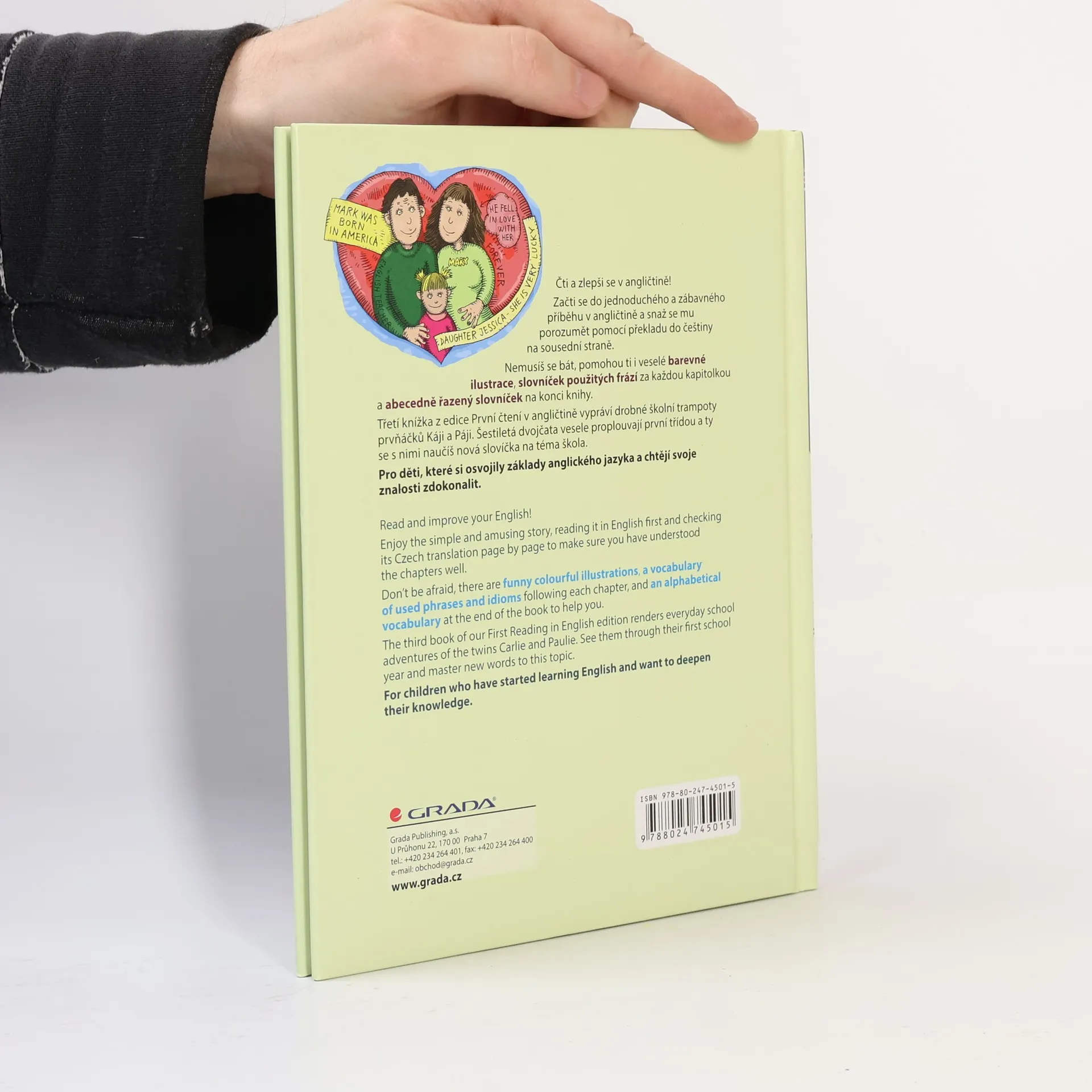 Pro děti, které si osvojily základy anglického jazyka a chtějí svoje znalosti zdokonalit. Formou svižně napsaných a atraktivně ilustrovaných minikapitol knížka vypráví drobné školní trampoty prvňáků Káji a Páji. Kromě podrobného slovníčku na konci knihy je v každé kapitole zařazen slovníček použitých frází.