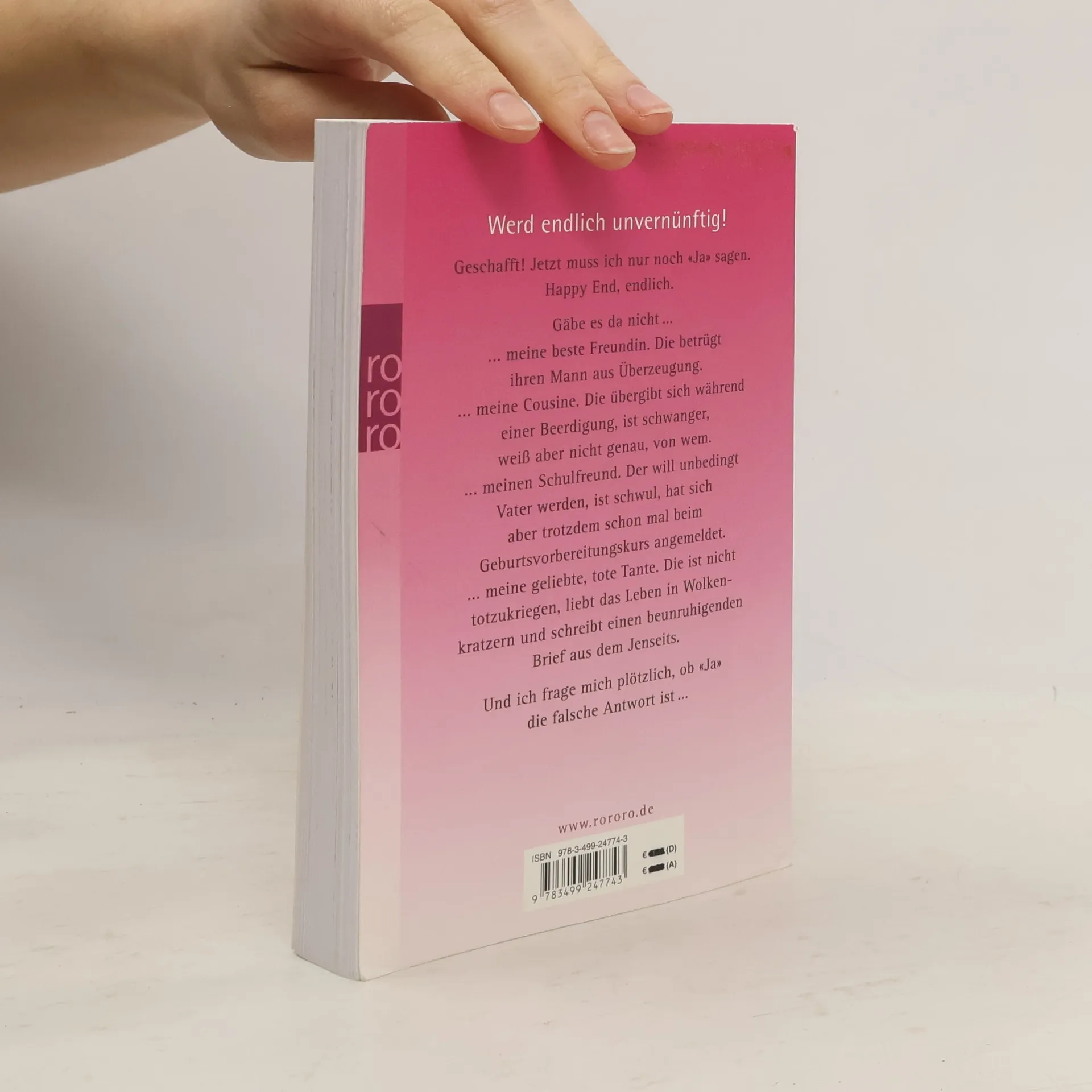 Werd endlich unvernünftig!Geschafft! Jetzt muss ich nur noch «ja» sagen. Happy End, endlich. Gäbe es da nicht ...… meine beste Freundin. Die betrügt ihren Mann aus Überzeugung.… meine Cousine. Die übergibt sich während einer Beerdigung, ist schwanger, weiß aber nicht genau, von wem.… meinen Schulfreund. Der will unbedingt Vater werden, ist schwul, hat sich aber trotzdem schon mal beim Geburtsvorbereitungskurs angemeldet.… meine geliebte, tote Tante. Die ist nicht totzukriegen, liebt das Leben in Wolkenkratzern und schreibt einen beunruhigenden Brief aus dem Jenseits.Und ich frage mich plötzlich, ob «Ja» die falsche Antwort ist …