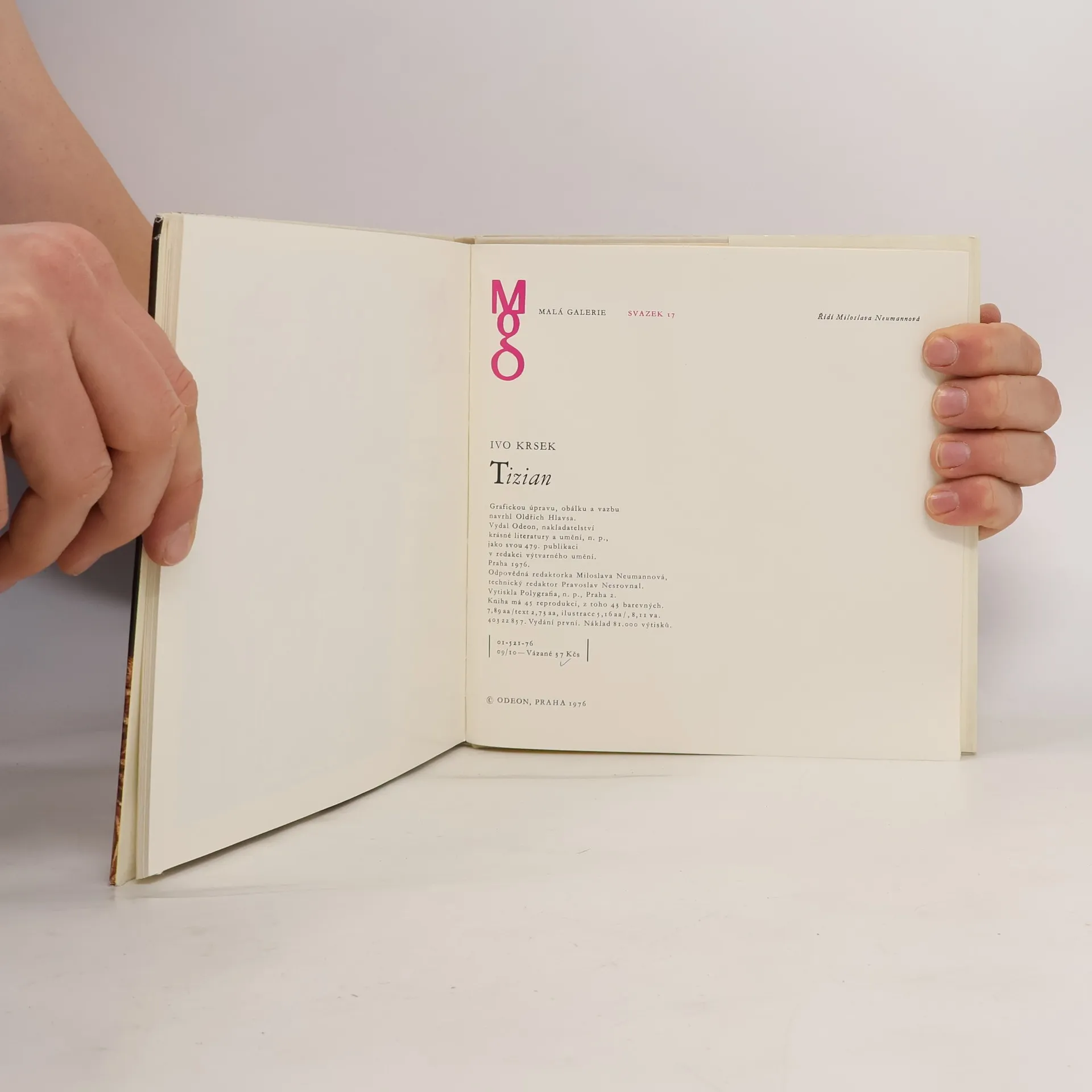 Tato nevelká monografie, reprodukující 38 Tizianových obrazů (některé s detailními záběry) a 2 kresby, je skromnou připomínkou velkého umělcova odkazu. Edice Malá galerie, svazek 17. 1. vydání.