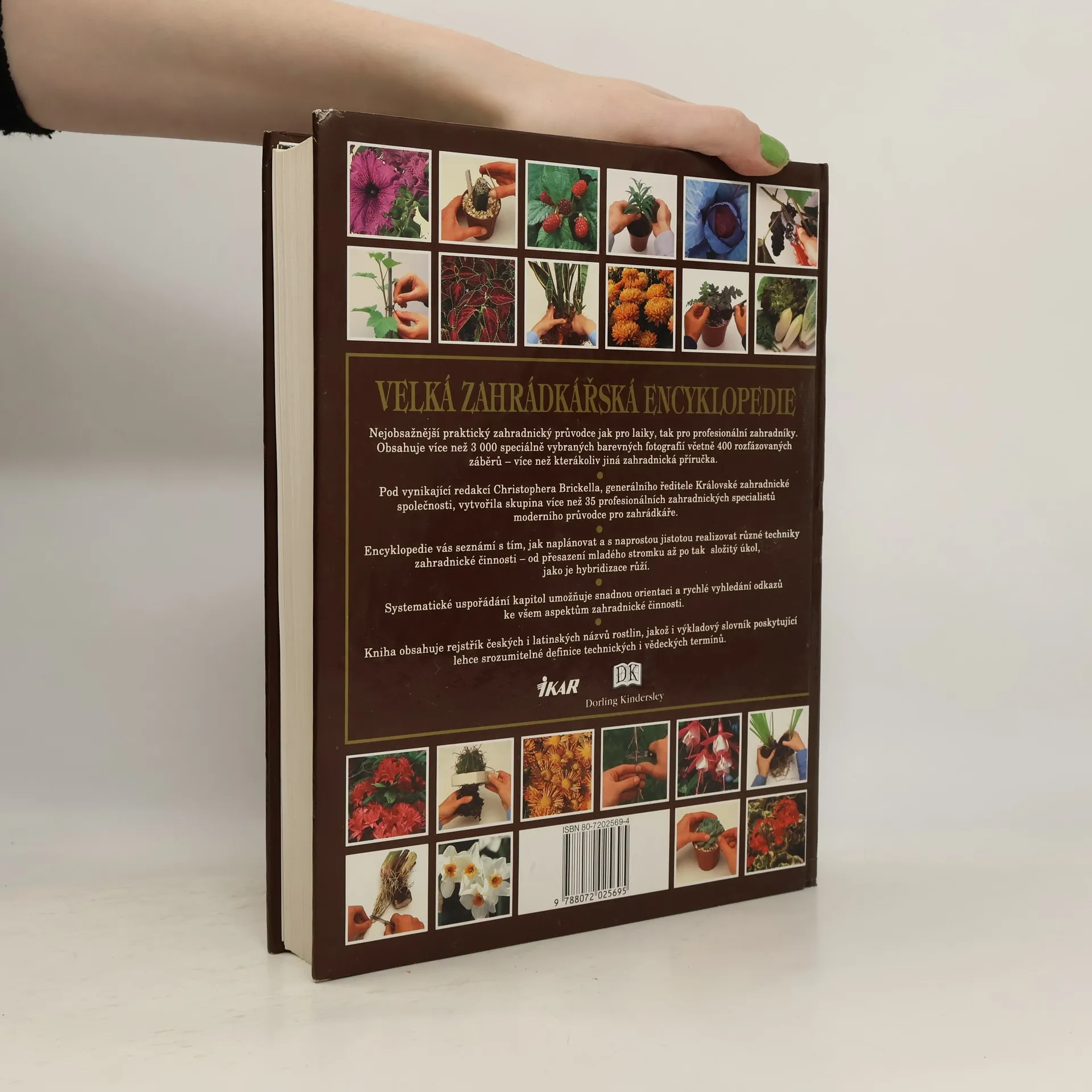 Praktický průvodce zahrádkářskými technikami, navrhováním a údržbou výsadeb i pěstováním květin, okrasných rostlin, ovoce a zeleniny.Nejobsažnější praktický zahradnický průvodce pro laiky i profesionální zahradníky obsahuje více než 3000 barevných fotografií včetně 400 rozfázovaných záběrů. Encyklopedie vás seznámí s tím, jak naplánovat a realizovat různé techniky zahradnické činnosti - od přesazení mladého stromku až třeba po složitou hybridizaci růží. Systematické uspořádání kapitol usnadňuje orientaci a rychlé vyhledávání odkazů ke všem aspektům zahradnické činnosti. Kniha obsahuje rejstřík českých i latinských názvů rostlin, jakož i výkladových slovník poskytující srozumitelné definice technických a vědeckých termínů. Chybné ISBN 80-7202569-4, správné ISBN je 80-7202-569-4. (zdroj: Databáze Národní knihovny ČR)... celý text