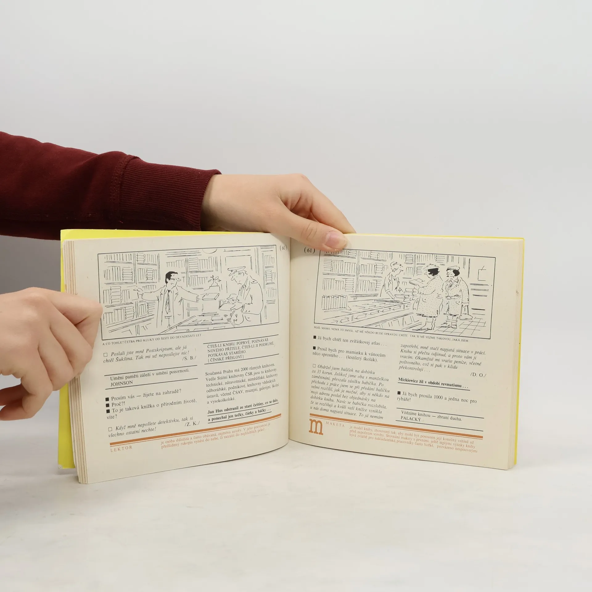 V pestré koláži si můžete smlsnout na autentických záznamech hovorů kolem knihkupeckého pultu, pousmát se i zamyslet nad úryvky z dopisů čtenářů, nahlédnout do zákulisí knihkupectví i nakladatelských domů.Zajímavosti a kuriozity ze světa knih střídají perličky ze školních prací žáků knihkupeckých škol, slovníček čtenářského minima vás záživnou formou seznámí s termíny a fakty, které patří k základnímu vybavení čtenáře-profesionála, a věčné pravdy vám připomenou citáty literárních klasiků i výběr lidových přísloví. O výtvarný doprovod knihy se postarali přední čeští karikaturisté, kteří vytvořili půvabné kresby na téma: Kniha – přítel člověka.Vítejte tedy do kouzelného království spisovatelských dílen, zaprášených skladů a regálů, spokojených i rozčilených čtenářů, knihkupců usměvavých i na pokraji zoufalství, pojďte s námi mezi učně i mistry, do minulosti i budoucnosti knihy, do hájemství roztomilých „přeřeků“ i hlubokých myšlenek, dřevěných liter i nejnovější techniky, pestrých obálek a vzrušujících příbehů, do říše s neopakovatelnou vůní knih...