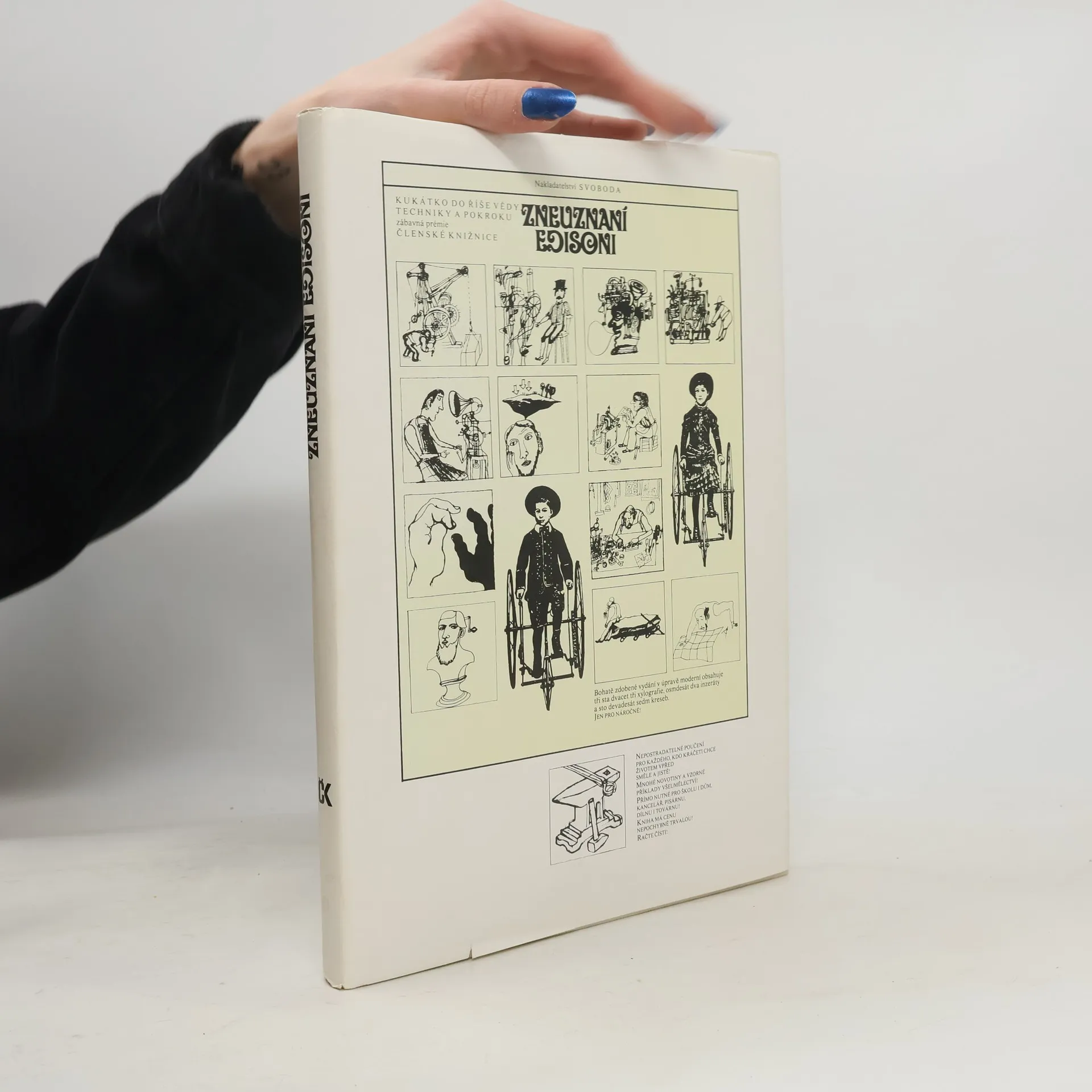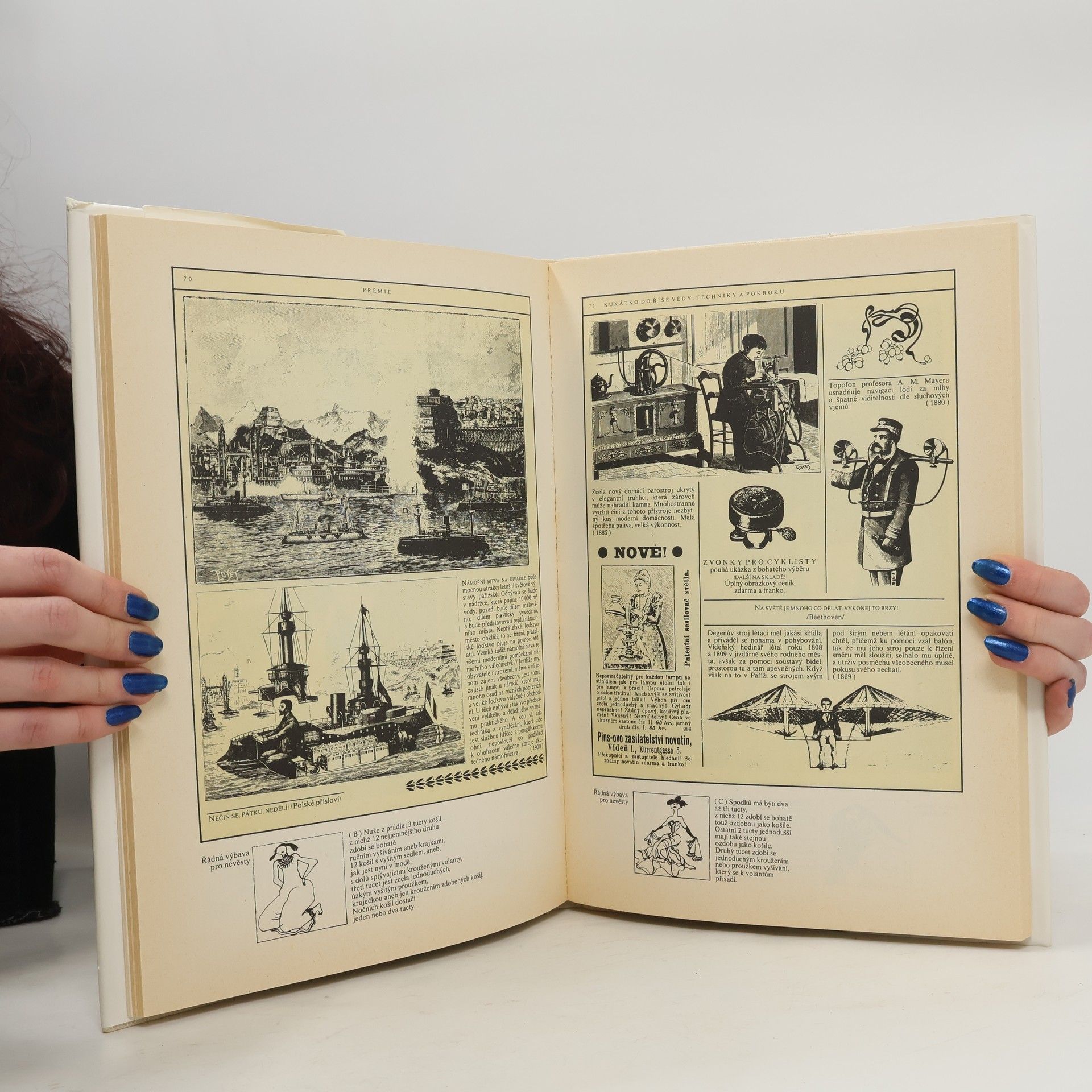 Kukátko do říše vědy, techniky a pokroku. Členská knižnice nakl. Svoboda. Zábavná členska prémie.Z časopisů, vycházejících v 2. polovině 19. století a před první světovou válkou, vybrali autoři různé inzeráty a informace o kuriiózních vynálezech s originálními obrázky. Kromě důmyslných zařízení k usnadnění práce iběžnéhoživota, zdravotnických přístrojů, nových dopravních prostředků apod. upozorňují i na objevy, které přispěly ke skutečnému pokroku.