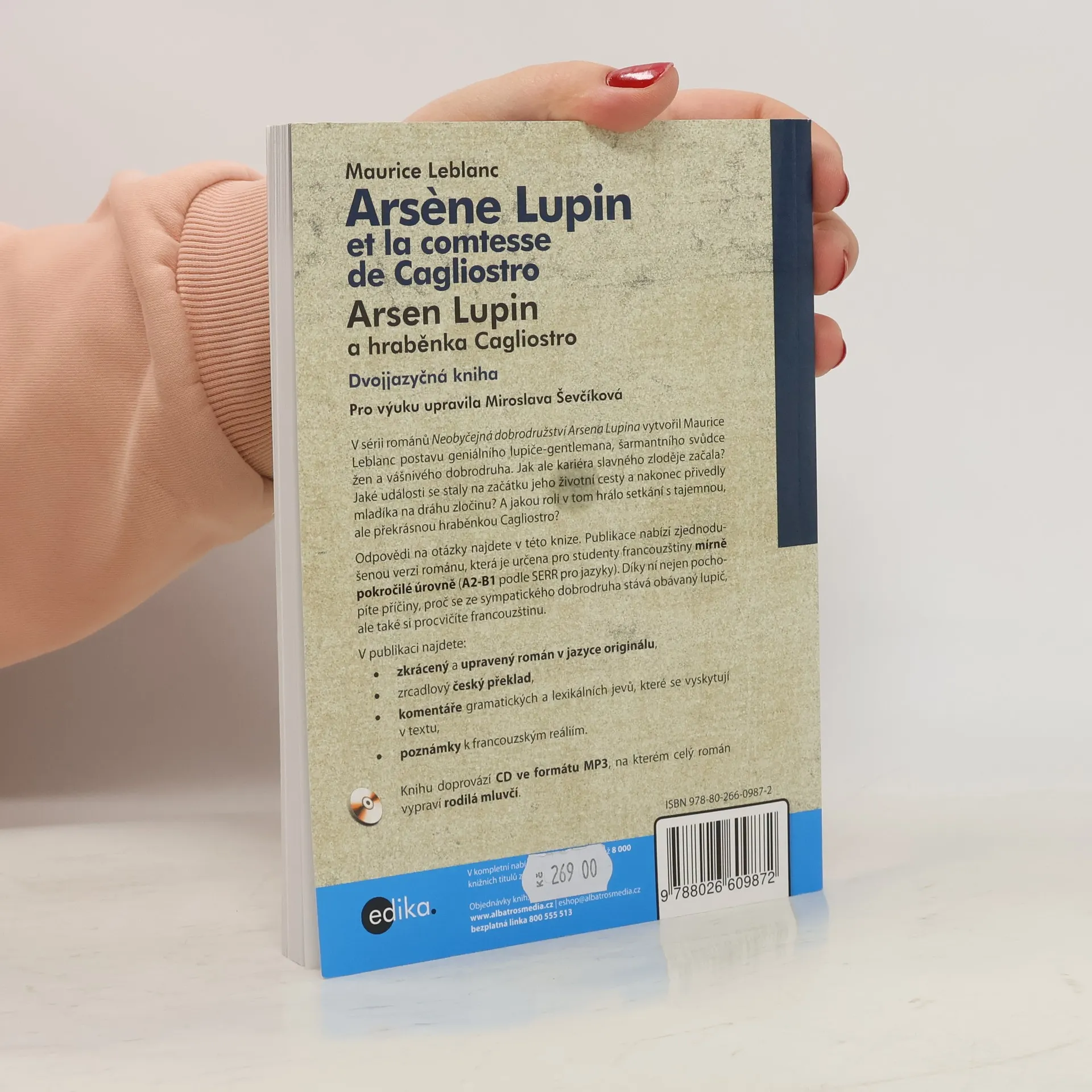 Adaptace díla: Comtesse de Cagliostro / Maurice Leblanc. Román o začátcích slavného lupiče-gentlemana upravený pro výuku! V sérii románů Neobyčejná dobrodružství Arsena Lupina vytvořil Maurice Leblanc postavu geniálního lupiče-gentlemana, šarmantního svůdce žen a vášnivého dobrodruha. Jak ale kariéra slavného zloděje začala? Jaké události se staly na začátku jeho životní cesty a nakonec přivedly mladíka na dráhu zločinu? A jakou roli v tom hrálo setkání s tajemnou, ale překrásnou hraběnkou Cagliostro? Odpovědi na otázky najdete v této knize. Publikace nabízí zjednodušenou verzi románu, která je určena pro studenty francouzštiny mírně pokročilé úrovně (A2-B1 podle SERR pro jazyky). Díky ní nejen pochopíte příčiny, proč se ze sympatického dobrodruha stává obávaný lupič, ale také si procvičíte francouzštinu. V knize najdete: - zkrácený a upravený román v jazyce originálu, - zrcadlový český překlad, - komentáře gramatických a lexikálních jevů, které se vyskytují v textu, - poznámky k francouzským reáliím. Knihu doprovází nahrávka ve formátu MP3, na kterém celý román vypraví rodilá mluvčí.