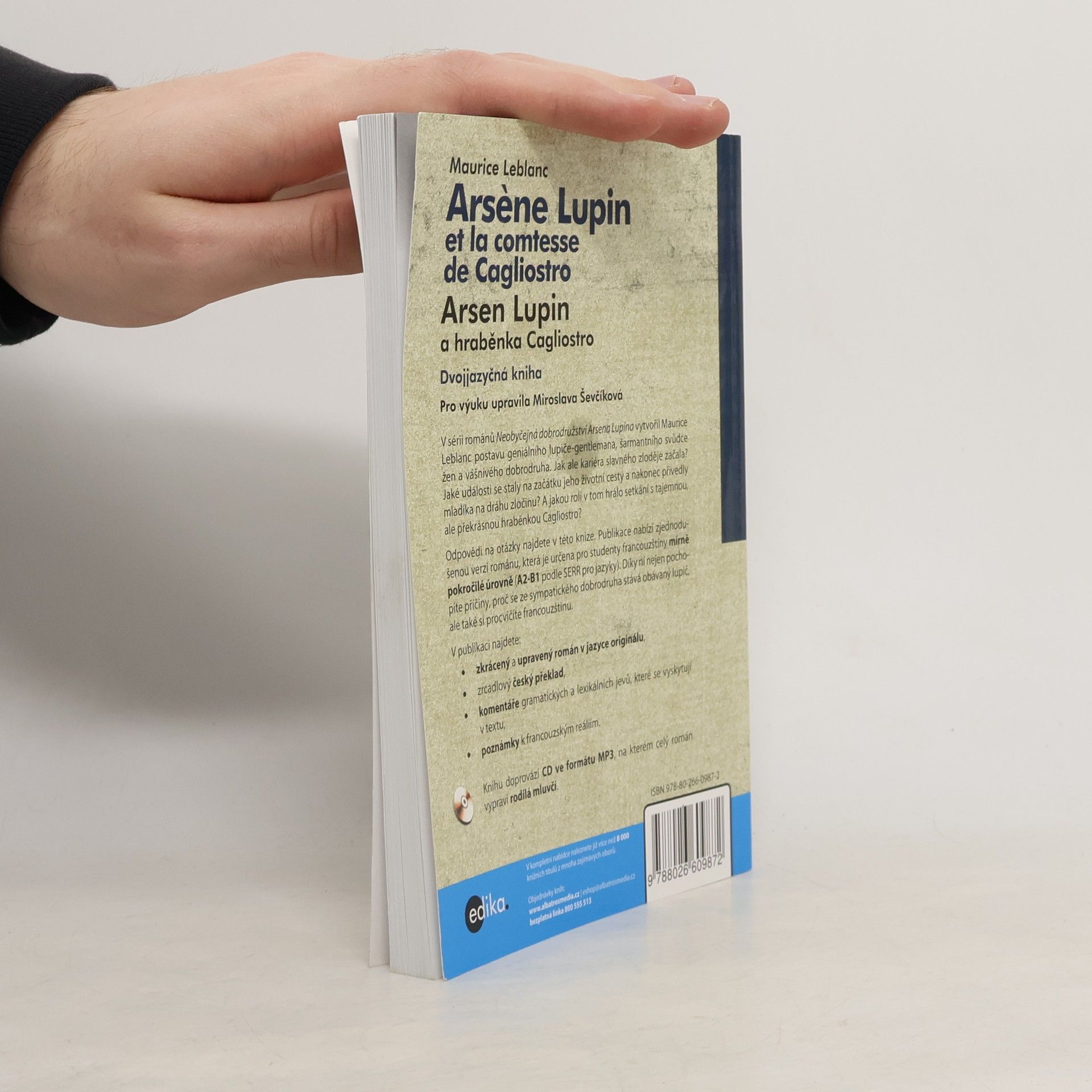 Adaptace díla: Comtesse de Cagliostro / Maurice Leblanc. Román o začátcích slavného lupiče-gentlemana upravený pro výuku! V sérii románů Neobyčejná dobrodružství Arsena Lupina vytvořil Maurice Leblanc postavu geniálního lupiče-gentlemana, šarmantního svůdce žen a vášnivého dobrodruha. Jak ale kariéra slavného zloděje začala? Jaké události se staly na začátku jeho životní cesty a nakonec přivedly mladíka na dráhu zločinu? A jakou roli v tom hrálo setkání s tajemnou, ale překrásnou hraběnkou Cagliostro? Odpovědi na otázky najdete v této knize. Publikace nabízí zjednodušenou verzi románu, která je určena pro studenty francouzštiny mírně pokročilé úrovně (A2-B1 podle SERR pro jazyky). Díky ní nejen pochopíte příčiny, proč se ze sympatického dobrodruha stává obávaný lupič, ale také si procvičíte francouzštinu. V knize najdete: - zkrácený a upravený román v jazyce originálu, - zrcadlový český překlad, - komentáře gramatických a lexikálních jevů, které se vyskytují v textu, - poznámky k francouzským reáliím. Knihu doprovází nahrávka ve formátu MP3, na kterém celý román vypraví rodilá mluvčí.