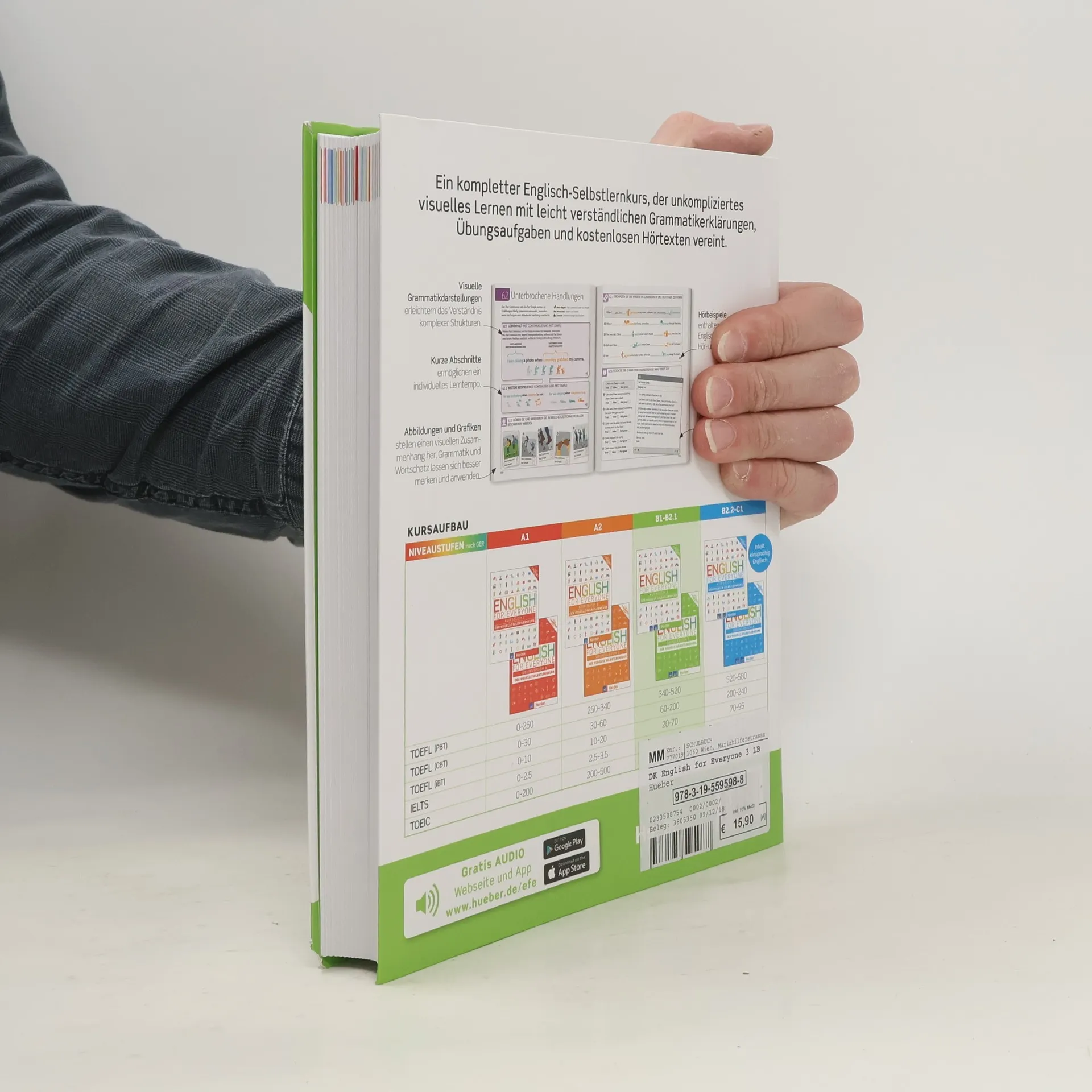 Niveau B1 bis B2/1 Mit dem visuellen Kursbuch für Erwachsene aus der Reihe English for Everyone können Sie sich Englisch ganz leicht selbst beibringen. Sie erlernen Sprachstrukturen, Grammatik und Wortschatz mit sehr anschaulichen Grafiken, Übersichten und Illustrationen. Die kurzen Erklärungen und Übungsanweisungen sind in Deutsch. Alle Hörübungen können Sie ganz einfach per App oder online abspielen. Der Kurs ist auch sehr gut zur Vorbereitung auf die Sprachtests TOEFL, TOEIC und IELTS geeignet.