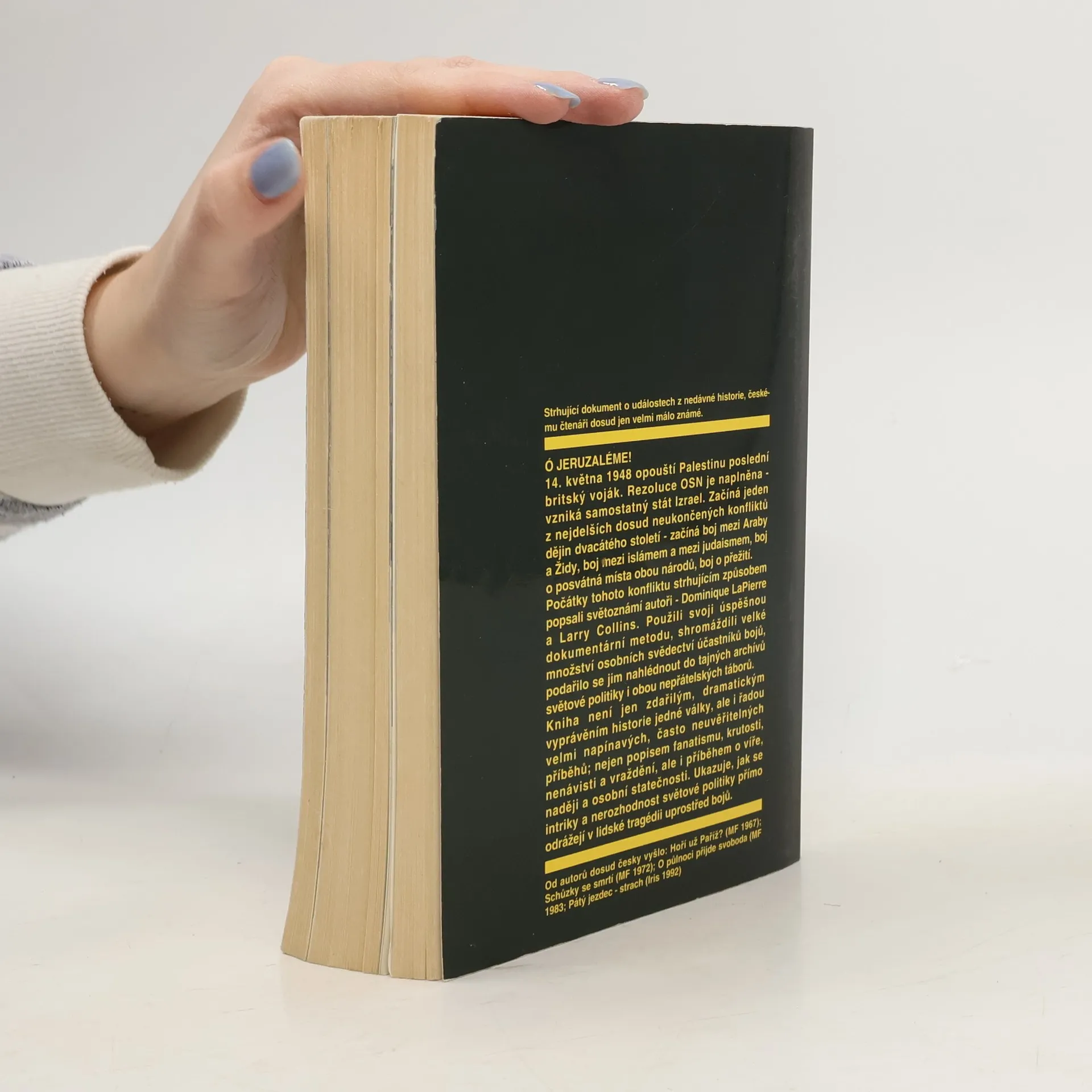 Strhující a dramatický dokument o židovsko-arabské válce z roku 1948, ve které Židé poprvé úspěšně hájili svůj nově vzniklý stát. V listopadu 1947 rozhodla OSN o rozdělení Palestiny na židovský a arabský stát. Tento akt roztočil spirálu násilí, která přerostla v regulérní válku. Světoznámí autoři Larry Collins a Dominique Lapierre rozehrávají strhující drama, které literaturu faktu povýšilo na velký román. Historické události, jejichž tragické důsledky jsou dodnes tématem zpráv, ožívají na stránkách knihy jako v přímém přenosu. Dramatické okamžiky vedoucí ke vzniku židovského státu a krvavý boj za jeho nezávislost nahlížejí skrze mozaiku příběhů a individuálních dramat. Momenty radosti se střídají s momenty smutku, naděje se zoufalstvím, láska s násilím, hrdinství se zbabělostí, vítězství s porážkami… Za jedinečným plastickým portrétem boje o Jeruzalém byly roky práce. Stovky setkání – s králi, premiéry, generály, obyčejnými vojáky, osadníky, teroristy, pekaři… Tisíce prostudovaných dokumentů odhalily dosud nezveřejněné informace. Díky tomu může čtenář nahlédnout do komnat arabských panovníků, do utajených velitelských štábů židovské armády, do válečných zákopů, do synagóg, mešit i kostelů, za stěny bytů i kaváren. Tam všude byli lidé, kteří v onom velkém zápase sehráli svou roli. V zápase, který se pro Židy jevil beznadějný. A přece Izrael dokázal vytrvat. Měl něco, co nepříteli chybělo. Odhodlání.