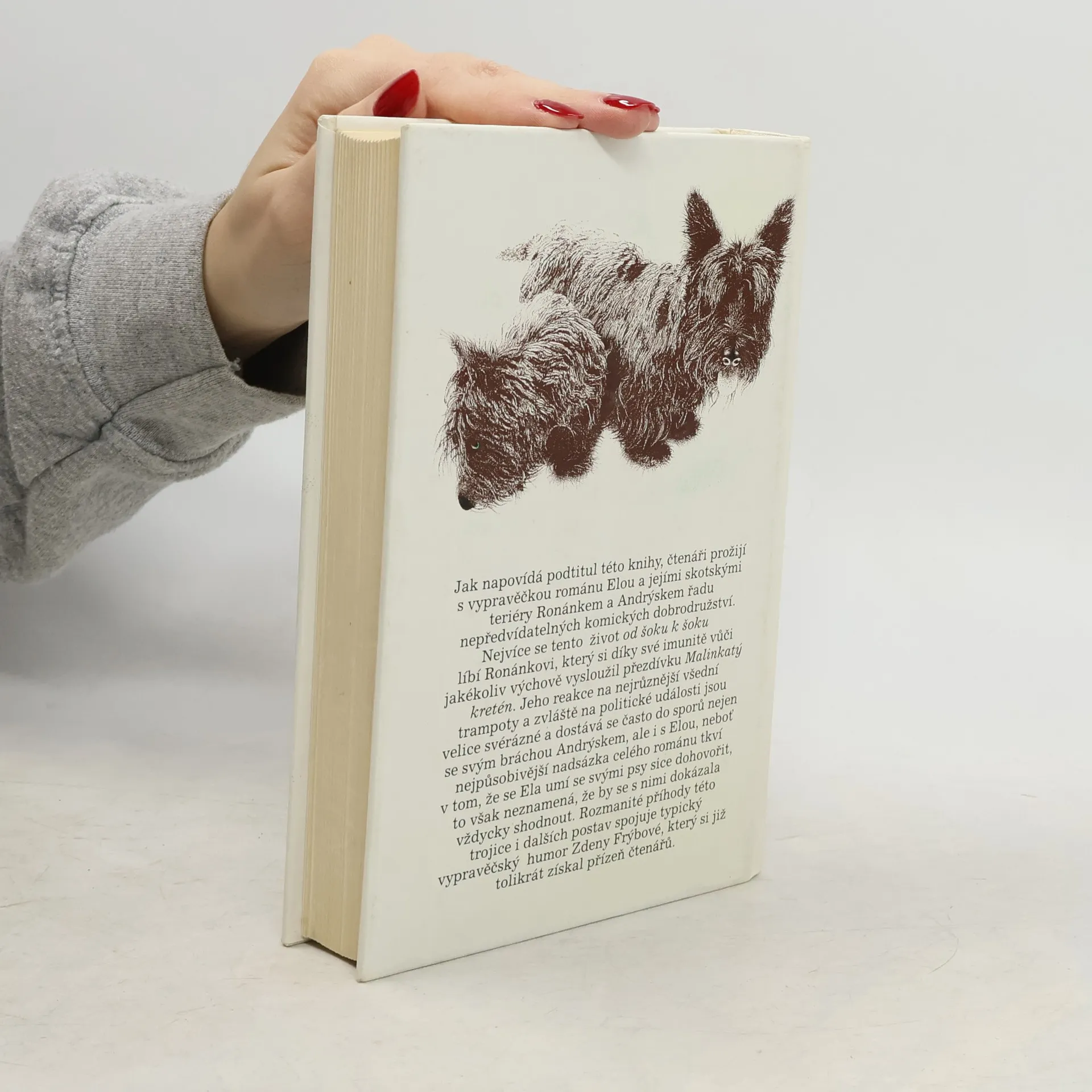 Humoristický román, v němž dva skotští teriéři Andrýsek a Ronánek přesvědčují dámu středního věku, že i po rozvodu může být život báječný a vzrušující. Vypravěčka románu Ela hned v úvodu knihy šokuje svého manžela, když jeho návrh na rozvod přijme s bohorovným klidem a okamžitě si začne plánovat život podle svého. Nečekané maléry, průšvihy a katastrofy, které život přináší, se líbí především Ronánkovi,který se díky své imunitě vůči jakékoliv výchově vysloužil přezdívku Malinkatý kretén.Jeho reakce na různé rodinné a společenské události jsou tak svérázné, že se často poštěká nejen se svým bráchou Andrýskem, ale i s Elou. Nejpůsobivější nadsázka celého románu tkví v tom, že se Ela umí se svými psy sice dohovořit, to však neznamená, že se s nimi shodne. Rozmanité příhody této trojice i dalších postav spojuje typický vypravěčský humor Zdeny Frýbové, který se již tolikrát získal srdce čtenářů.... celý text