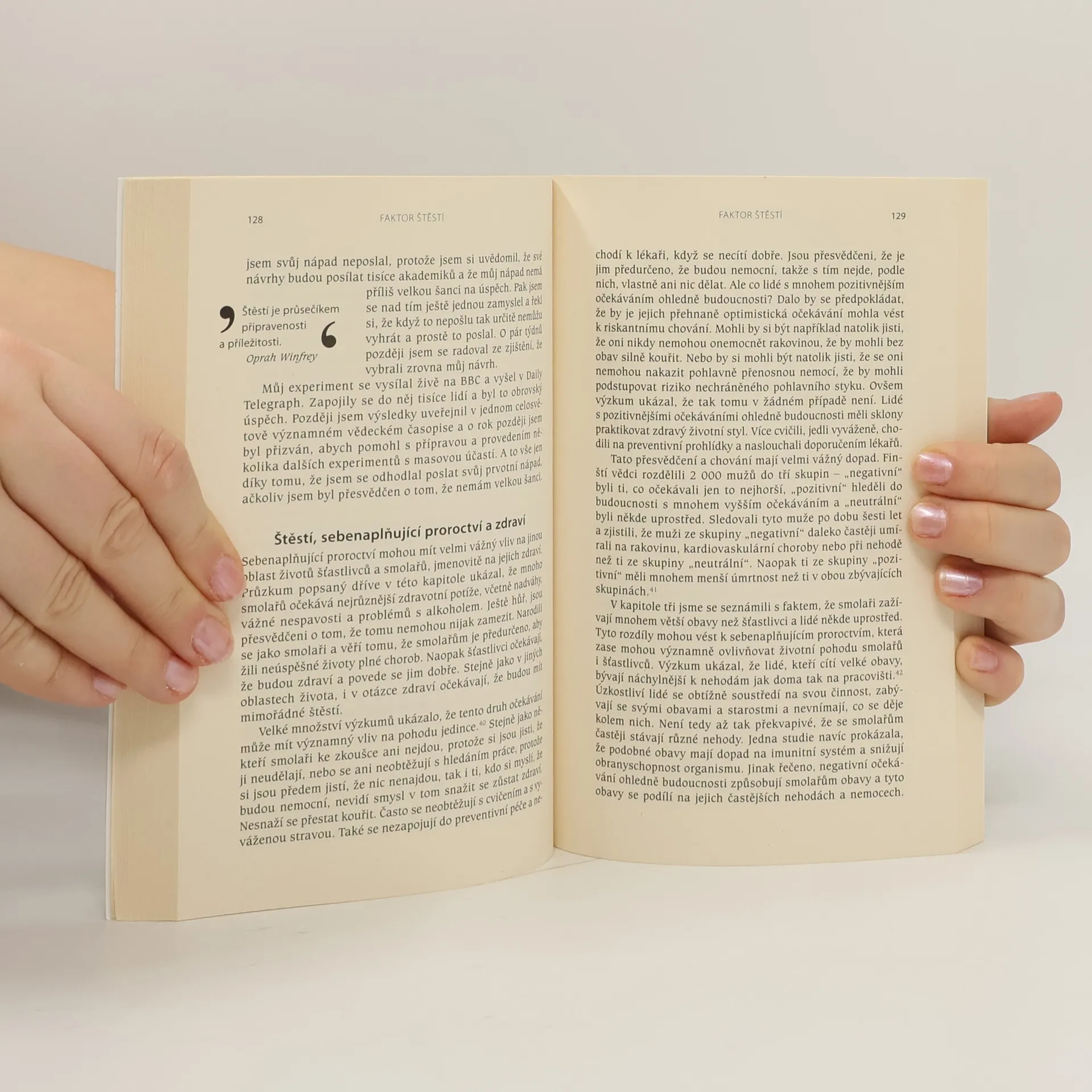 Vědecká studie šťastné mysly Proč jsou někteří lidé úspěšní a šťastní, zatímco život jiných je samý nezdar a smutek? Proč někteří najdou dokonalého partnera, zatímco jiní se potácejí od jednoho vztahu k druhému? Co umožňuje některým lidem vybudovat úspěšnou kariéru, zatímco jiní vykonávají práci, kterou nemají rádi? A může nešťastný člověk udělat něco pro zlepšení svého života? Může si naklonit štěstí na svou stranu? Před dvaceti lety se profesor Richard Wiseman rozhodl zkoumat zdánlivě nepolapitelné faktory štěstí tím, že zaznamenával názory, pocity a zkušenosti šťastných i nešťastných lidí. Výsledkem je radikálně nový způsob nahlížení na štěstí. V této knize Wiseman identifikuje a popisuje čtyři jednoduché behaviorální techniky, které byly vědecky prokázané, jež vám pomohou přilákat štěstí. A dále vám ukáže, jak tyto metody můžete použít doslova k revoluci v každé oblasti vašeho života - včetně vztahů, osobních financí a kariéry.