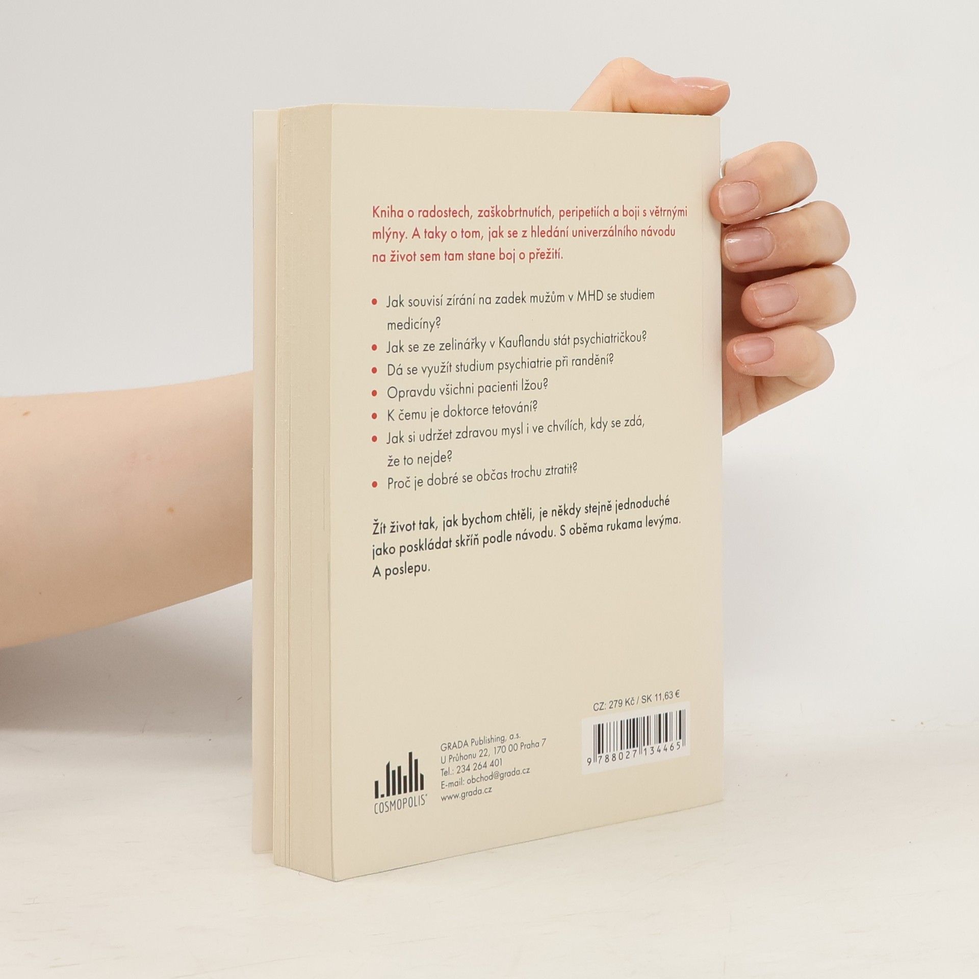 Kniha podle oblíbeného blogu o radostech, zaškobrtnutích, peripetiích a boji s větrnými mlýny. A taky o tom, jak se z hledání univerzálního návodu na život, sem tam stane boj o přežití. - Jak souvisí zírání na zadek mužům v MHD se studiem medicíny? - Jak se ze zelinářky v Kauflandu stát psychiatričkou? - Dá se využít studium psychiatrie při randění? - Opravdu všichni pacienti lžou? - K čemu je doktorce dobré tetování? - Jak si udržet zdravou mysl i ve chvílích, kdy se zdá, že to nejde? - Proč je dobré se občas trochu ztratit? Žít život tak, jak bychom chtěli, je totiž někdy stejně jednoduché jako poskládat skříň podle návodu. S oběma rukama levýma. A poslepu.