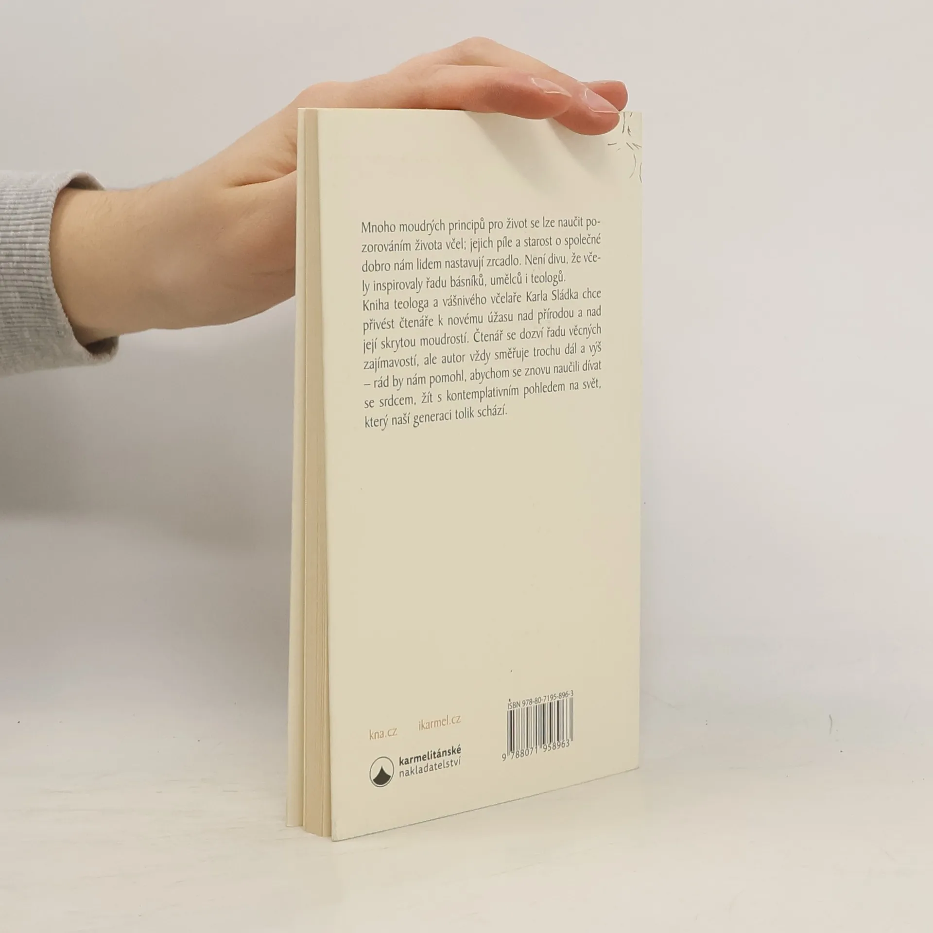 Mnoho moudrých principů pro život se lze naučit pozorováním života včel, jejich píle a starost o společné dobro nám lidem nastavují zrcadlo. Není divu, že včelky inspirovaly řadu básníků, umělců i teologů. Kniha teologa a vášnivého včelaře Karla Sládka chce přivést čtenáře k novému úžasu nad přírodou a v ní skrytou moudrostí. Čtenář se dozví řadu věcných zajímavostí, ale autor vždy směřuje trochu dál a výš – rád by nám pomohl, abychom se znovu naučili dívat se srdcem, žít s kontemplativním pohledem na svět, který naší generaci tolik schází.