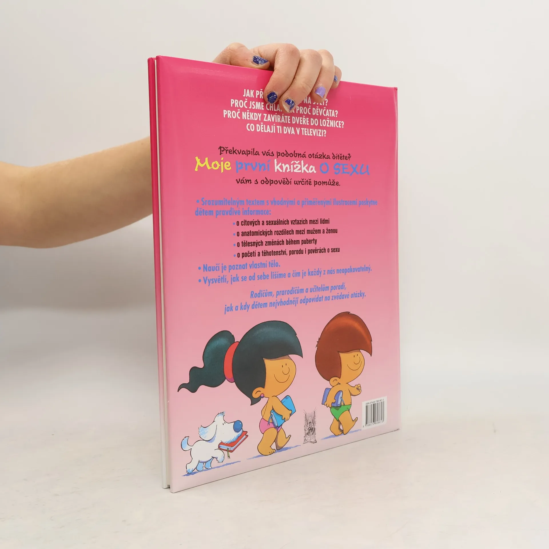 Jak přicházejí děti na svět? Proč jsme chlapci a proč děvčata? Proč někdy zavíráte dveře do ložnice? Co dělají ti dva v televizi? Překvapila vás podobná otázka dítěte? Moje první knížka o sexu vám s odpovědmi určitě pomůže: Srozumitelným textem s vhodnými a přiměřenými ilustracemi poskytne dětem pravdivé informace o citových sexuálních vztazích mezi lidmi, o anatomických rozdílech mezi mužem a ženou, o tělesných změnách během puberty, o početí a těhotenství, porodu i pověrách o sexu. Naučí je poznat vlastní tělo. Vysvětlí, jak se od sebe lišíme a čím je každý z nás neopakovatelný. Rodičům, prarodičům a učitelům poradí, lak a kdy nejvhodněji odpovídat na zvědavé otázky dětí.