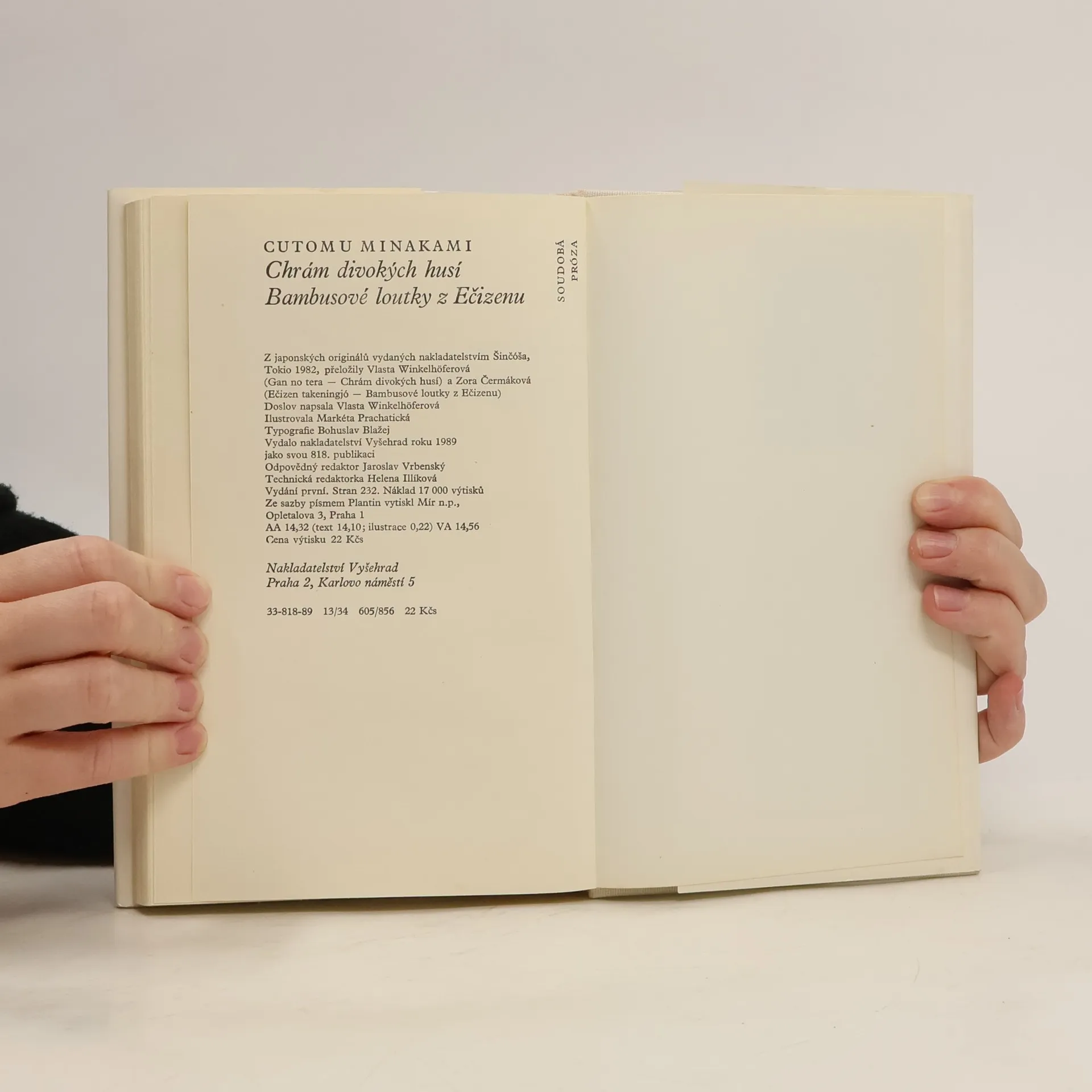 Dvě nejznámější prózy autora Cutomu Minakamiho nás zavádějí do typicky japonského prostředí a odehrávají se ve 20. a 30. letech 20. století. První („Chrám divokých husí“, 1961) je situována do zenového buddhistického chrámu Kohóan ležícího na úpatí hory Kinugasa v severozápadnímpředměstí starobylého Kjóta. Chrám má tři obyvatele – představeného, jeho družku a mladičkého novice Džinena, který je hlavní postavou „Chrámu divokých husí“. Pod zdánlivě klidným tokem života se v tomto místě odehrává drama, které nakonec vyústí v záhadné zmizení představeného. Stejně svěží vypravěčský styl, kterým si Minakami ve své zemi získával miliony čtenářů, je charakteristický i pro „Bambusové loutky z Ečizenu“ (1963), životní a milostný příběh nadaného lidového umělce za zapadlé osady v horské oblasti prefektury Fukui.