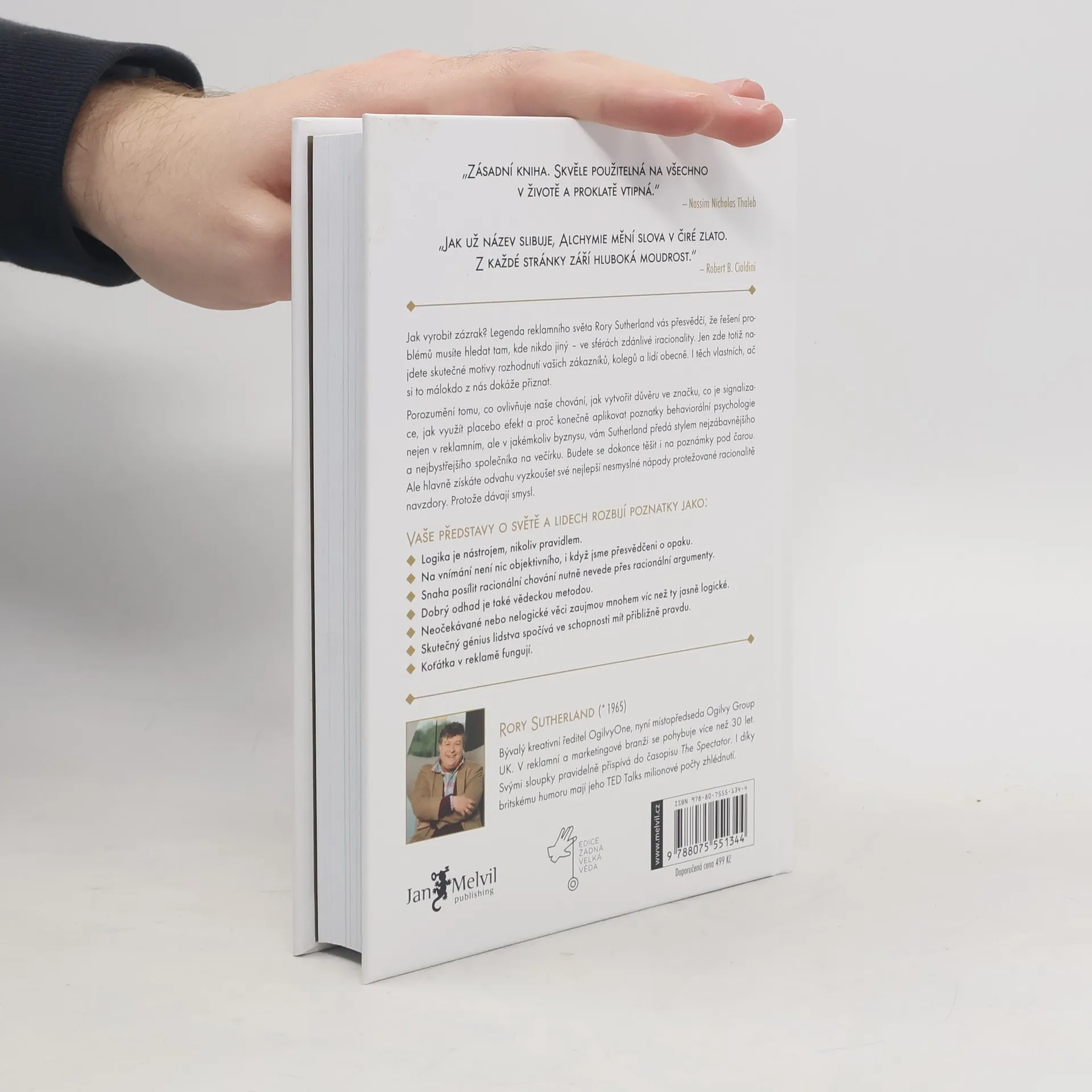 Jak vyrobit zázrak? Legenda reklamního světa Rory Sutherland vás přesvědčí, že řešení problémů musíte hledat tam, kde nikdo jiný – ve sférách zdánlivé iracionality. Jen zde totiž najdete skutečné motivy rozhodnutí vašich zákazníků, kolegů a lidí obecně. I těch vlastních, ač si to málokdo z nás dokáže přiznat. Porozumění tomu, co ovlivňuje naše chování, jak vytvořit důvěru ve značku, co je signalizace, jak využít placebo efekt a proč konečně aplikovat poznatky behaviorální psychologie nejen v reklamním, ale v jakémkoliv byznysu, vám Sutherland předá stylem nejzábavnějšího a nejbystřejšího společníka na večírku. Budete se dokonce těšit i na poznámky pod čarou. Ale hlavně získáte odvahu vyzkoušet své nejlepší nesmyslné nápady protěžované racionalitě navzdory. Protože dávají smysl. Vaše představy o světě a lidech rozbijí poznatky jako: - Logika je nástrojem, nikoliv pravidlem. - Na vnímání není nic objektivního, i když jsme přesvědčeni o opaku. - Snaha posílit racionální chování nutně nevede přes racionální argumenty. - Dobrý odhad je také vědeckou metodou. - Neočekávané nebo nelogické věci zaujmou mnohem víc než ty jasně logické. - Skutečný génius lidstva spočítá ve schopnosti mít přibližně pravdu. - Koťátka v reklamě fungují.