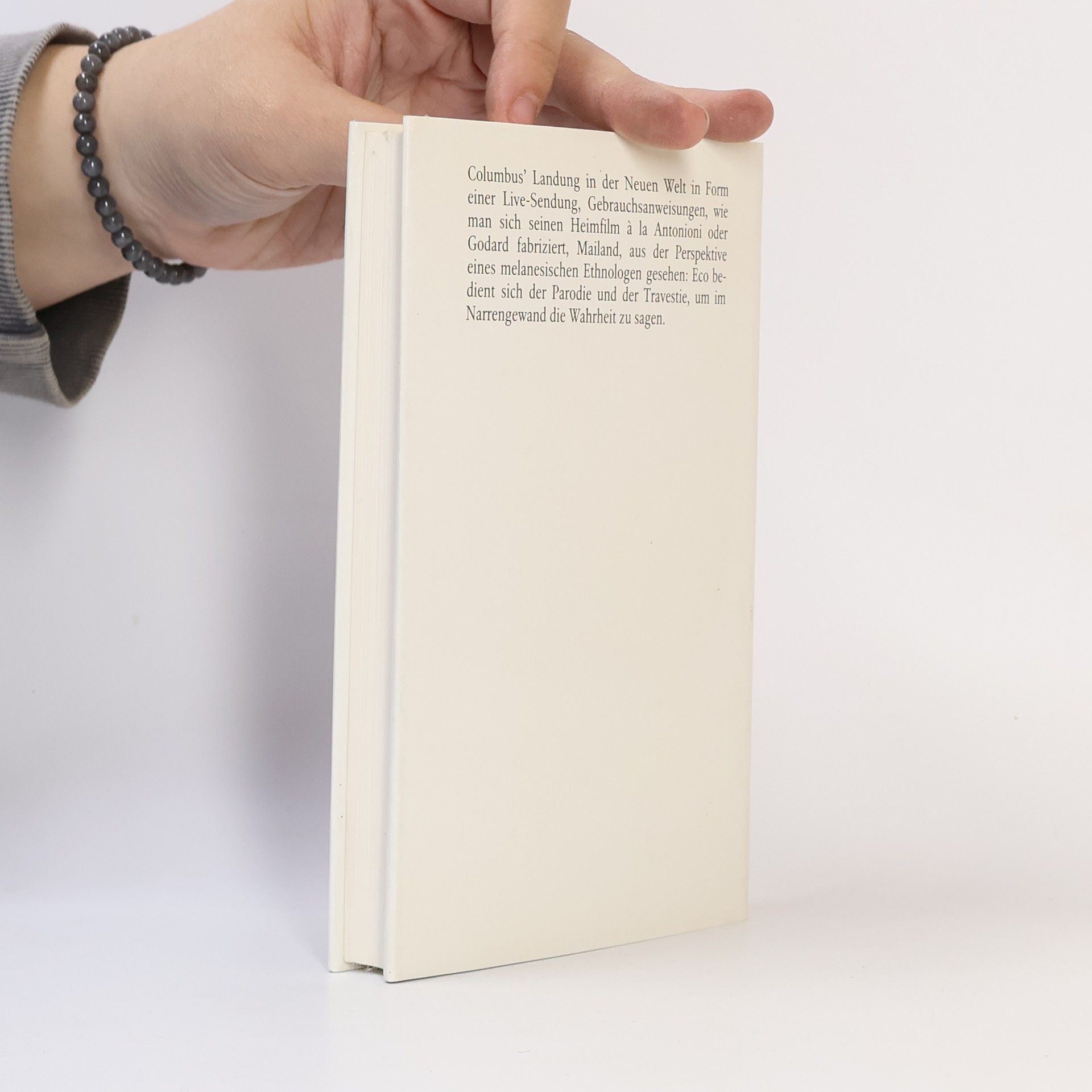 In Italien scheinen nicht nur das Leben und die Liebe problemloser zu sein als anderswo, auch mit der Literatur und der Philosophie tun sich die Italiener leichter. Meisterhaftes Beispiel hierfür sind diese Kabinettstückchen: In einer Parodie auf Nabokovs Lolita liebt ein sehr junger Mann eine Greisin. Per Live-Sendung sind wir dabei, als Columbus die Neue Welt betritt - worüber uns das Fernsehen so berichtet wie seinerzeit über die Landung der Amerikaner auf dem Mond -, und wir werden Zeugen bei der Erfindung des Faustkeils, der, eben erst als nützliches Werkzeug erdacht, sogleich zum Töten benutzt wird. Daneben erfahren wir, wie man als Intellektueller auch dann überlebt, wenn die scheinbar real existierende Lebensgrundlage entfällt. Spätestens hier wird deutlich, daß Parodie und Satire für Eco bei aller Lust am Spott immer auch eine Form des ethischen Engagements sind, nur eben: eine unterhaltsame.