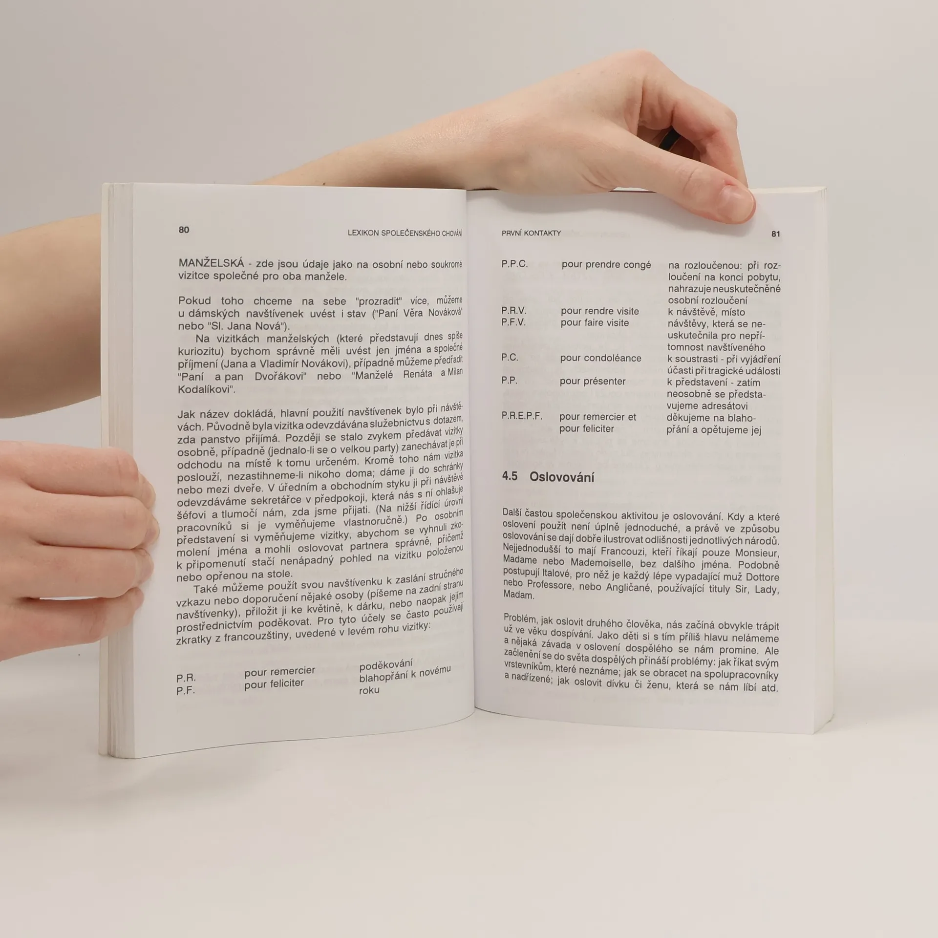 Autor v knížce čtivě a prakticky radí, jak se chovat ve standardních společenských situacích, jako je zdravení, představování, vystupování v zaměstnání, na návštěvě nebo v restauraci, ale i při méně častých příležitostech, např. na firemních večírcích či při pobytu na pláži. Poučíte se o prvních kontaktech mezi lidmi, tykání a vykání, o chování na ulici a v dopravních prostředcích, o pravidlech v oblékání, při cestování a ve volném čase. Dozvíte se prakticky vše o významných rodinných příležitostech, o stolničení, chování při tanci, na recepcích, při kulturních událostech a o ideálním společenském vystupování v mnoha dalších situacích. Kniha je osvědčenou pomůckou při výuce společenského chování a pro mládež, ale především osobním čtivým rádcem pro čtenáře každého věku. Text doplňují vtipné i naučené ilustrace Vladimíra Renčina.... celý text