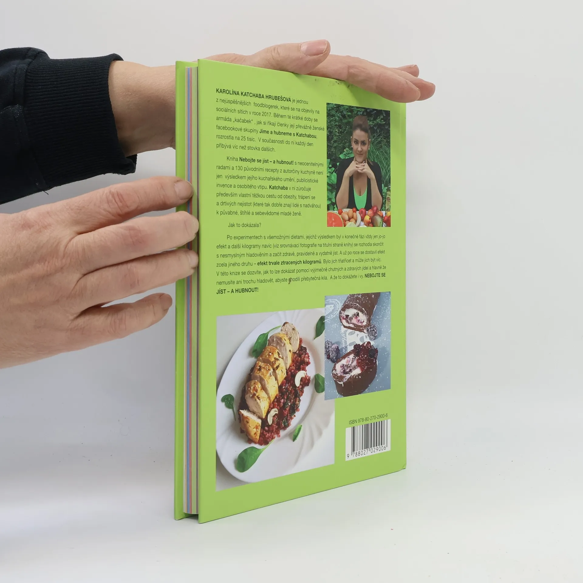 Karolína Katchaba Hrubešová je jednou z nejúspěšnějších foodblogerek, které se objevily na sociálních sítích za poslední rok. Během té krátké doby se armáda „kačabek“, jak si říkají členky její převážně ženské facebookové skupiny Jíme a hubneme s Katchabou, rozrostla na 24 tisíc. V současnosti do ní každý den přibývá víc než stovka dalších. Kniha Nebojte se jíst – a hubnout! s neocenitelnými radami a 130 původními recepty z autorčiny kuchyně není jen výsledkem jejího kuchařského umění, publicistické invence a osobitého vtipu. Katchaba v ní zúročuje především vlastní těžkou cestu od obezity, trápení se a drtivých nejistot (které tak dobře znají lidé s nadváhou) k půvabné, štíhlé a sebevědomé mladé ženě. Jak to dokázala? Po experimentech s všemožnými dietami, jejichž výsledkem byl v konečné fázi vždy jen jo-jo efekt a další kilogramy navíc (viz srovnávací fotografie na titulní straně knihy) se rozhodla skončit s nesmyslným hladověním a začít zdravě, pravidelně a vydatně jíst. A už po roce se dostavil efekt zcela jiného druhu – efekt trvale ztracených kilogramů. Bylo jich třiatřicet a může jich být víc. V této knize se dozvíte, jak to lze dokázat pomocí výjimečně chutných a zdravých jídel a hlavně že nemusíte ani trochu hladovět, abyste shodili přebytečná kila. A že to dokážete i vy. NEBOJTE SE JÍST – A HUBNOUT!