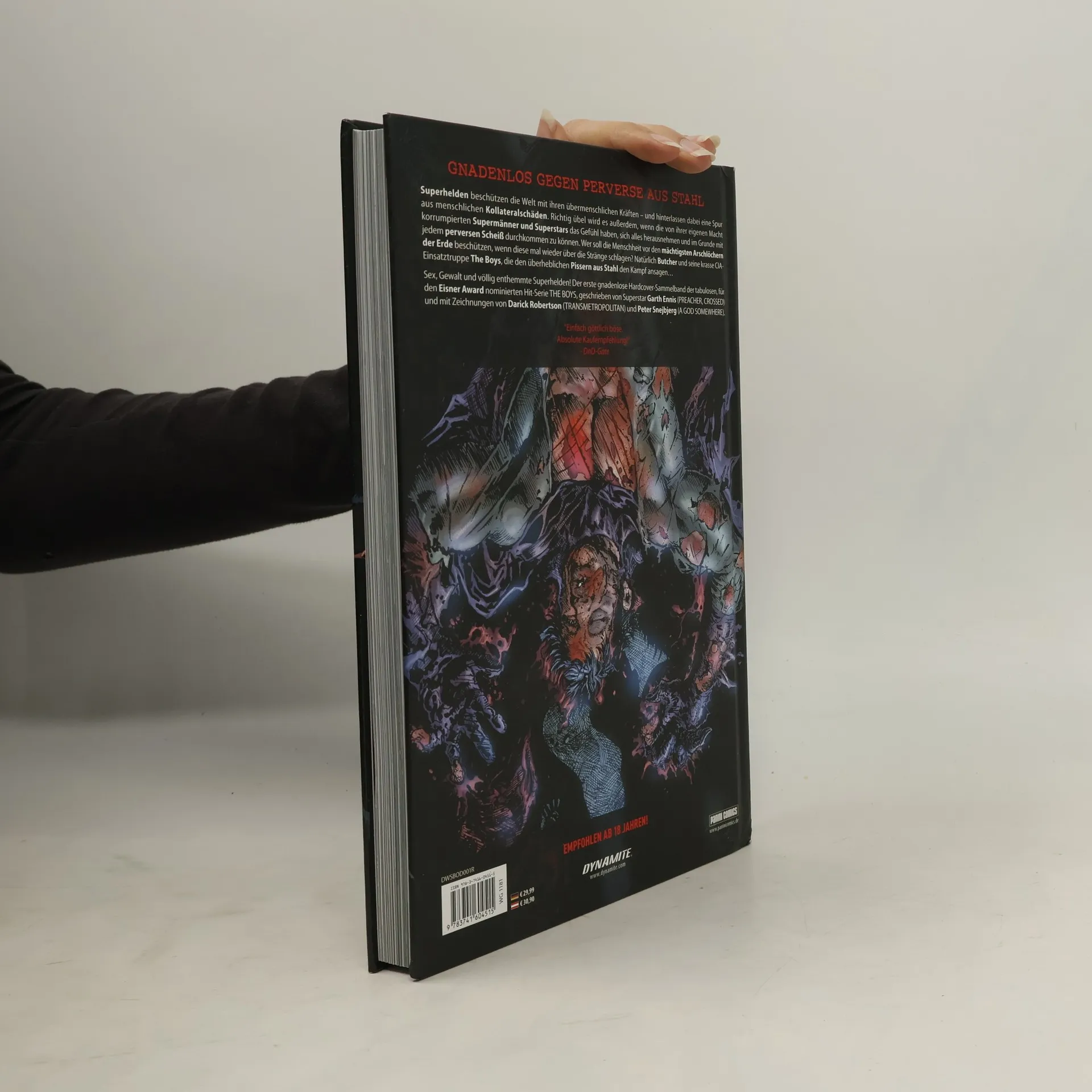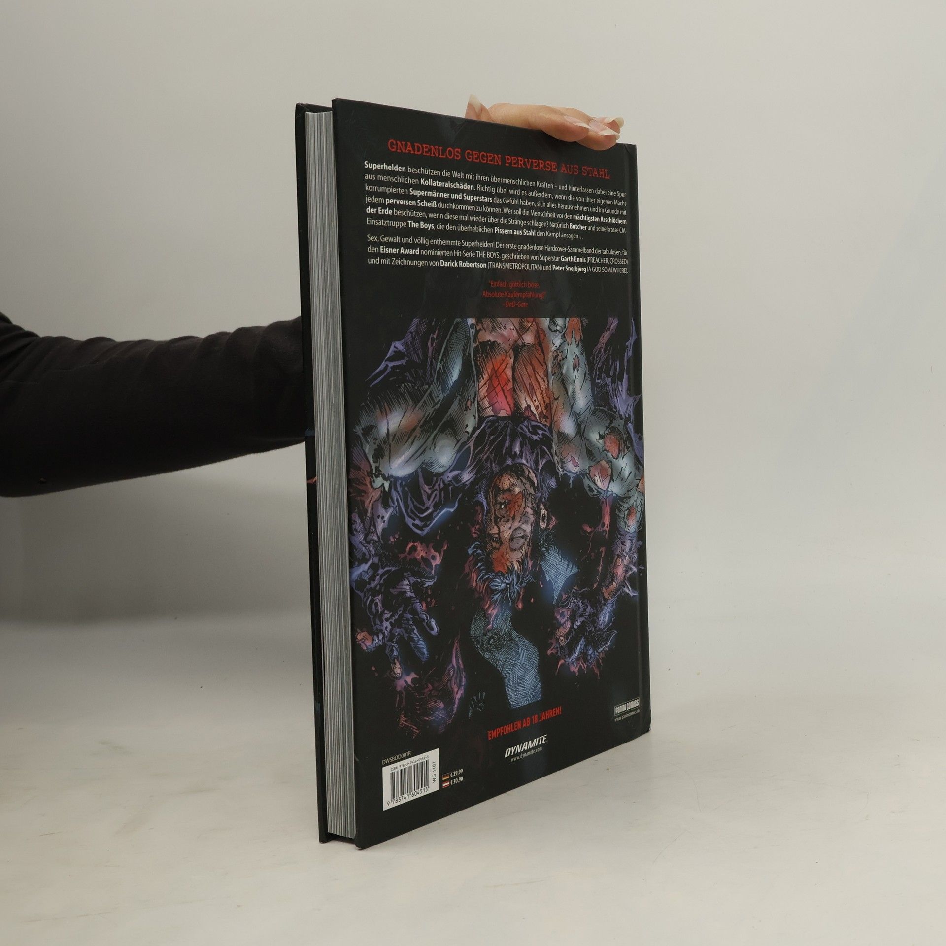 GNADENLOS GEGEN PERVERSE AUS STAHL Superhelden beschützen die Welt mit ihren übermenschlichen Kräften - und hinterlassen dabei eine Spur aus menschlichen Kollateralschäden. Richtig übel wird es außerdem, wenn die von ihrer eigenen Macht korrumpierten Supermänner und Superstars das Gefühl haben, sich alles herausnehmen und im Grunde mit jedem perversen Scheiß durchkommen zu können. Wer soll die Menschheit vor den mächtigsten Arschlöchern der Erde beschützen, wenn diese mal wieder über die Stränge schlagen? Natürlich Butcher und seine krasse CIA-Einsatztruppe The Boys, die den überheblichen Pissern aus Stahl den Kampf ansagen... Sex, Gewalt und völlig enthemmte Superhelden! Der erste gnadenlose Hardcover-Sammelband der tabulosen, für den Eisner Award nominierten Hit-Serie THE BOYS, geschrieben von Superstar Garth Ennis (PREACHER, CROSSED) und mit Zeichnungen von Darick Robertson (TRANSMETROPOLITAN) und Peter Snejbjerg (A GOD SOMEWHERE).