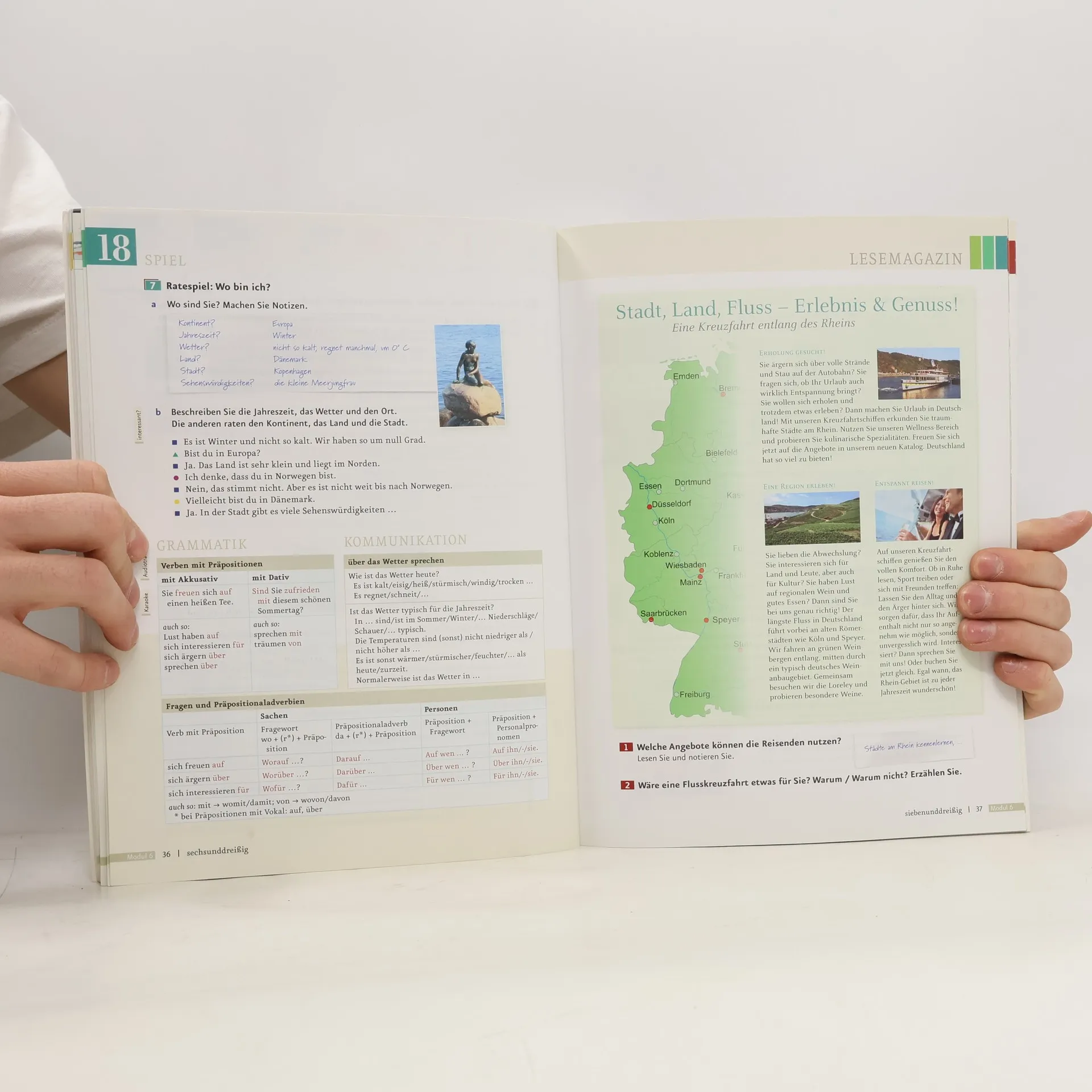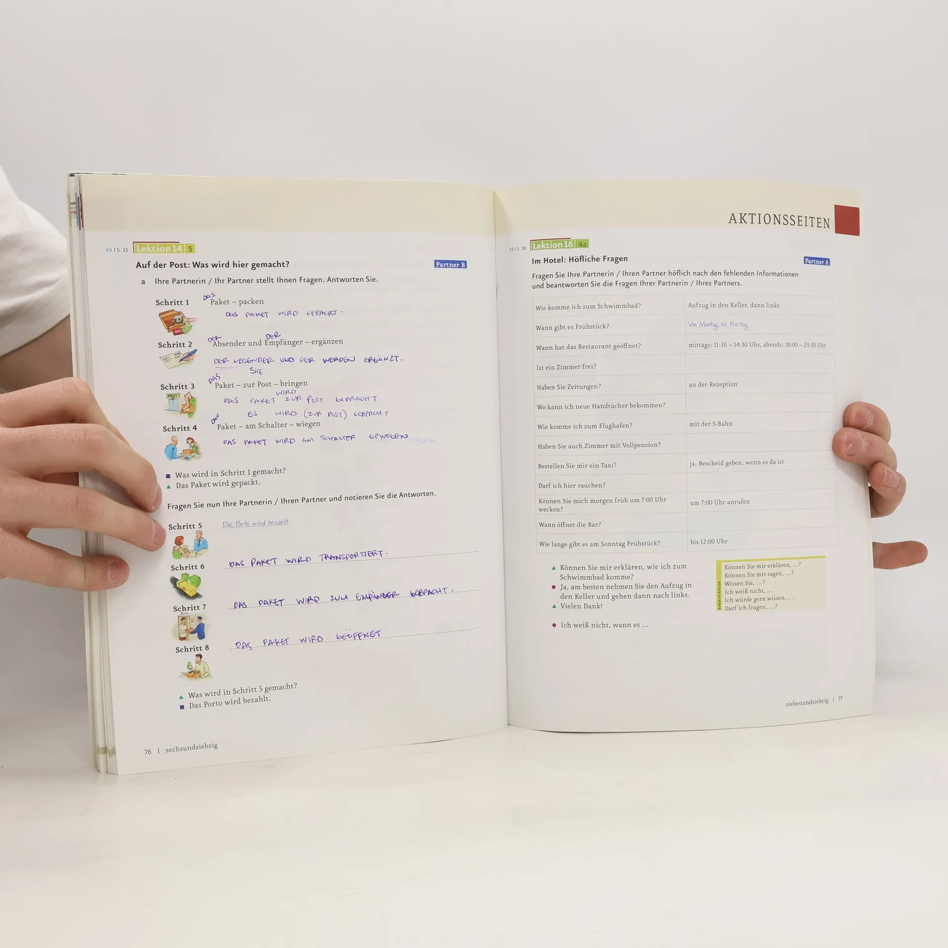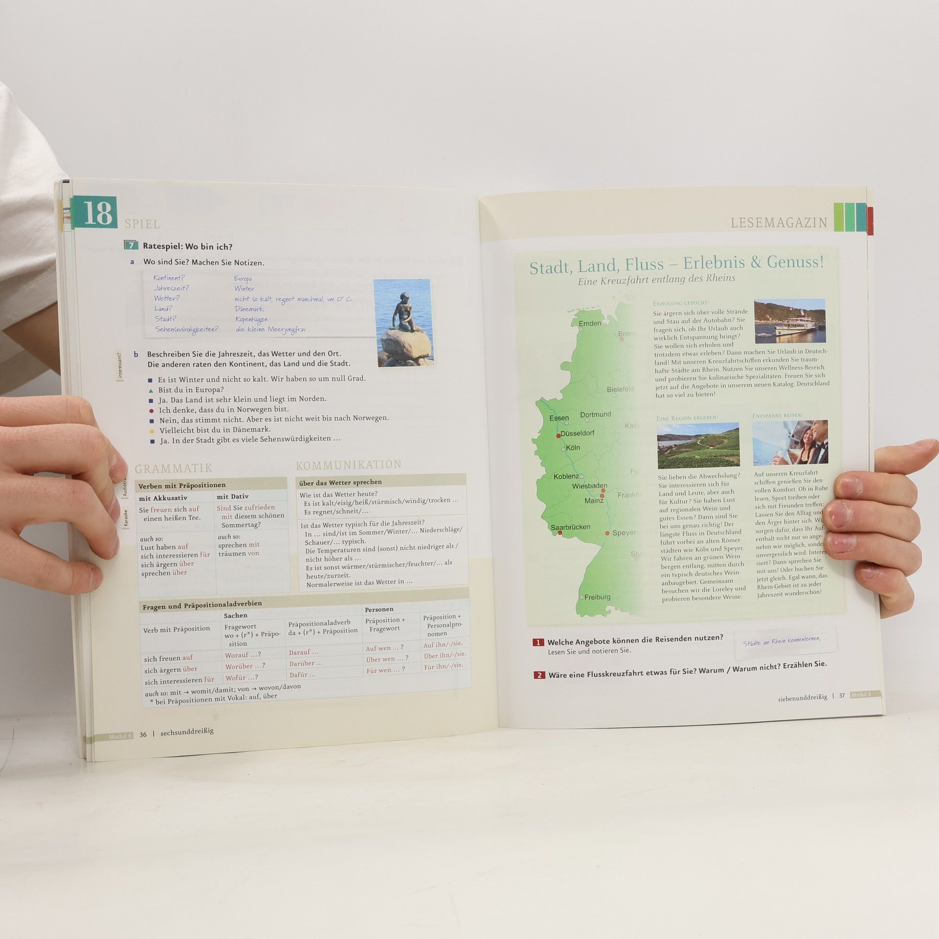 Zielniveau A2/2 - Die Lektionen bestehen aus je vier Seiten und folgen einem klaren, wiederkehrenden Aufbau. Jede Lektion beginnt mit einer interessanten Einstiegssituation, oft kombiniert mit einem Hörtext, die die Thematik einführt und Emotionen weckt. Auf der nächsten Doppelseite werden die neuen Wortfelder, Strukturen und Redemittel anhand authentischer Lese- und Hörtexte eingeführt und geübt. Das neue Wortfeld wird in der Kopfzeile als Bildlexikon präsentiert, um die Merkfähigkeit zu unterstützen. Die Abschlussseite bietet Schreibtraining, Sprechtraining oder Mini-Projekte, die den Lektionsstoff aufgreifen und die wichtigen Wendungen übersichtlich zusammenfassen. Ein Update zur Behebung des Problems steht unter https://go.hueber.de/aktuell bereit.