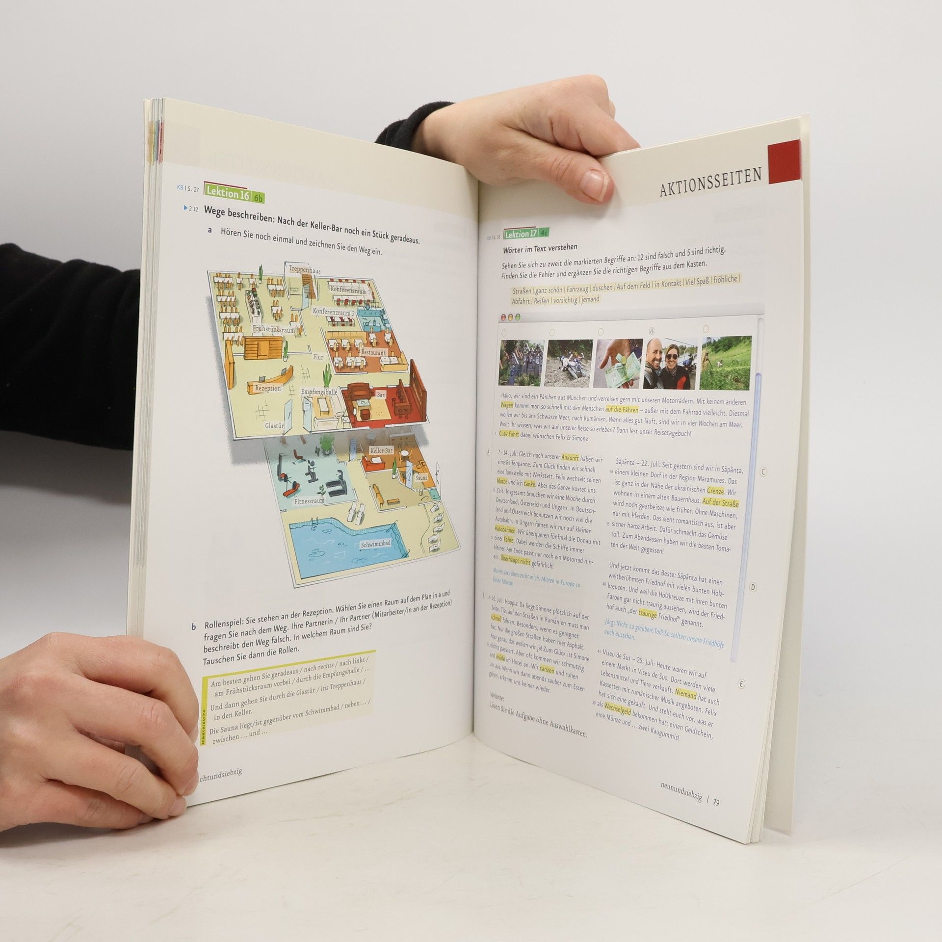 Zielniveau A2/2 - Die Lektionen bestehen aus je vier Seiten und folgen einem klaren, wiederkehrenden Aufbau. Jede Lektion beginnt mit einer interessanten Einstiegssituation, oft kombiniert mit einem Hörtext, die die Thematik einführt und Emotionen weckt. Auf der nächsten Doppelseite werden die neuen Wortfelder, Strukturen und Redemittel anhand authentischer Lese- und Hörtexte eingeführt und geübt. Das neue Wortfeld wird in der Kopfzeile als Bildlexikon präsentiert, um die Merkfähigkeit zu unterstützen. Die Abschlussseite bietet Schreibtraining, Sprechtraining oder Mini-Projekte, die den Lektionsstoff aufgreifen und die wichtigen Wendungen übersichtlich zusammenfassen. Ein Update zur Behebung des Problems steht unter https://go.hueber.de/aktuell bereit.