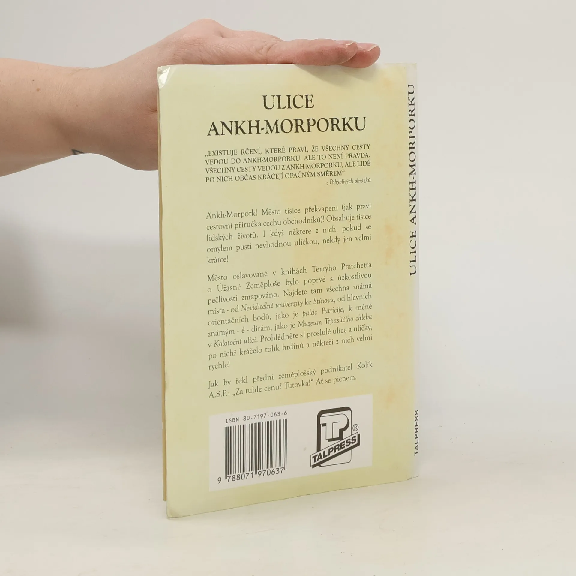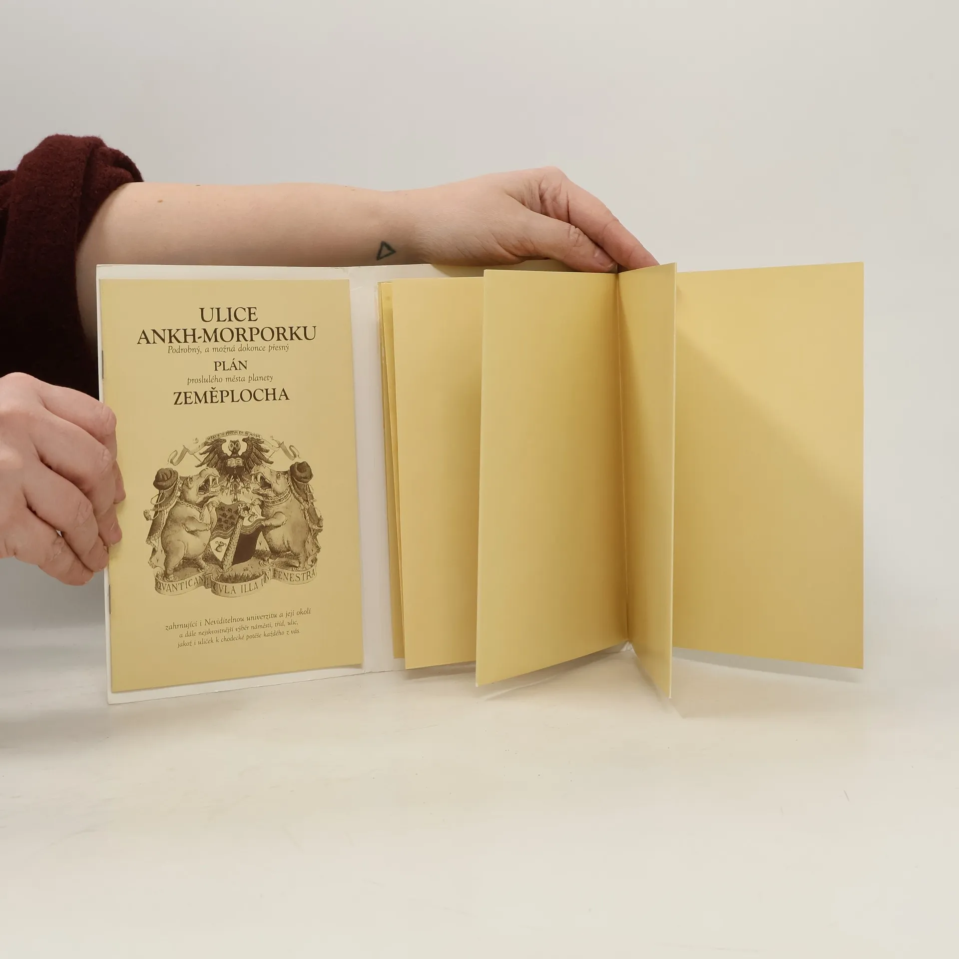 Říkali, že je to neproveditelné. Nuže, my jsme to provedli, a tak jim znovu dokázali, že se mýlili. Po mnoha letech podrobných výzkumů, mazaně uskutečněných ve stejném počtu minut, má Zeměplocha konečně svoji mapu. Obsahuje i popis zaznamenaných a historicky doložených expedic nejproslulejších zeměplošských cestovatelů a objevitelů, jako byli: generál sir Roderick O´Mezeney, Lars Larssynovec, Chalamanda Jones, lady Alice Trouffallová, Pasák z Quirmu a samozřejmě i Břichoš Jura zvaný Omrza. Jejich cesty měly pro Zeměplochu osudový (i když častěji spíše osudný) význam. Ti kdož cestují kruhovým světem, tady mají všechno jako na dlani: od Klače k horám Beraní hlavy, od Cori Celesti ke Kruhovému moři, od Genovy po Brmbrmduc. Velká města jako Pseudopolis, Al Kali a samozřejmě Ankh-Morpork jsou umístěna s neskonalou pěčí a láskou na mapě tohoto světa, který na svém krunýři unáší vesmírem Velká A´Tuin.