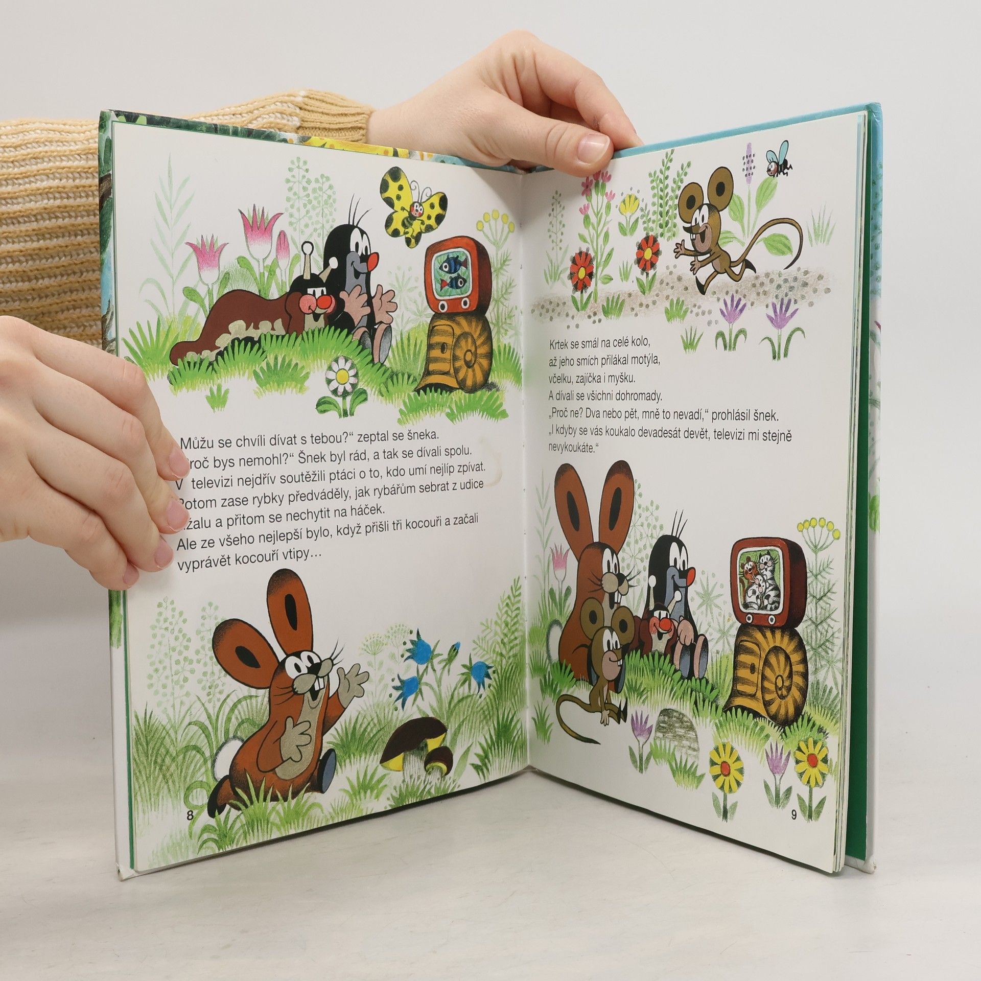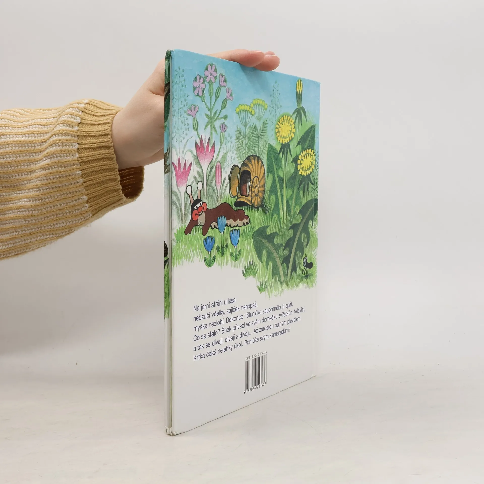 Na jarní stráni u lesa nebzučí včelky, zajíček nehopsá, myška nezlobí. Dokonce i Sluníčko zapomělo jít spát. Co se stalo? Šnek přivezl ve svém domečku zvířátkům televizi, a tak se dívají, dívají a dívají... Až zarostou bujným plevelem. Krtka čeká nelehký úkol. Pomůže svým kamarádům?