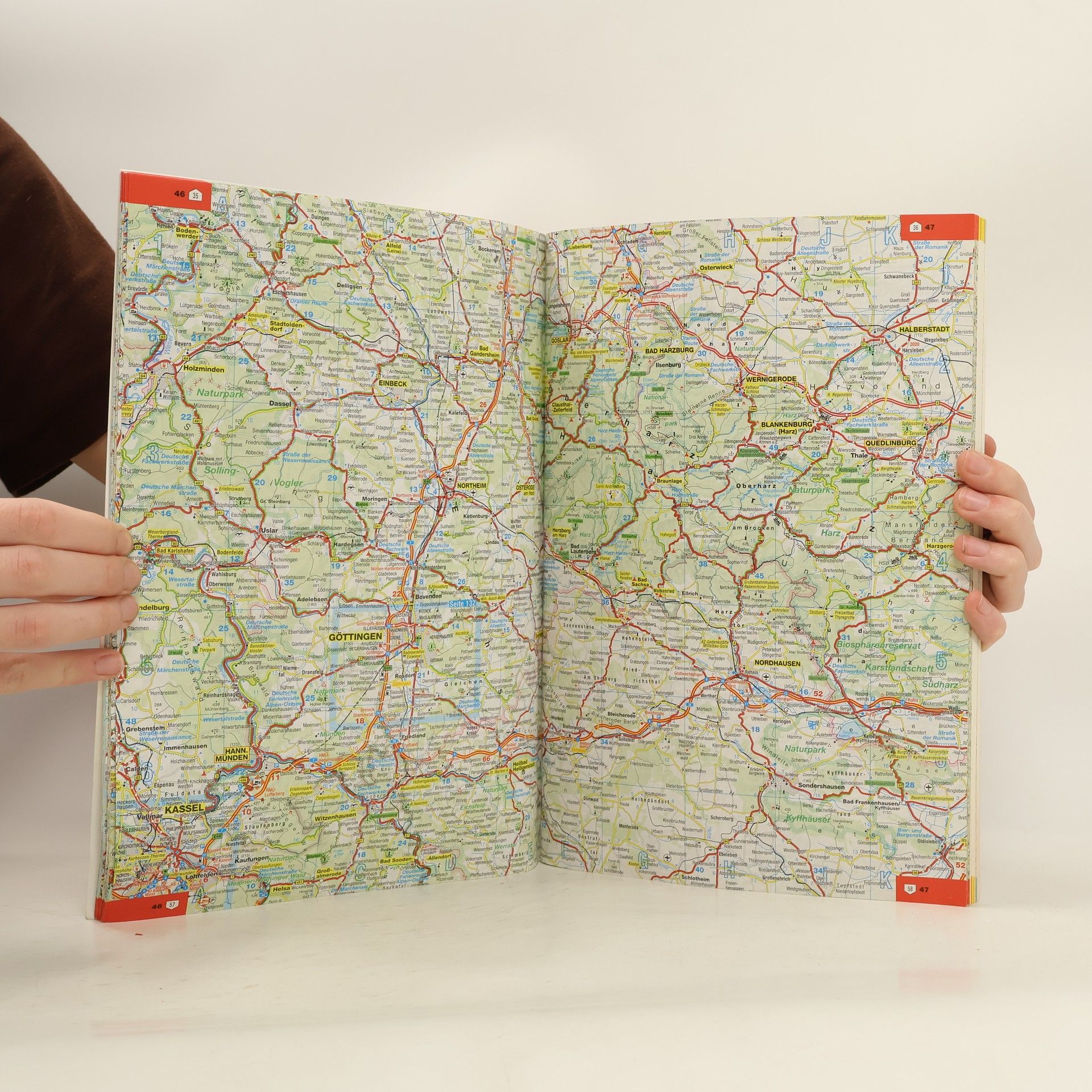Der Kartenteil: Deutschland 1:300 000 mit Zeichenerklärung (D, GB, F) und Blattübersicht/ Fernfahrtenkarte Deutschland/ 46 Citypläne 1:20 000 mit Straßenverzeichnis und Zufahrtskarten 1:100 000: - Aachen - Augsburg - Berlin - Bielefeld - Bonn - Braunschweig - Bremen - Chemnitz - Dortmund - Duisburg - Düsseldorf - Dresden - Erfurt - Essen - Frankfurt am Main - Freiburg im Breisgau - Göttingen - Hamburg - Hannover - Karlsruhe - Kassel - Kiel - Koblenz - Köln - Leipzig - Ludwigshafen - Lübeck - Magdeburg - Mainz - Mannheim - München - Münster - Nürnberg - Osnabrück - Paderborn - Potsdam - Regensburg - Rostock - Saarbrücken - Schwerin - Stuttgart - Trier - Ulm - Weimar - Wiesbaden - Würzburg Kartenteil für Fahrten in die Alpen 1:750 000 mit Legende/ Kartenteil Europa 1:4.500.000 mit Legende Der Service: Alpenpässe und -tunnel/ Ortsregister der selbstständigen Städte und Gemeinden in Deutschland/ Deutsche Kraftfahrzeug-Kennzeichen/ Entfernungstabelle Deuschland und Europa
