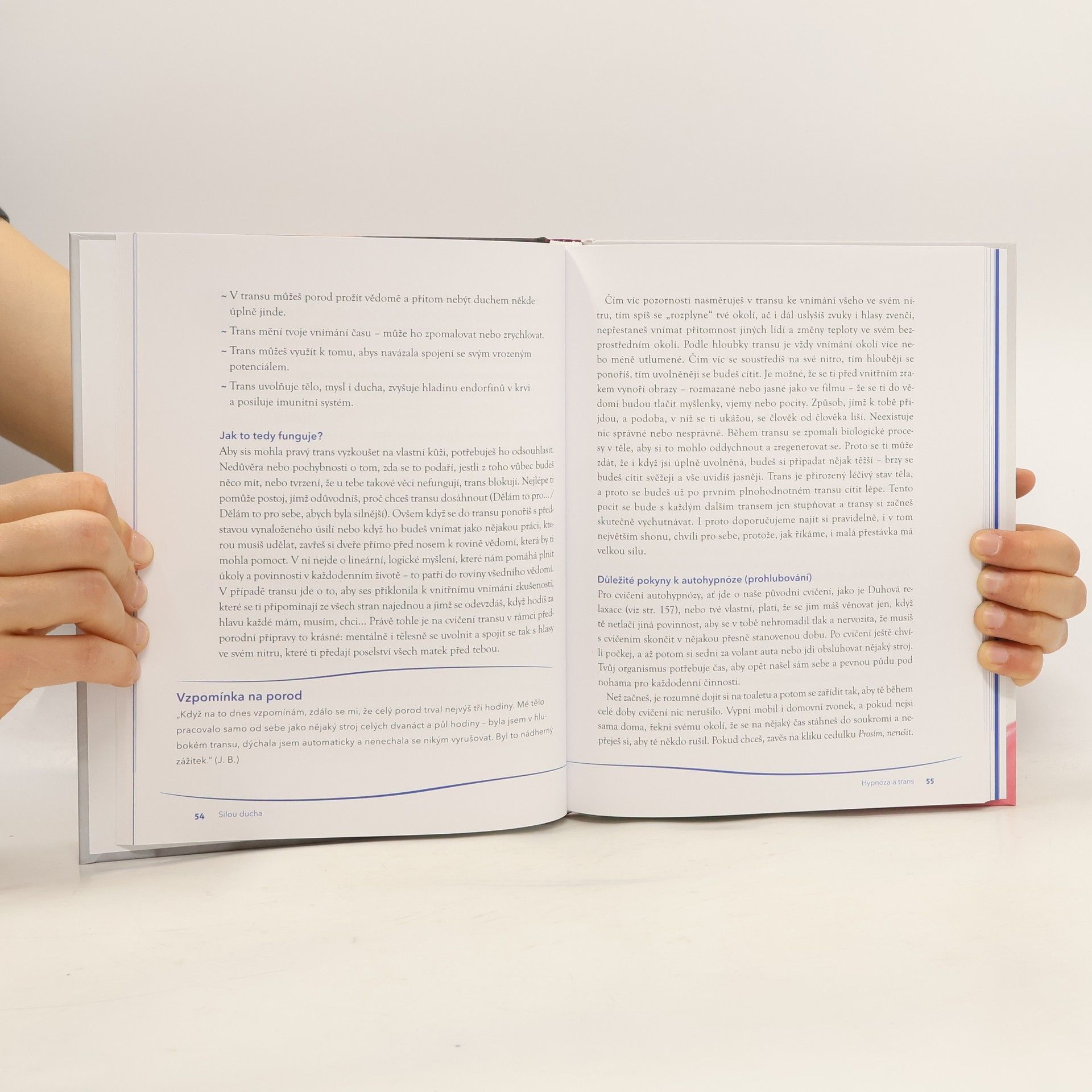 Česká republika patří k zemím, kde se většina žen porodu bojí. Často nemají jiné přání, než ho mít rychle za sebou. To první, co většinu dnešních žen v souvislosti s porodem napadá, je vědomí rizika a hrůza z bolesti. Autorka neprosazuje hypnoporody za přítomnosti odborného hypnotizéra, nýbrž vede každou jednu ženu ke schopnosti autohypnózy. Nejde tu o nic víc než o nejhlubší uvolnění, relaxaci, vnoření se do vlastního těla za současného odpojení racionálního vnímání, které umí spolehlivě zastavit jak orgasmus, tak spontánní porodní proces. Možná s autorkou nebudeme ve všem souhlasit, přesto připomíná podstatné. Těhotným a rodícím ženám skrytou moudrost a sílu jejich těl a těm, kdo o nastávající matky pečují, důležitost respektu a empatie.
