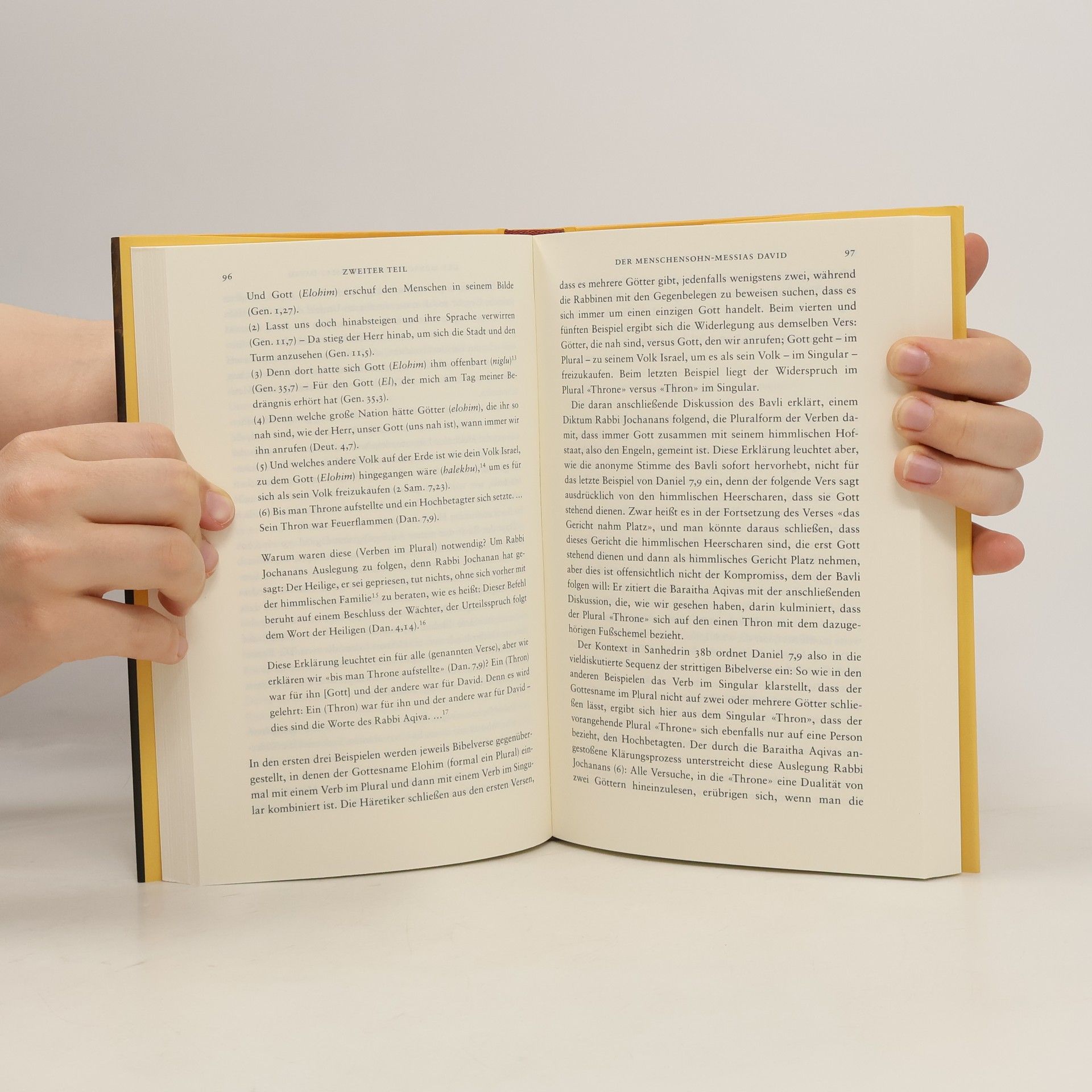 EINFÜHRUNG: EIN GOTT? ERSTER TEIL: DAS JUDENTUM DES ZWEITEN TEMPELS Der Menschensohn in der Vision Daniels Die personifi zierte Weisheit in der Weisheitsliteratur Der vergöttlichte Mensch im Selbstverherrlichungshymnus aus Qumran Der Sohn Gottes und Sohn des Höchsten im Daniel- Apokryphon aus Qumran Der Menschensohn Henoch in den Bilderreden des Äthiopischen Henochbuchs Der Menschensohn-Messias im 4. Buch Esra Der Erstgeborene im Gebet des Joseph Der Logos bei Philo von Alexandria ÜBERLEITUNG: VOM VORCHRISTLICHEN ZUM NACHCHRISTLICHEN JUDENTUM ZWEITER TEIL: DAS JUDENTUM DER RABBINEN UND DER FRÜHEN JÜDISCHEN MYSTIK Der Menschensohn im Midrasch Der Menschensohn-Messias David Babylonischer Talmud David-Apokalypse Ephrem der Syrer und Johannes Chrysostomus Vom Menschen Henoch zum Kleinen Gott Metatron Der biblische Henoch in Genesis 5 Die außerbiblische Überlieferung in den drei Henochbüchern Die Degradierung Henochs durch die Rabbinen Die Rezeption Henochs im Christentum Henoch wird Metatron Metatron und der Häretiker Elischa ben Avujah / Acher Akatriel ist Metatron und Gott Die Polemik des Talmuds gegen Metatron SCHLUSS: ZWEI GÖTTER ANHANG Abkürzungen Anmerkungen Literatur Register der Personen und Sachen Stellenverzeichnis