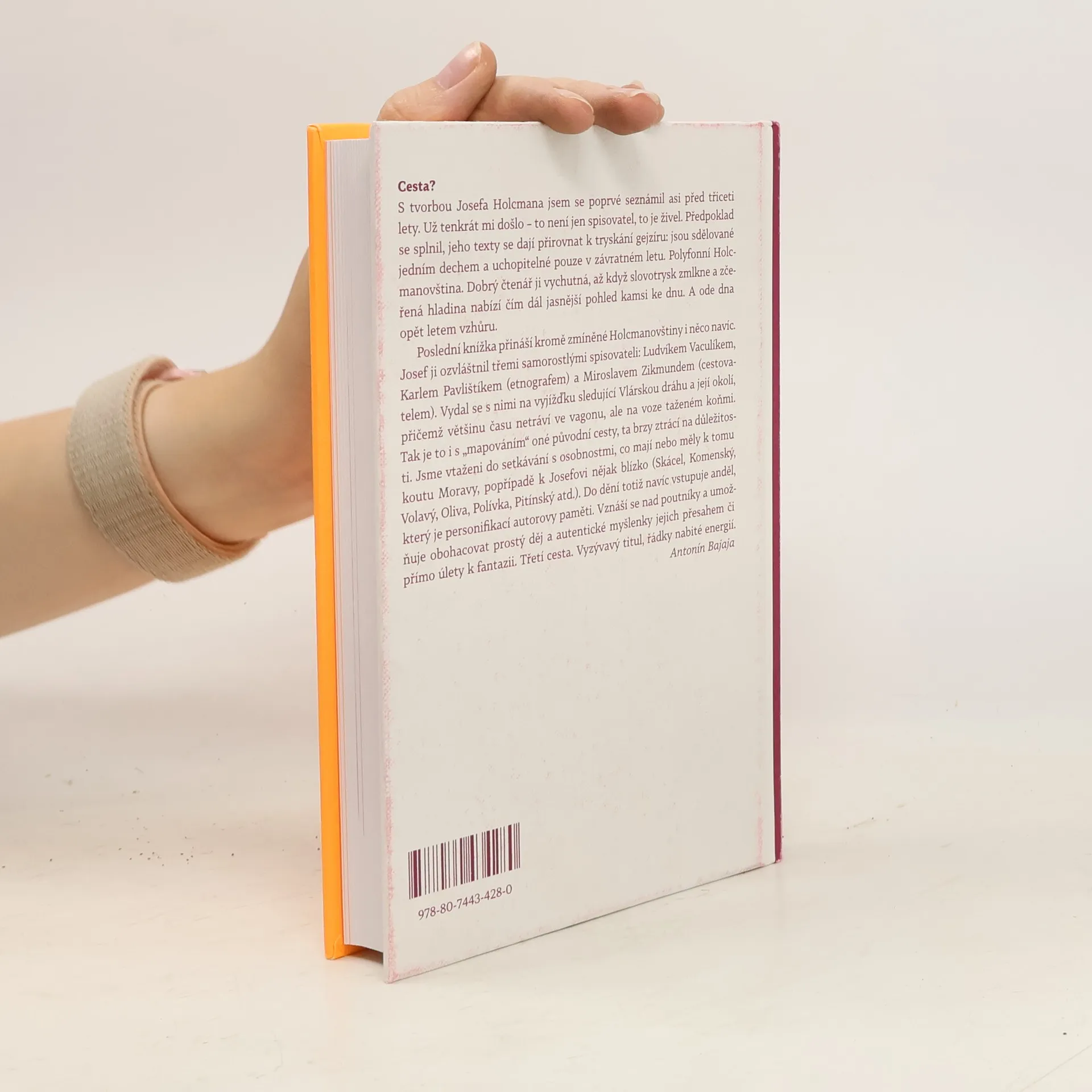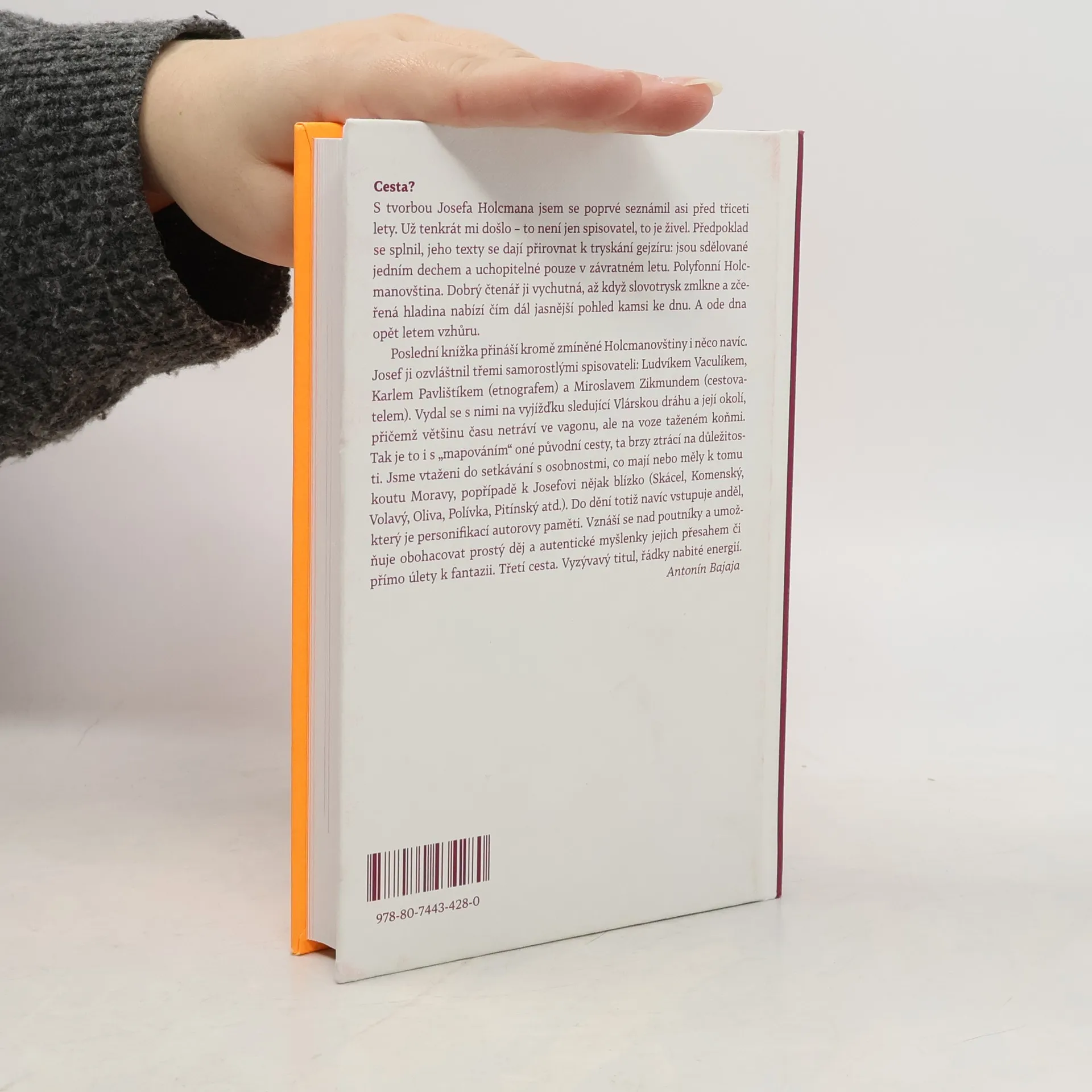 S tvorbou Josefa Holcmana jsem se poprvé seznámil asi před třiceti lety. Už tenkrát mi došlo – to není jen spisovatel, to je živel. Předpoklad se splnil, jeho texty se dají přirovnat k tryskání gejzíru: jsou sdělované jedním dechem a uchopitelné pouze v závratném letu. Polyfonní Holcmanovština. Dobrý čtenář ji vychutná, až když slovotrysk zmlkne a zčeřená hladina nabízí čím dál jasnější pohled kamsi ke dnu. A ode dna opět letem vzhůru. Poslední knížka přináší kromě zmíněné Holcmanovštiny i něco navíc. Josef ji ozvláštnil třemi samorostlými spisovateli: Ludvíkem Vaculíkem, Karlem Pavlištíkem (etnografem) a Miroslavem Zikmundem (cestovatelem). Vydal se s nimi na vyjížďku sledující Vlárskou dráhu a její okolí, přičemž většinu času netráví ve vagonu, ale na voze taženém koňmi. Tak je to i s „mapováním“ oné původní cesty, ta brzy ztrácí na důležitosti. Jsme vtaženi do setkávání s osobnostmi, co mají nebo měly k tomu koutu Moravy popřípadě k Josefovi nějak blízko (Skácel, Komenský, Volavý, Oliva, Pitínský, Polívka, Pivečka atd.). Do dění totiž navíc vstupuje Anděl, který je personifikací autorovy paměti. Vznáší se nad poutníky a umožňuje obohacovat prostý děj a autentické myšlenky jejich přesahem či přímo úlety k fantazii. Třetí cesta. Vyzývavý titul, řádky nabité energií. Antonín Bajaja