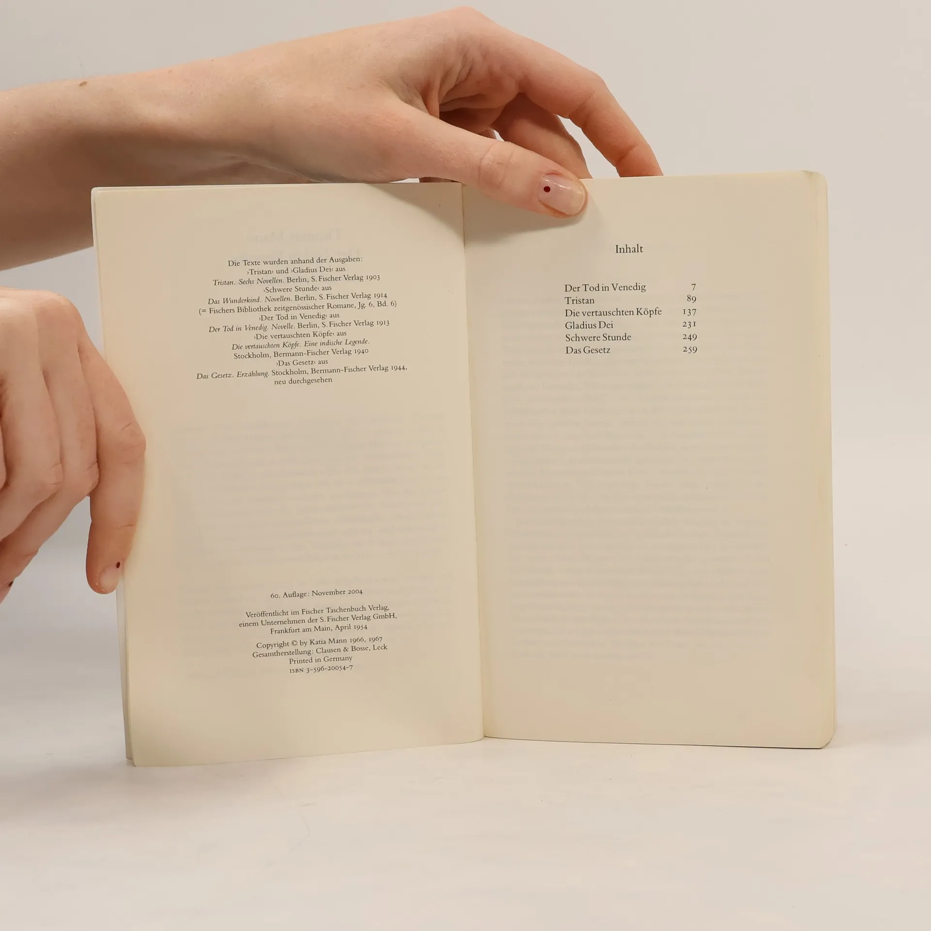 Novellen und Erzählungen begleiten das Schaffen Thomas Manns von den ersten Anfängen an. Ob er nun im 'Tod in Venedig' eine moderne Variation des ewigen Themas des platonischen Eros gibt; ob er den Leser mit den 'Vertauschten Köpfen' in die indische Märchenwelt oder mit dem 'Gesetz' in die Zeit des Propheten Moses führt; ob er in 'Schwere Stunde' ein knappes Portrait Schillers zeichnet, in 'Gladius Dei' die Atmosphäre Münchens um die Jahrhundertwende beschwört oder im 'Tristan' von dem wunderlichen Schriftsteller Detlev Spinell erzählt: „Immer ist er mittendrin ganz und gar, und seine leidenschaftliche Versenkung in den Vorgang, die Person, die Seelenlage, sie zieht uns hinein und läßt uns nicht los.“ (Erich Kahler)