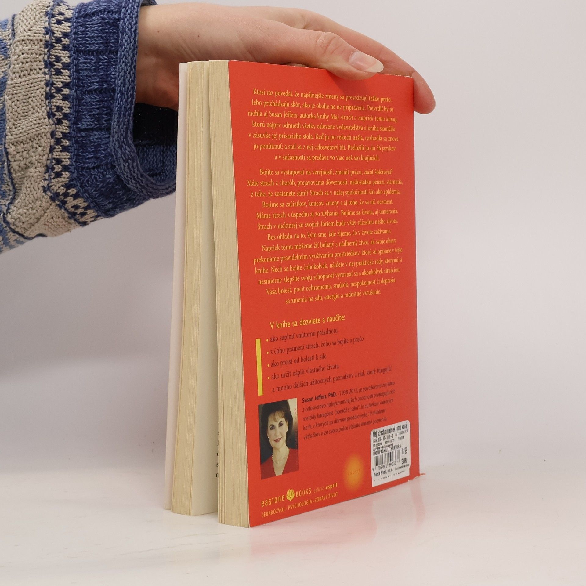 Praktický návod, ako premeniť strach a obavy na energiu a radosť. Ktosi raz povedal, že najsilnejšie zmeny sa presadzujú ťažko preto, lebo prichádzajú skôr, ako je okolie na ne pripravené. Potvrdiť by to mohla aj Susan Jeffers, autorka knihy Maj strach a napriek tomu konaj, ktorú najprv odmietli všetky oslovené vydavateľstvá a kniha skončila v zásuvke jej prísacieho stola. Keď ju po rokoch našla, rozhodla sa znova ju ponúknuť; a stal sa z nej celosvetový hit. Preložili ju do 36 jazykov a v súčasnosti sa predáva vo viac než sto krajinách. Bojíte sa vystupovať na verejnosti, zmeniť prácu, začať šoférovať? Máte strach z chorôb, prejavovania dôverností, nedostatku peňazí, starnutia, z toho, že zostanete sami? Strach v niektorej zo svojich foriem bude vždy súčasťou nášho života. Napriek tomu môžeme žiť bohatý a nádherný život, ak svoje obavy prekonáme pravidelným využívaním prostriedkov, ktoré sú opísané v tejto knihe. Nech sa bojíte čohokoľvek, nájdete v nej praktické rady, ktorými si nesmierne zlepšíte svoju schopnosť vyrovnať sa s akoukoľvek situáciou. Vaša bolesť, pocit ochromenia, smútok, nespokojnosť či depresia sa zmenia na silu, energiu a radostné vzrušenie.